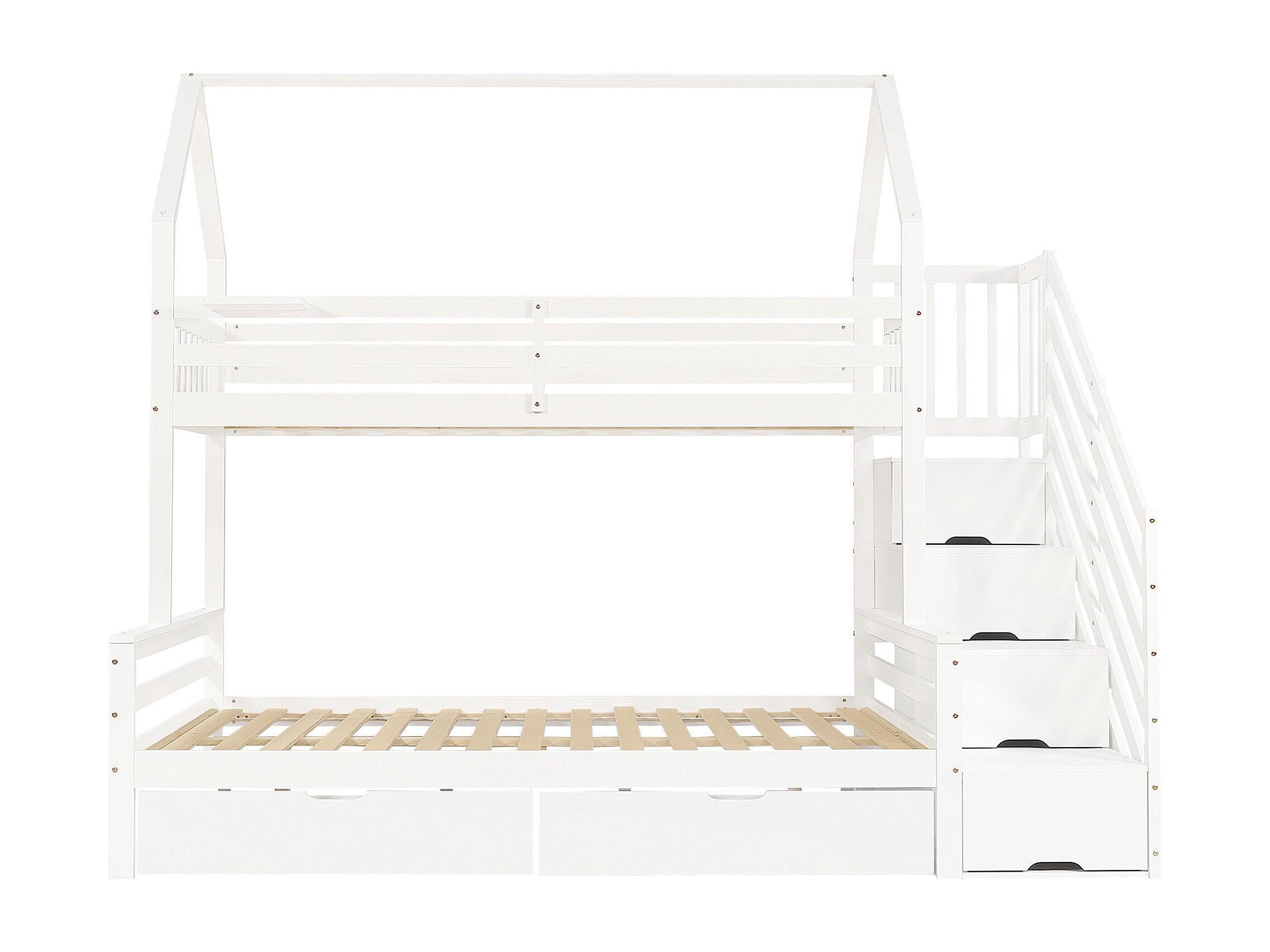 Fabriqué en bois de pin et MDF de haute qualité, le lit est durable et stable, garantissant une utilisation à long terme. Il y a un ensemble de pieds de support au milieu du lit inférieur et quatre magnifiques garde-corps sur le lit supérieur pour assurer la sécurité et la stabilité.