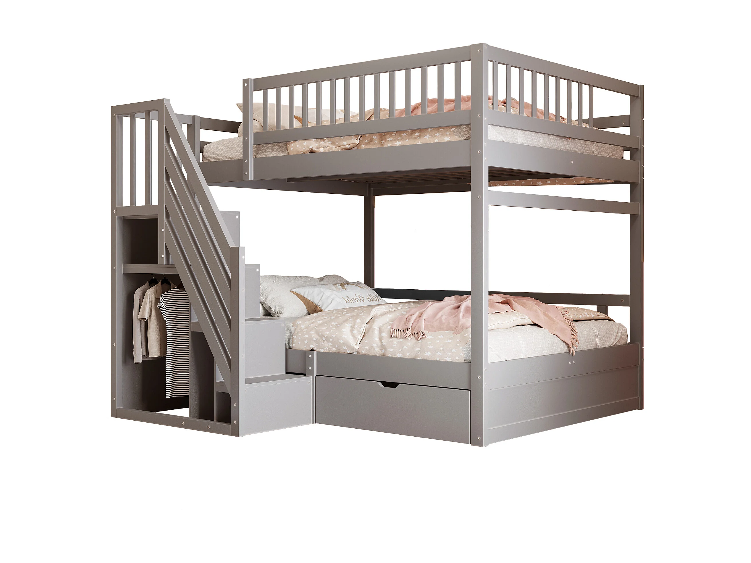 Lit superposé en bois massif 140x200 cm avec garde-corps élevé, échelle de sécurité avec rangement, tiroirs de rangement, gris (205x145x173.5 cm)