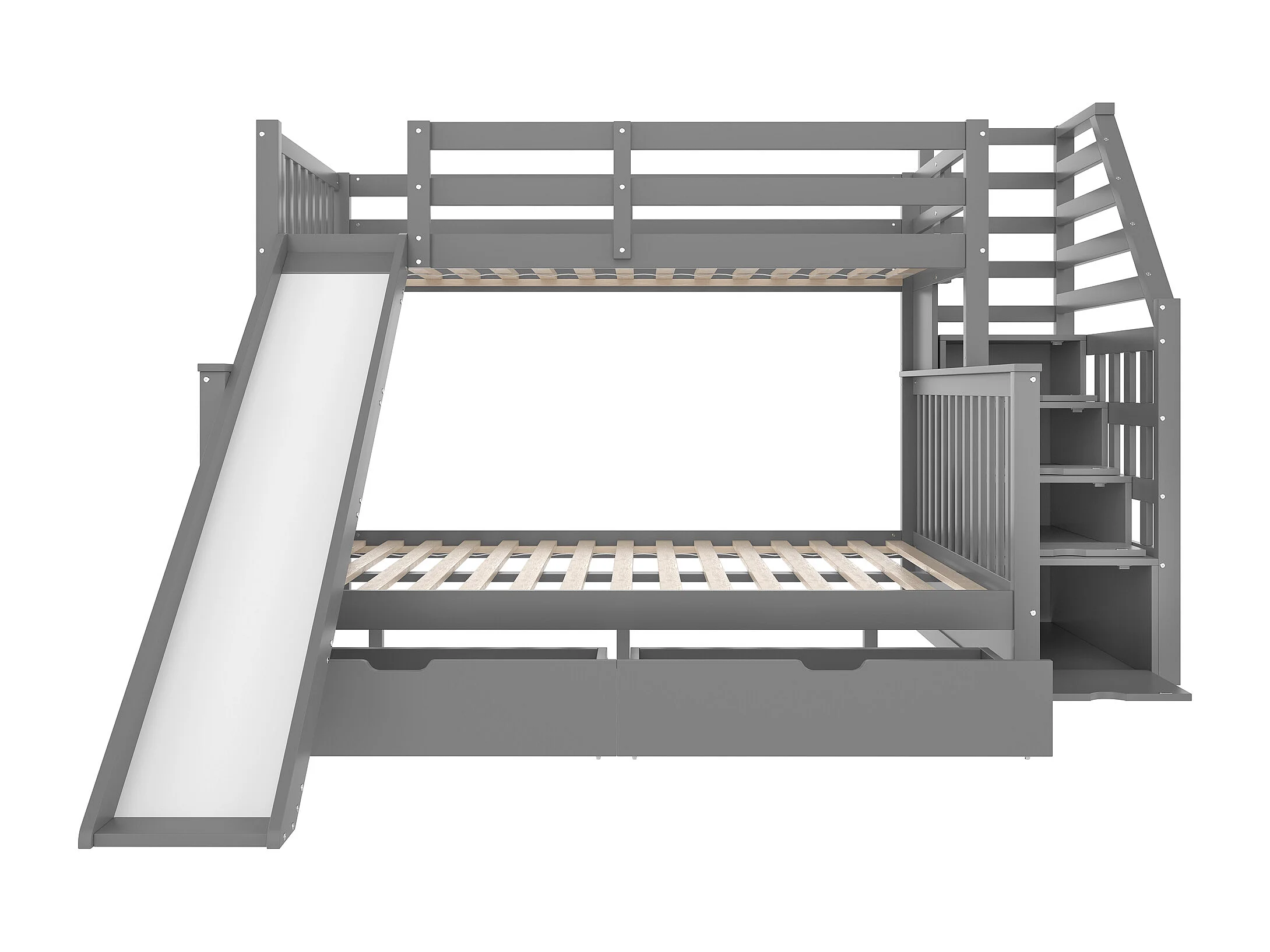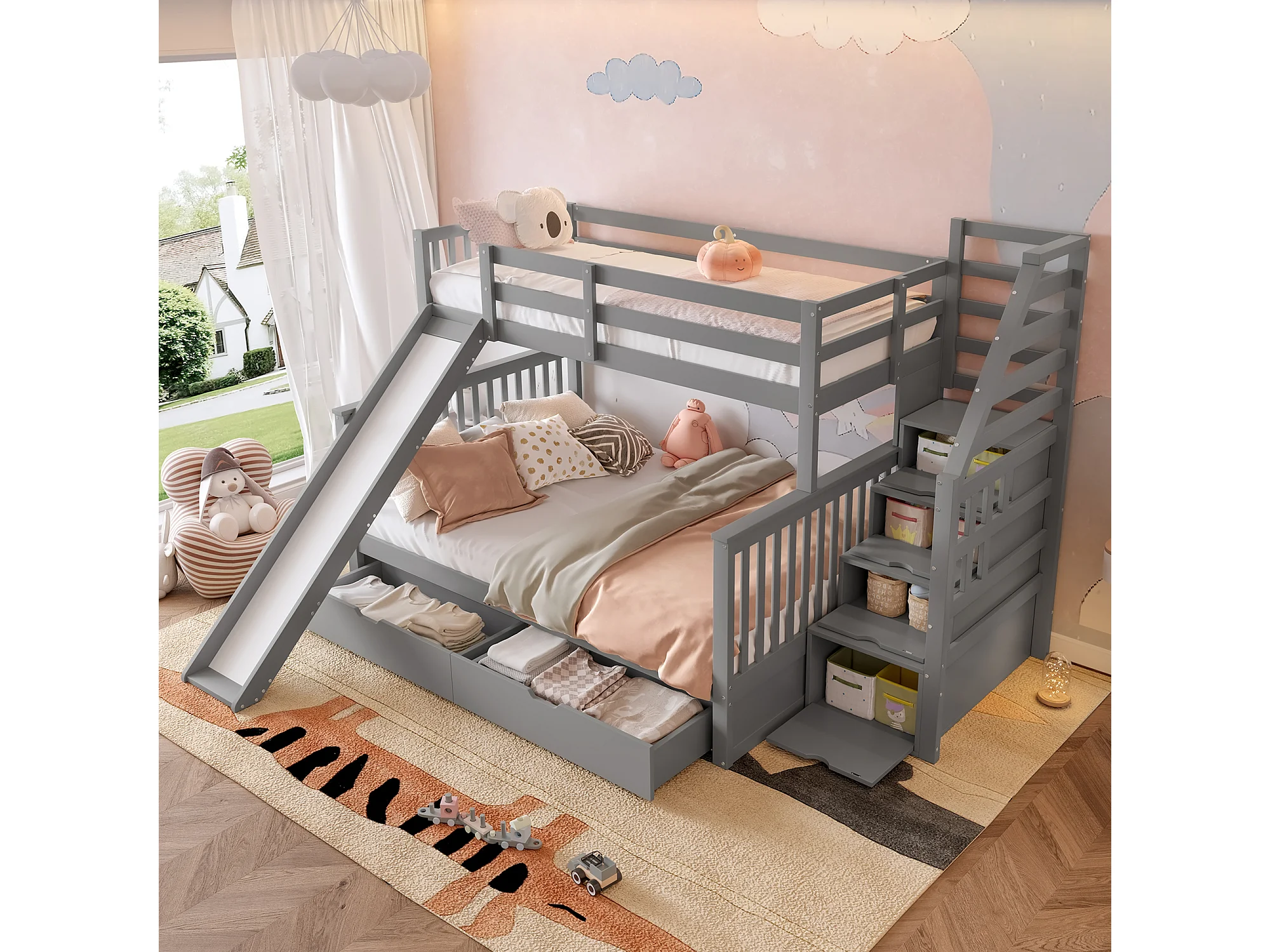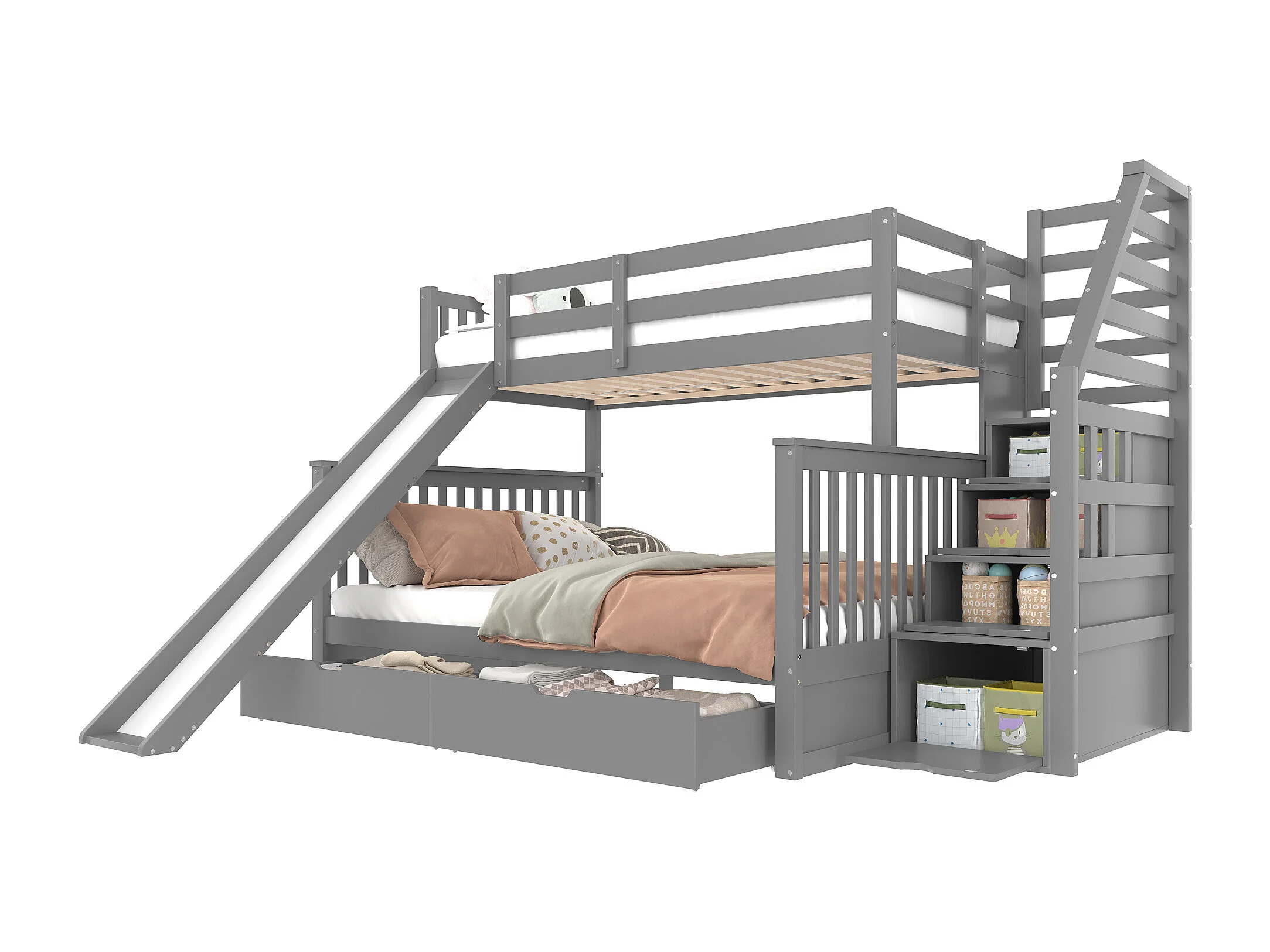 Lit superposé en bois massif - 90x200cm + 140x200cm - avec escalier de rangement et toboggan - Gris