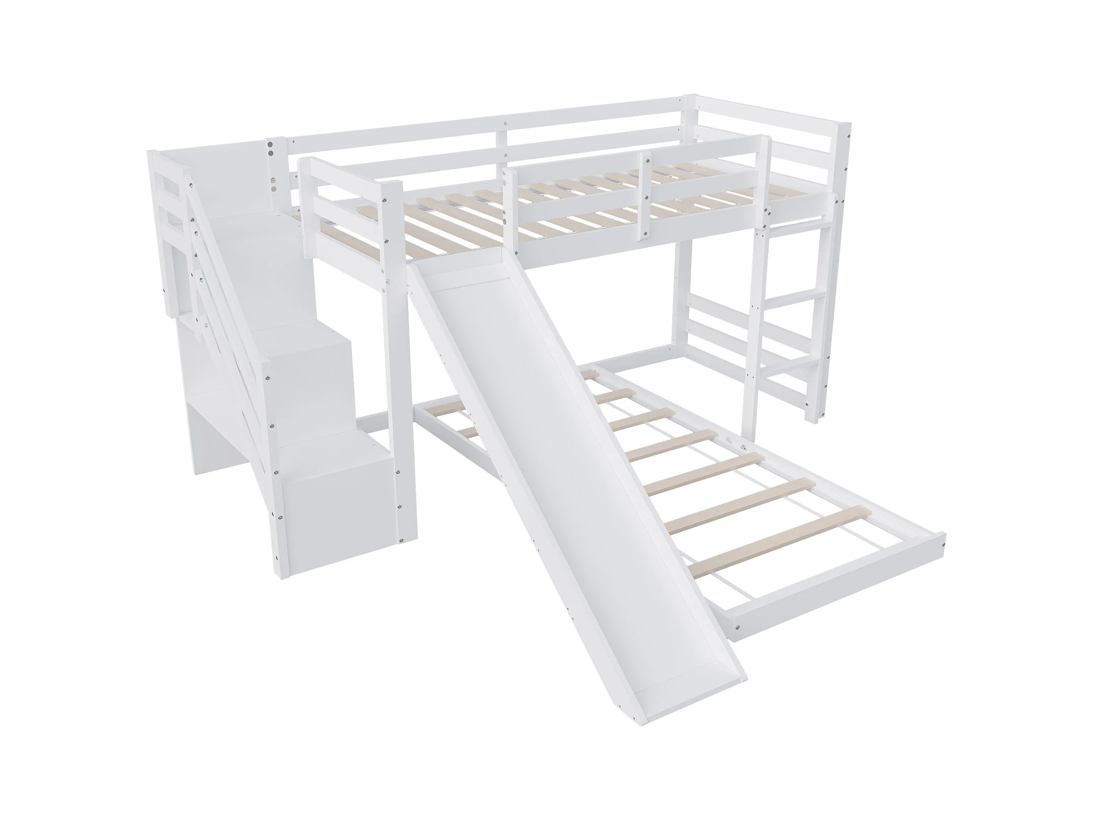 Lit superposé en bois massif - 90x200cm - avec barrière, échelle et toboggan - Blanc