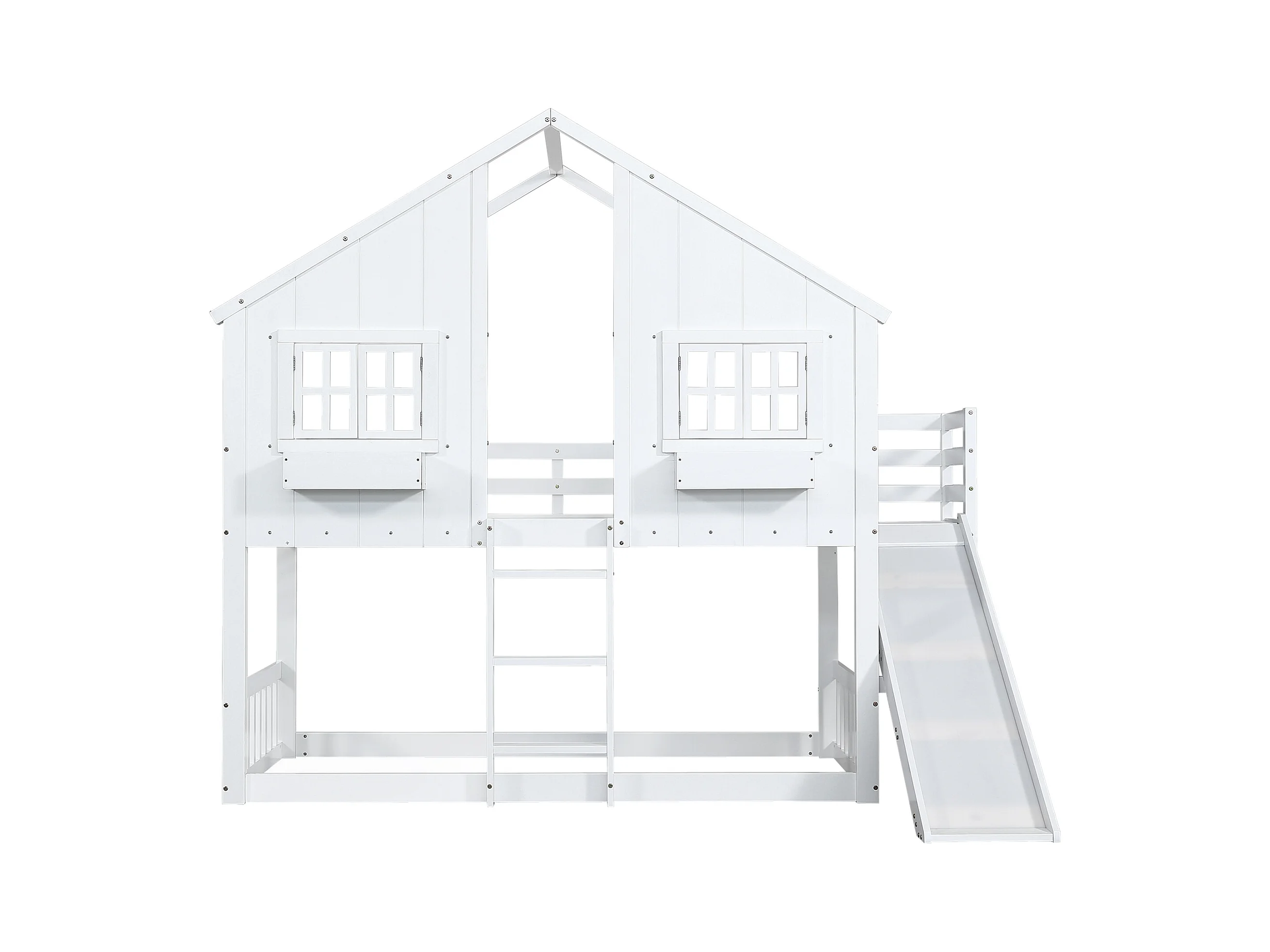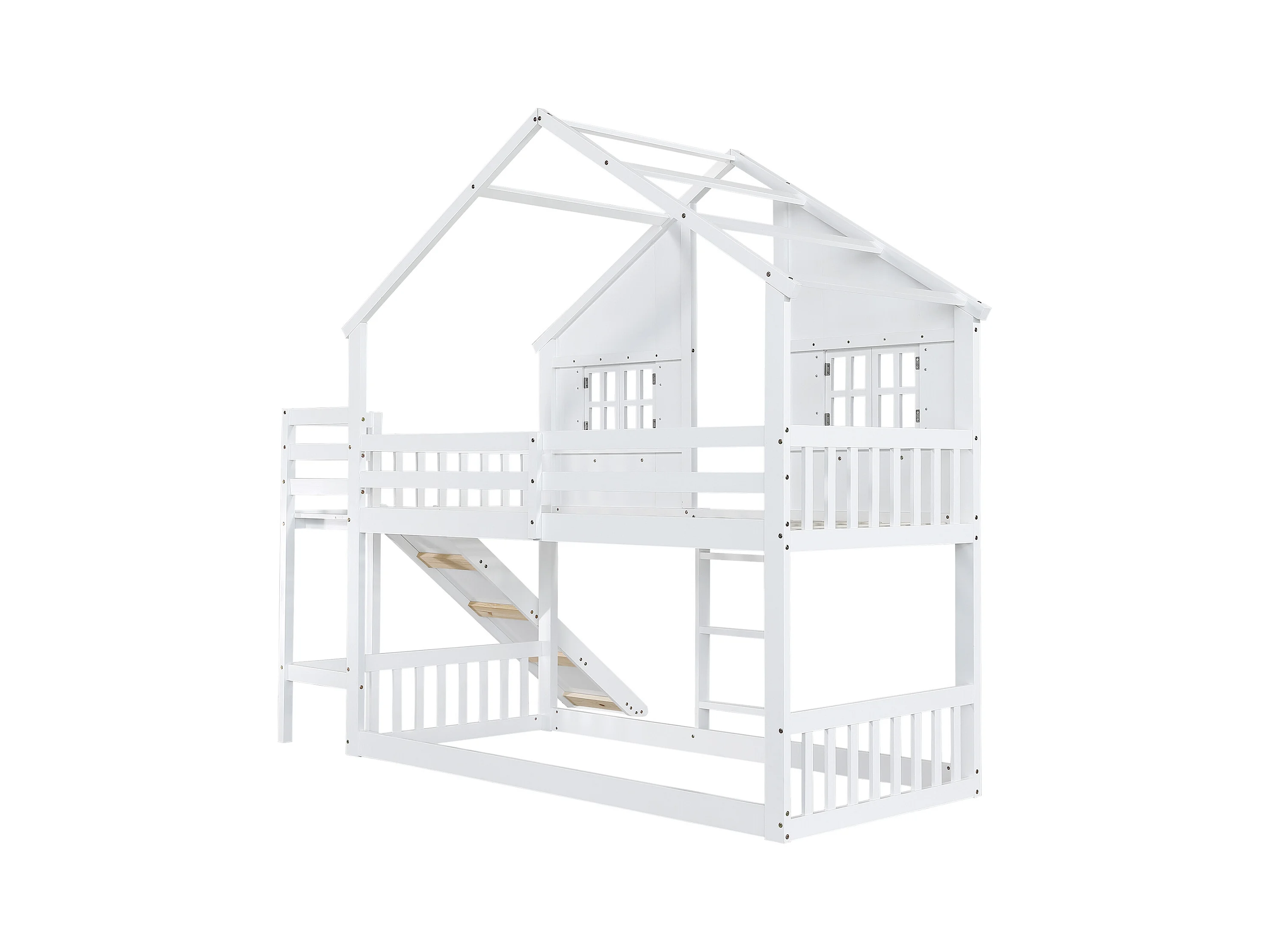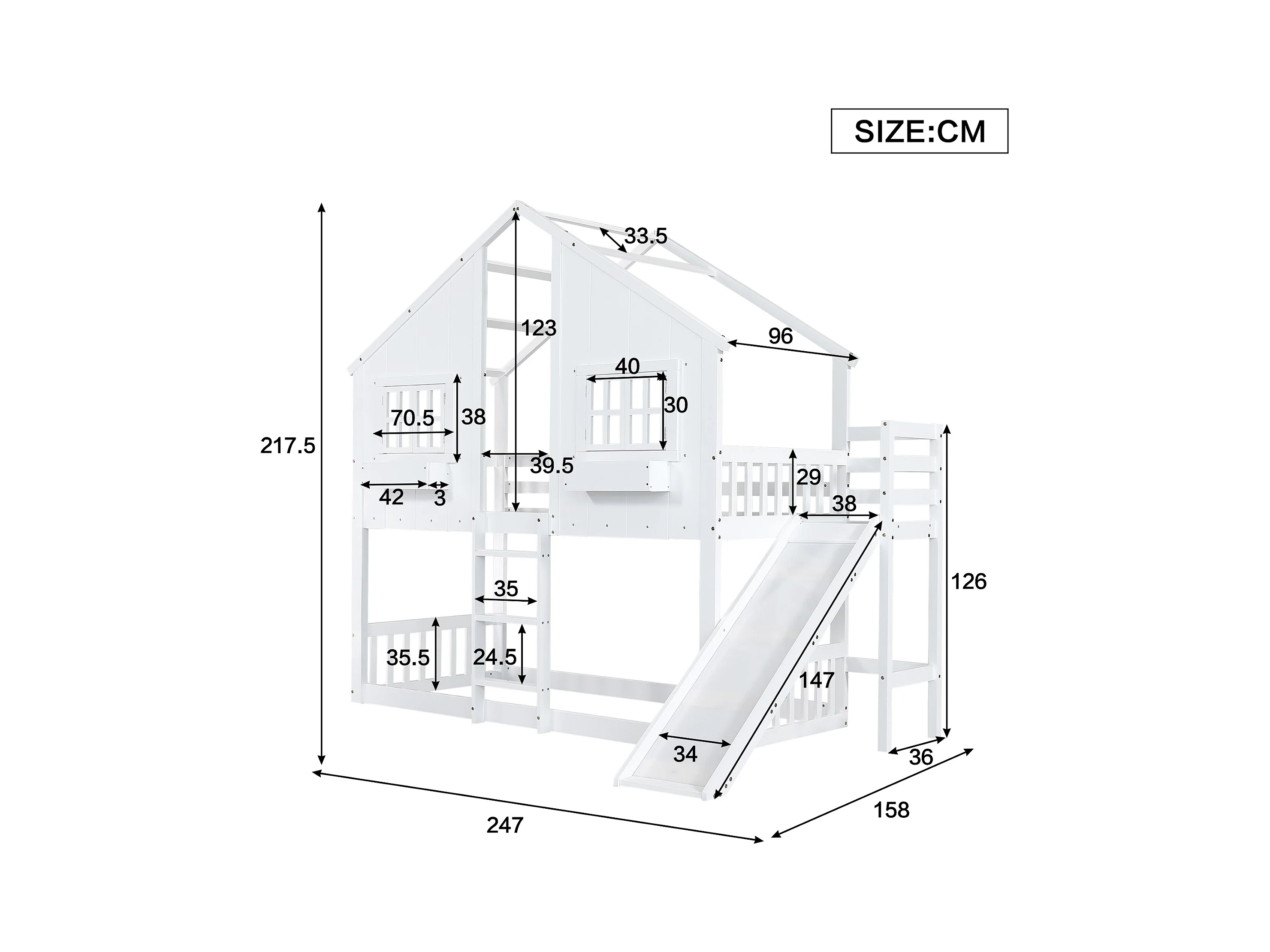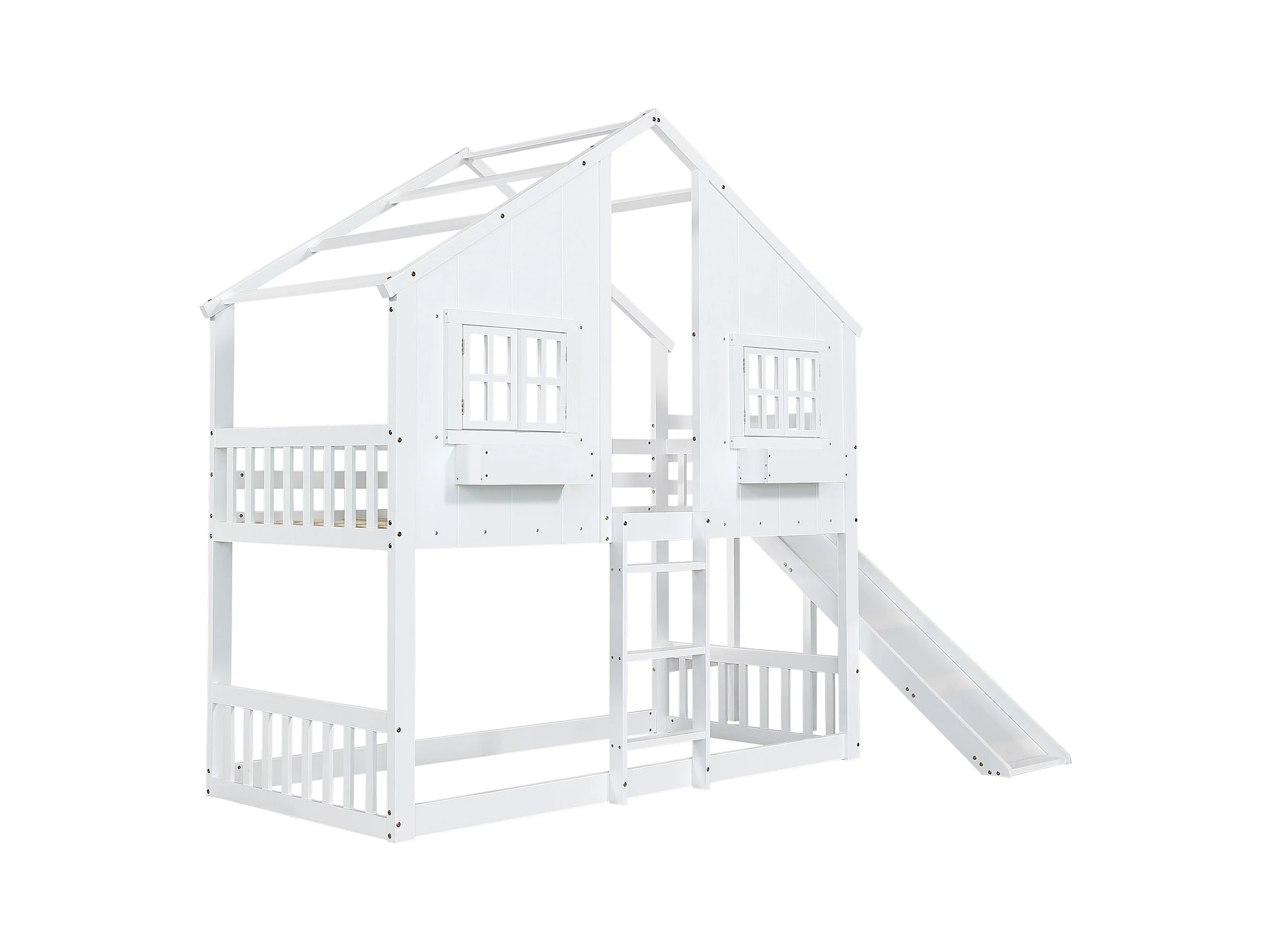 Lit superposé cabane 90x200cm - avec échelle et toboggan - cadre en pin - Blanc