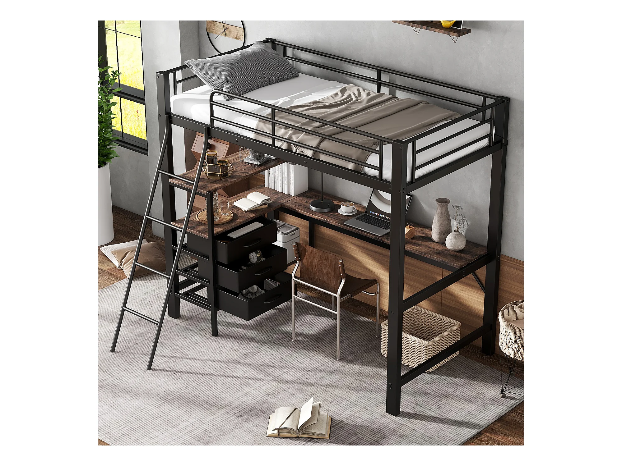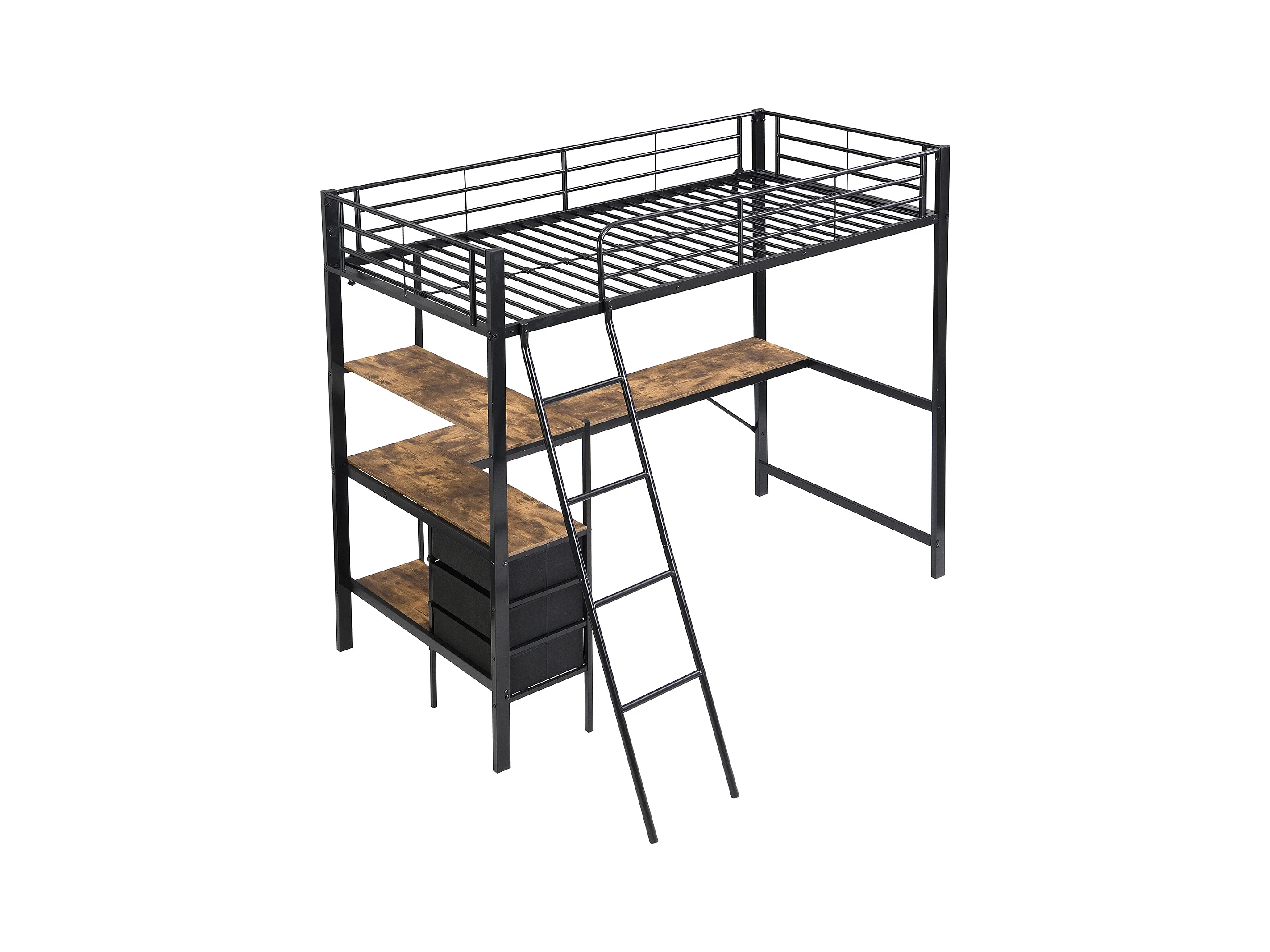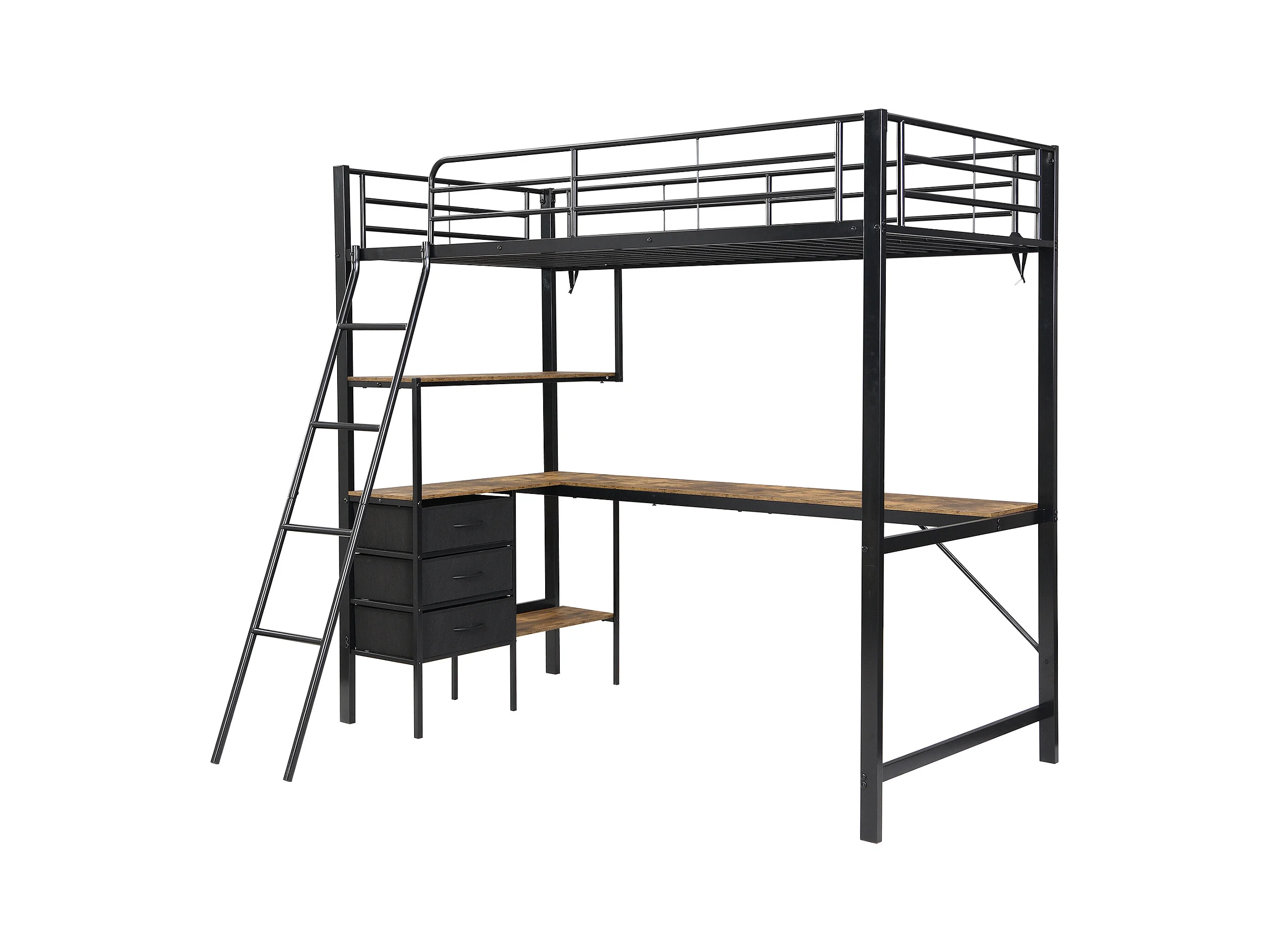 Lit mezzanine, 90x200 cm, avec bureau, étagères, garde-corps, échelle, cadre en métal, Noir (204x149.5x180 cm)