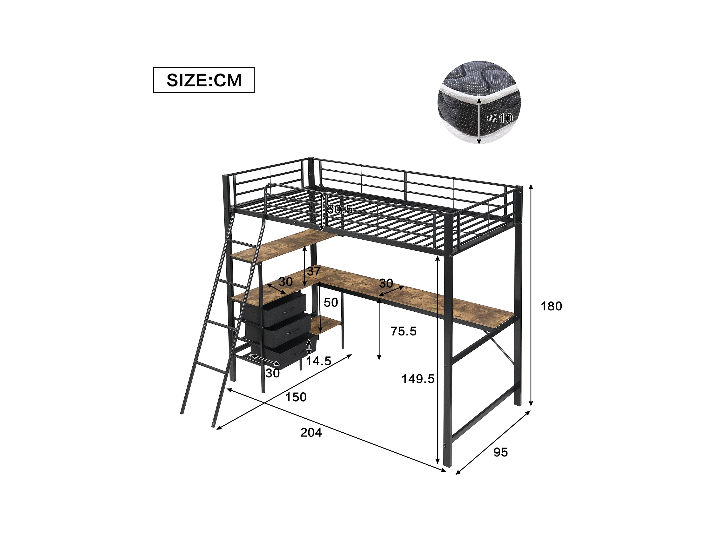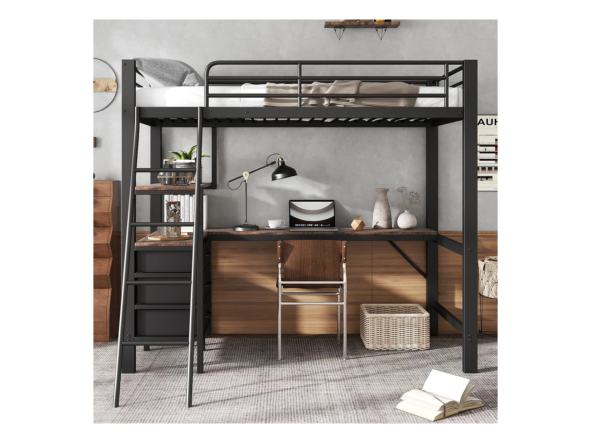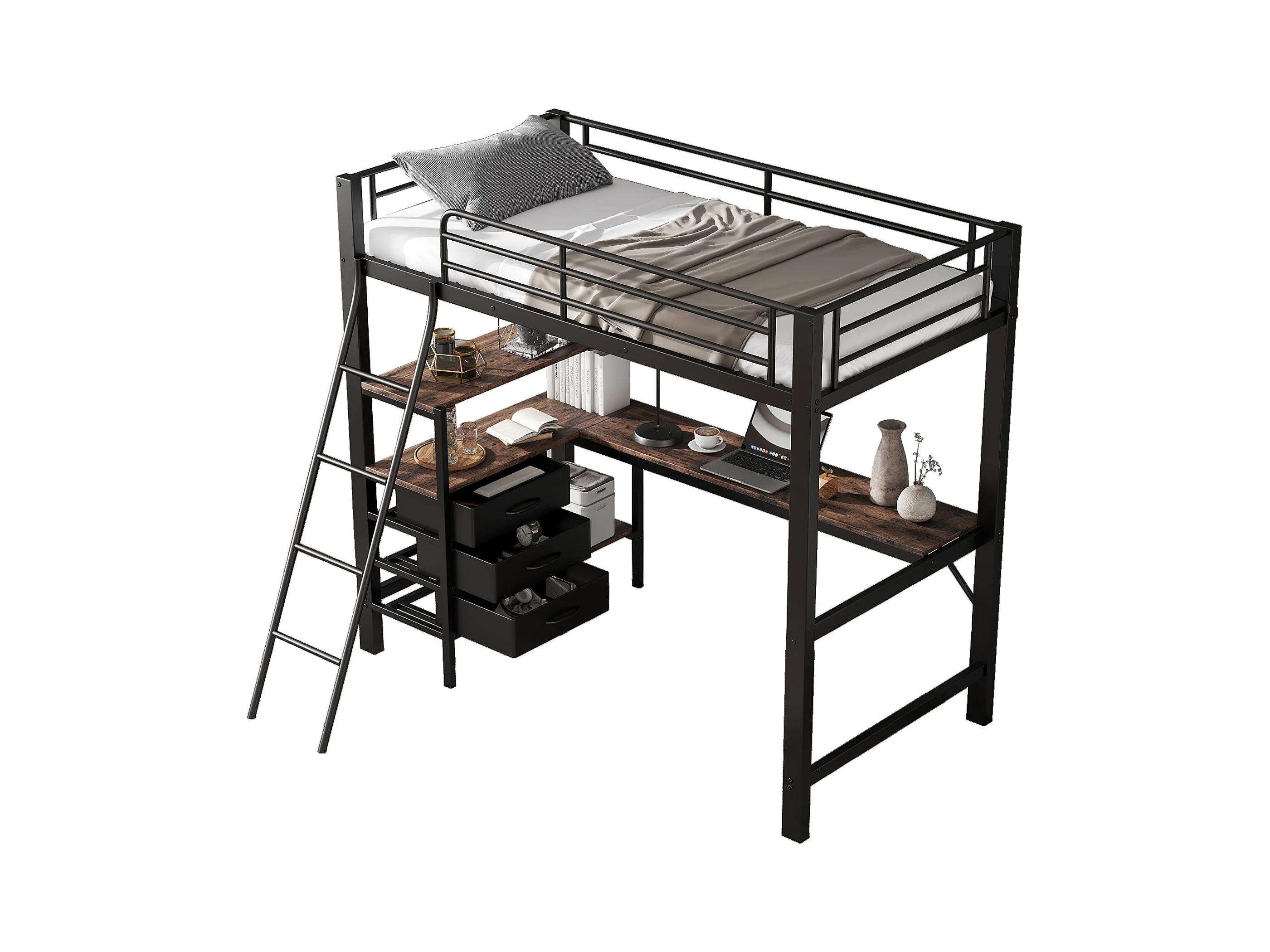 Lit mezzanine, 90x200 cm, avec bureau, étagères, garde-corps, échelle, cadre en métal, Noir (204x149.5x180 cm)