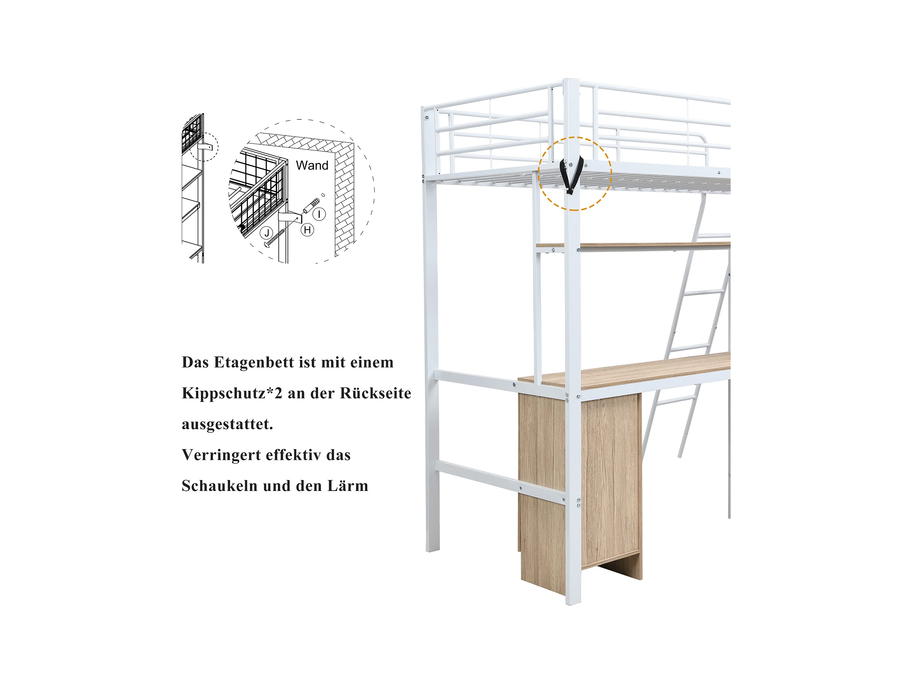 Lit superposé avec échelle, bureau et étagères, cadre en métal et MDF, blanc + naturel (204.5x95.5x180.5 cm)