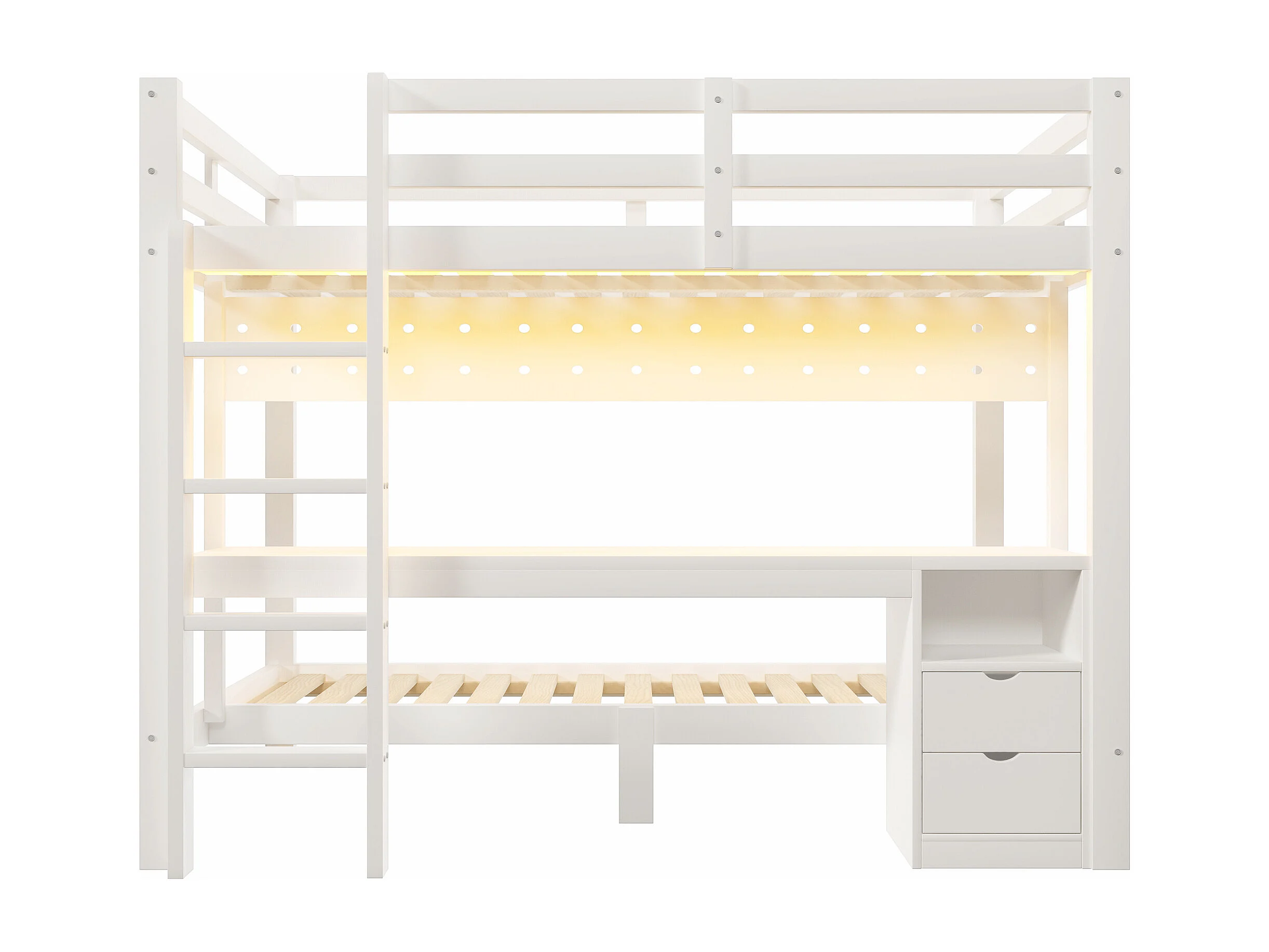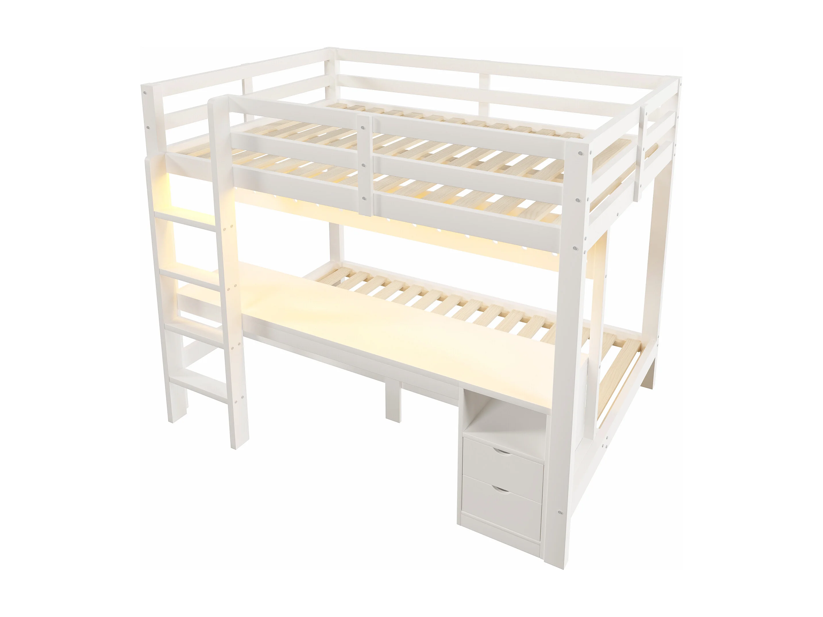 Lit superposé enfamt - 90 x 200 cm + 140 x 200 cm - avec Leds + bureau + tiroirs - bois - blanc