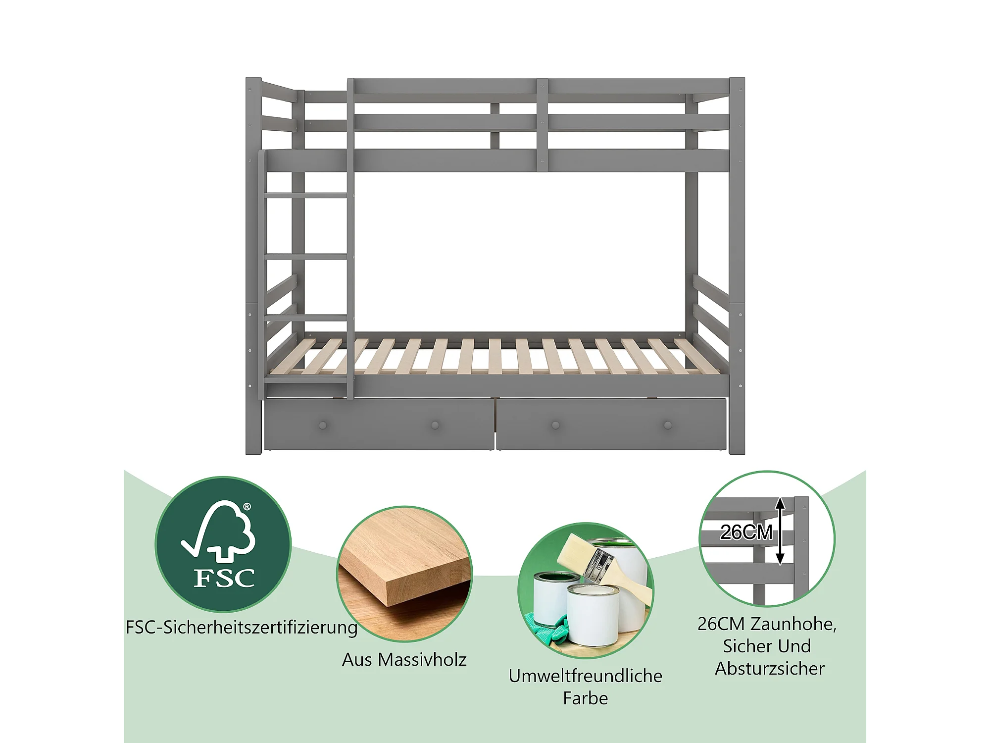 Lit Superposé 140 x 200 cm - En Pin; MDF - Structure Massif Avec 15 Lattes - Tiroirs De Rangement Amovibles Et Escalier - Sans Matelas - Gris