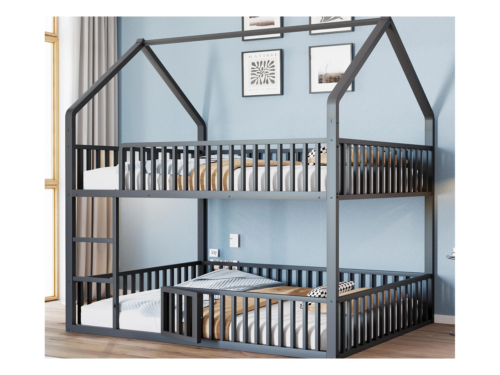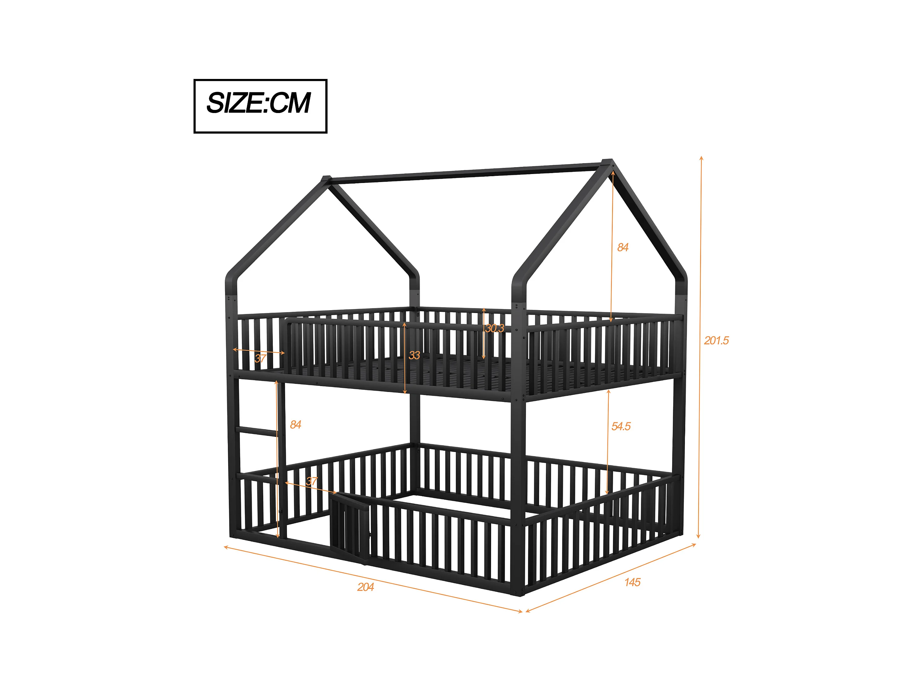 Lit superposé enfant 140 x 200 cm - design en forme de maison - avec clôture et éclairage LED - Noir (sans matelas)