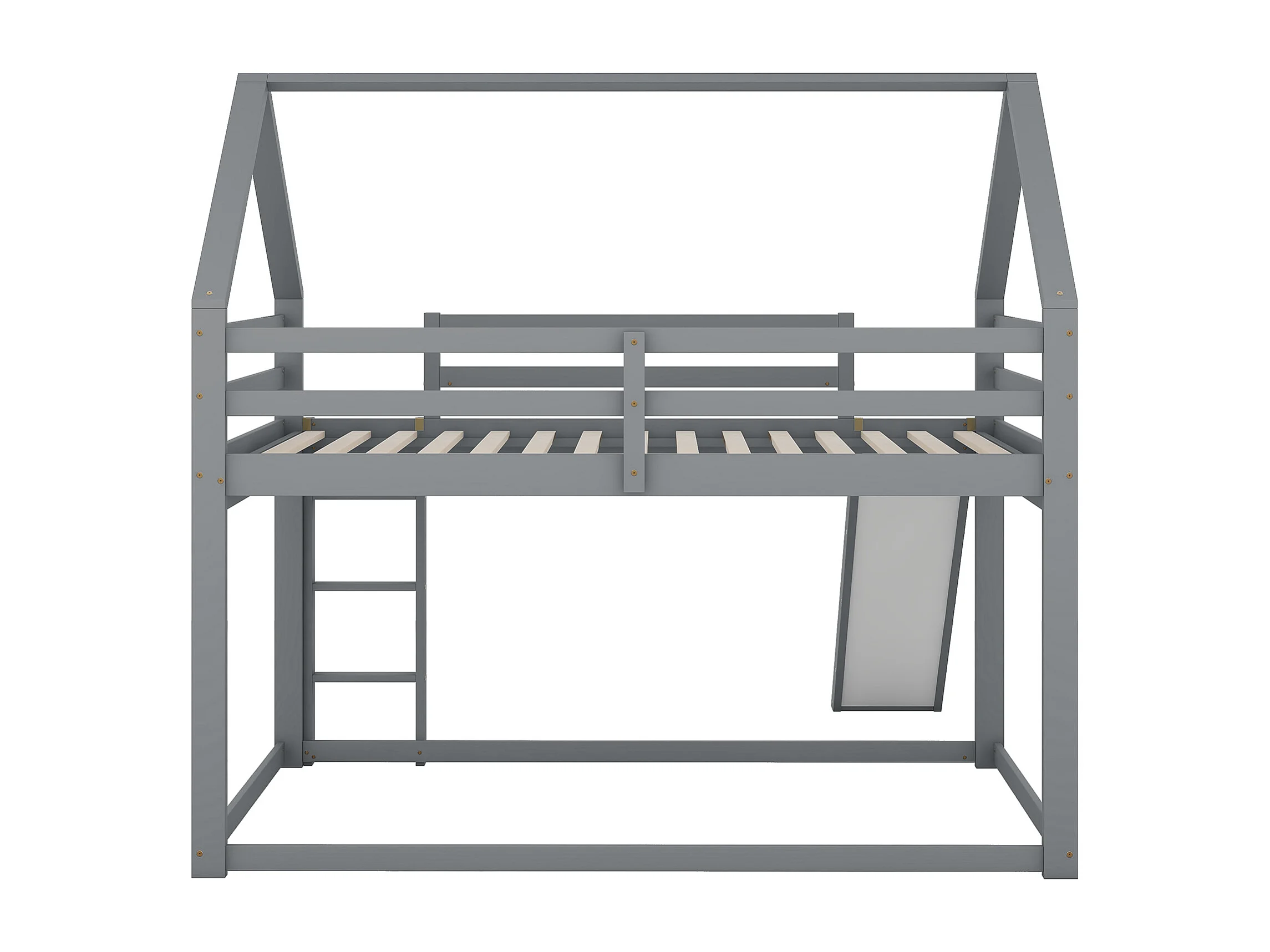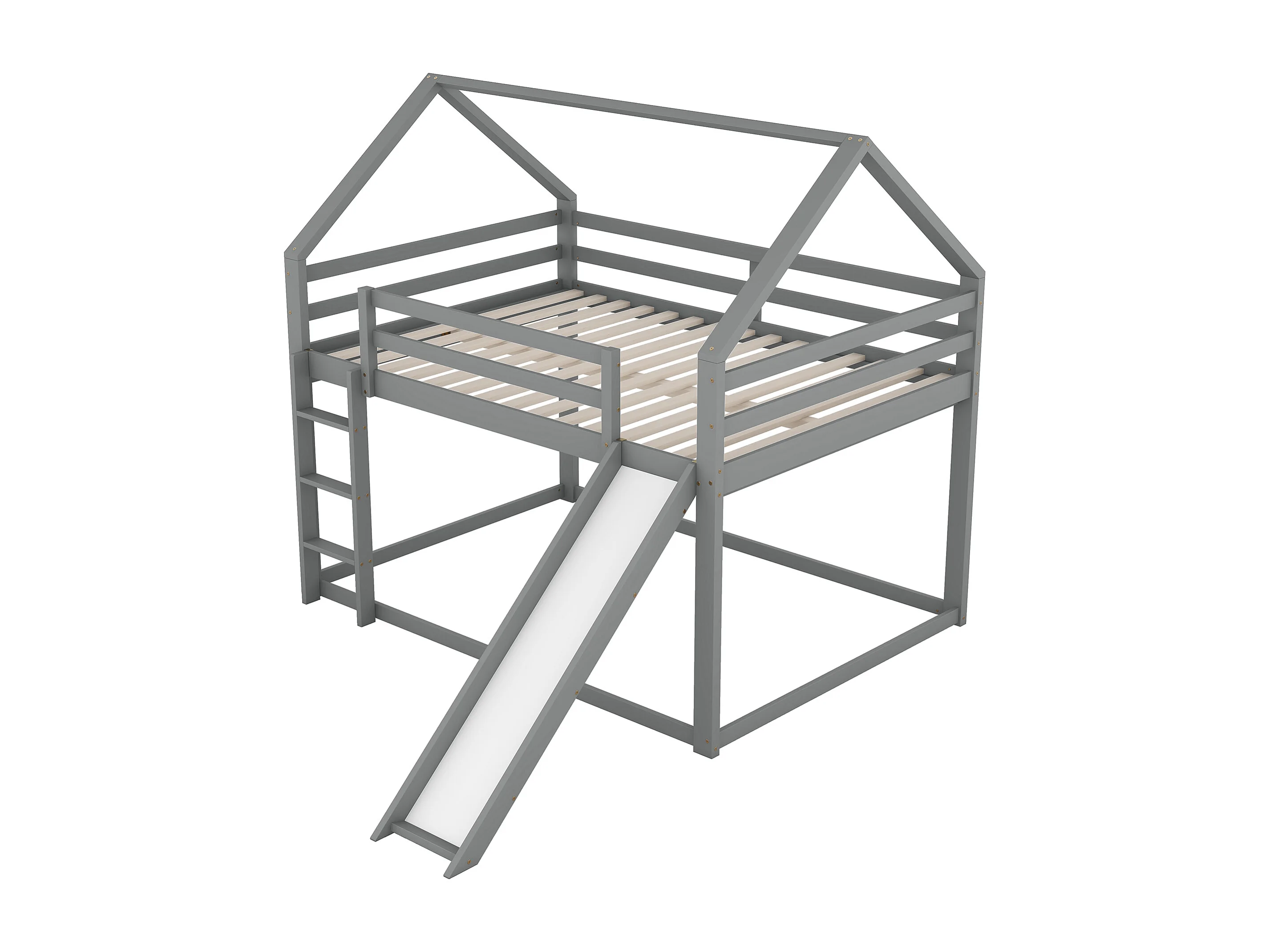 Lit superposé 140 x 200 cm - Lit Maison - En Pin - Avec Glissade et Escalier - Avec Sommier - Barrières de Sécurité - Gris - Sans matelas