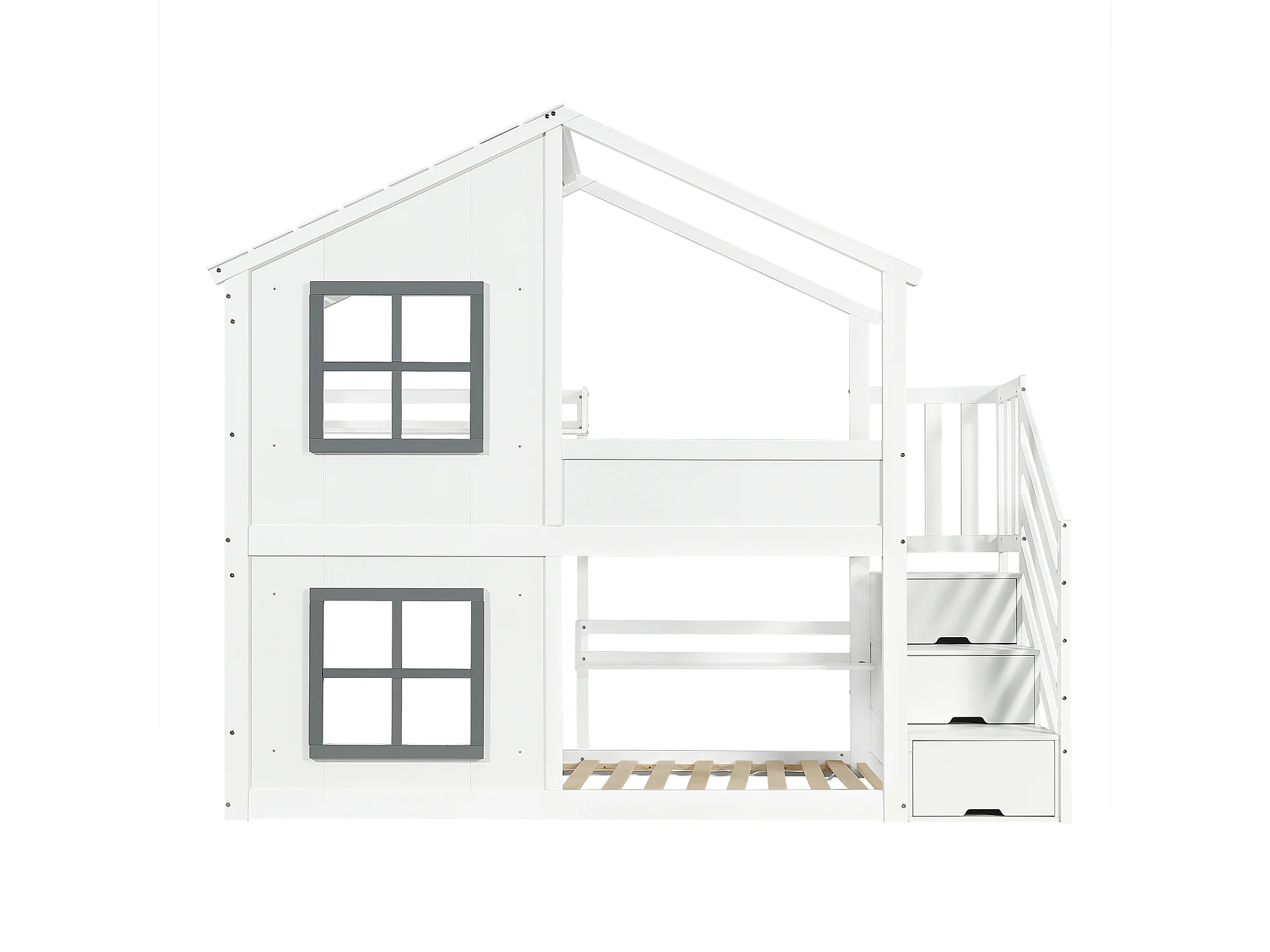 Lit superposé enfant 90x200 cm - avec fenêtre - avec échelle de rangement - bois massif + MDF - blanc + gris (sans matelas)