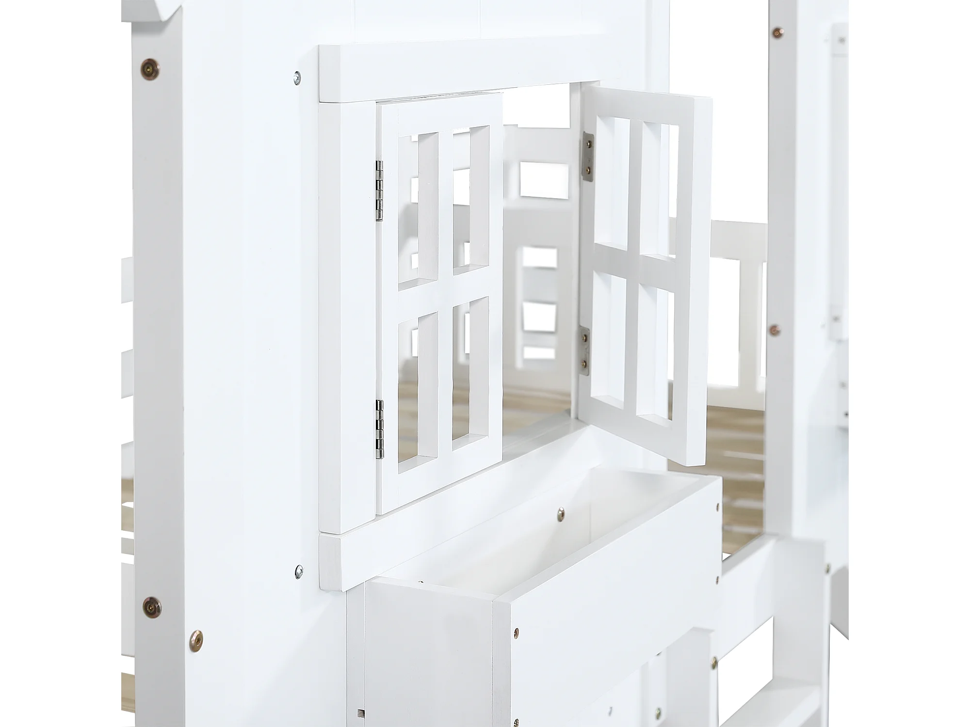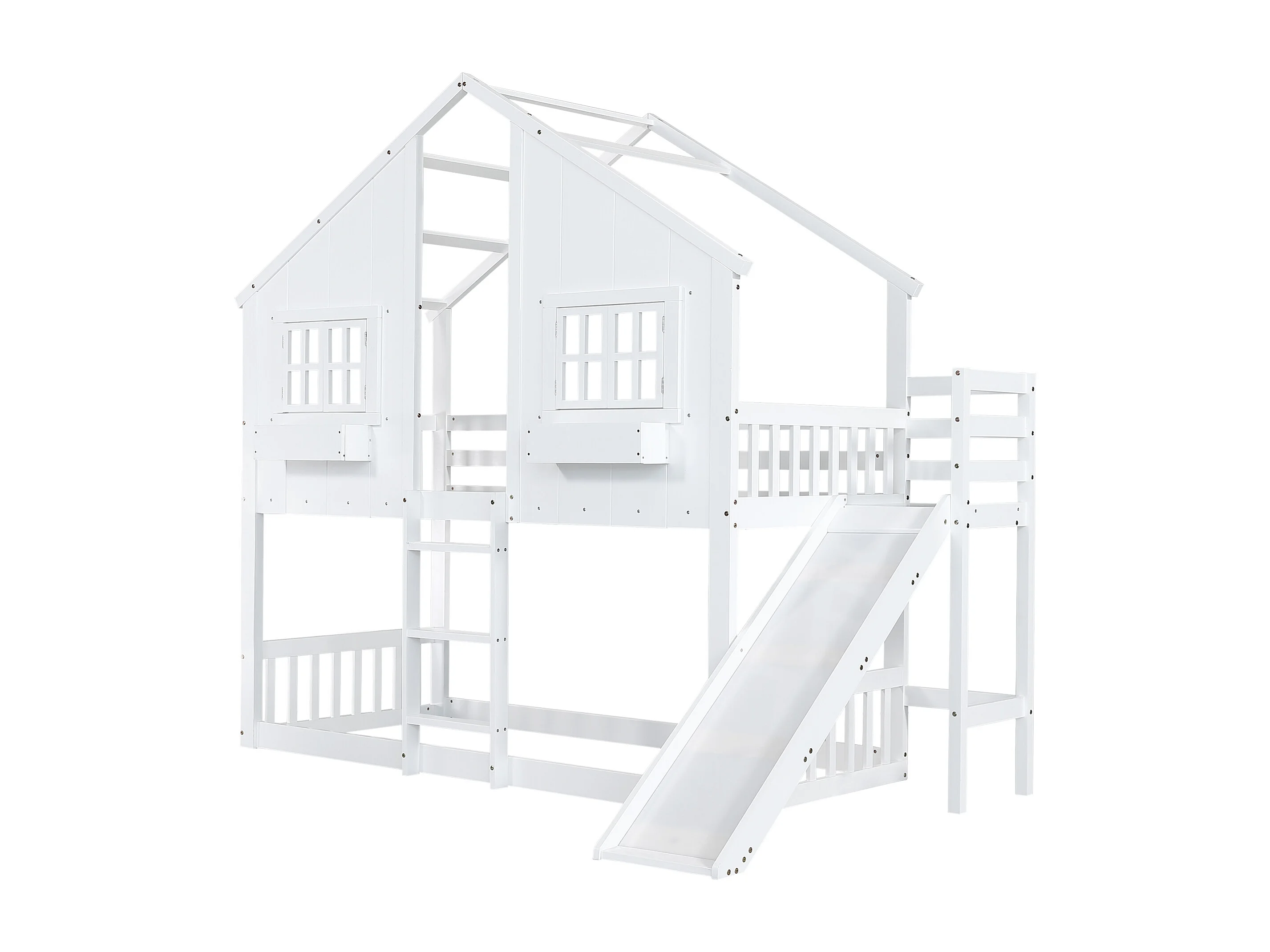 Lit superposé enfant 90x200 cm avec toboggan, fenêtres, protection, échelle 3 niveaux, blanc, sans matelas