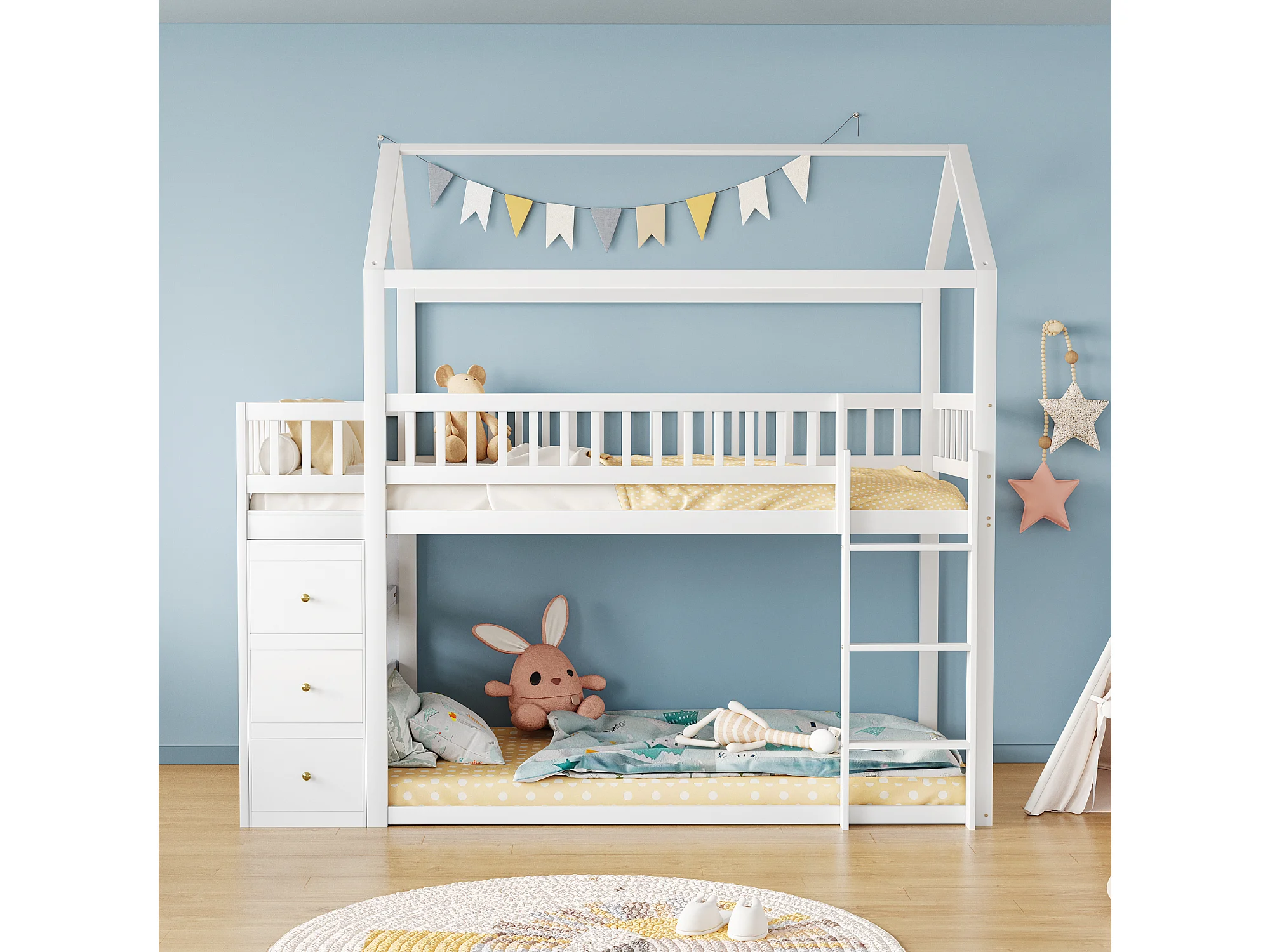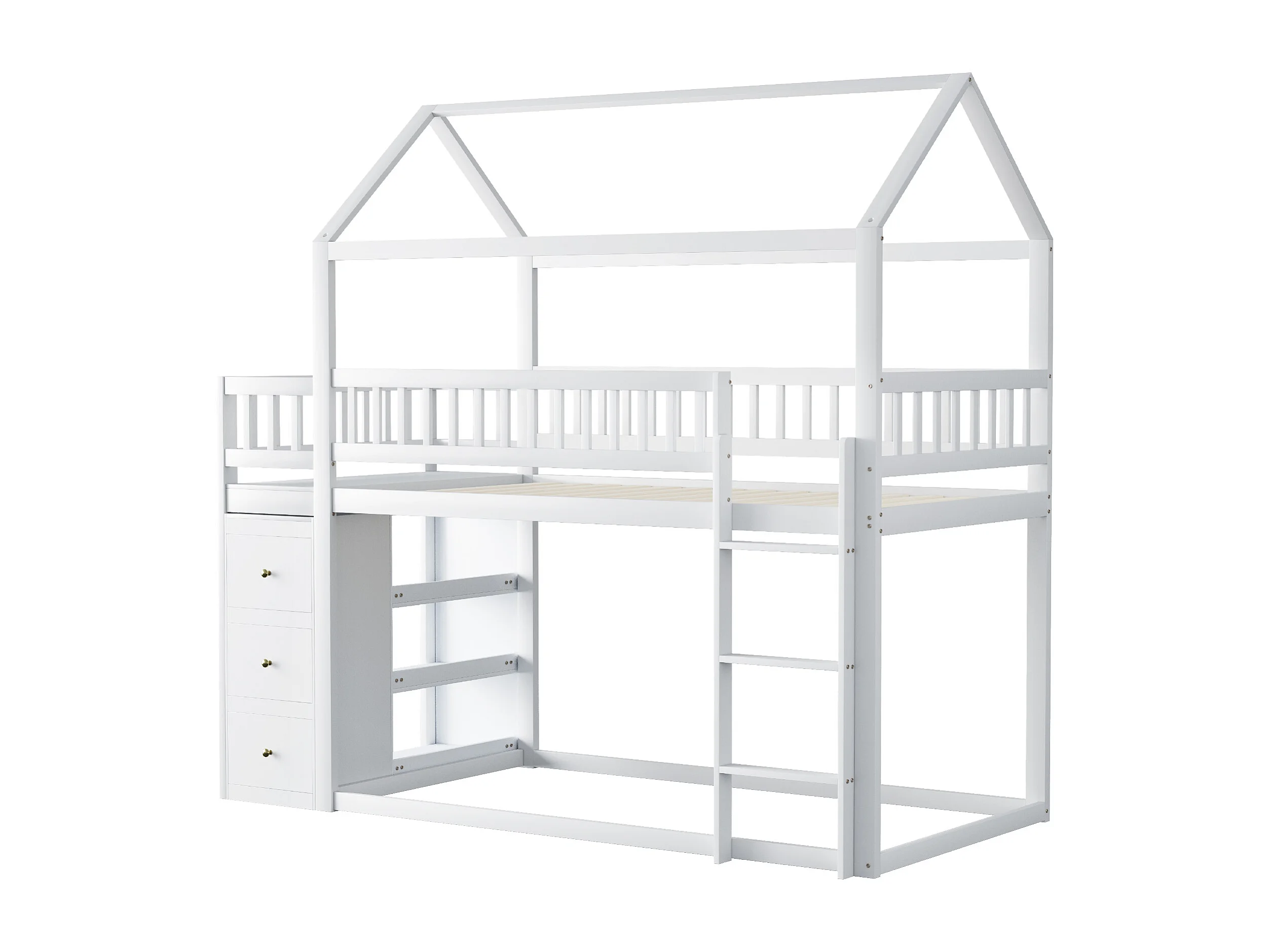 Lit superposé enfant 90x200 cm en forme de maison, en bois massif blanc, avec échelle, garde-corps, commode