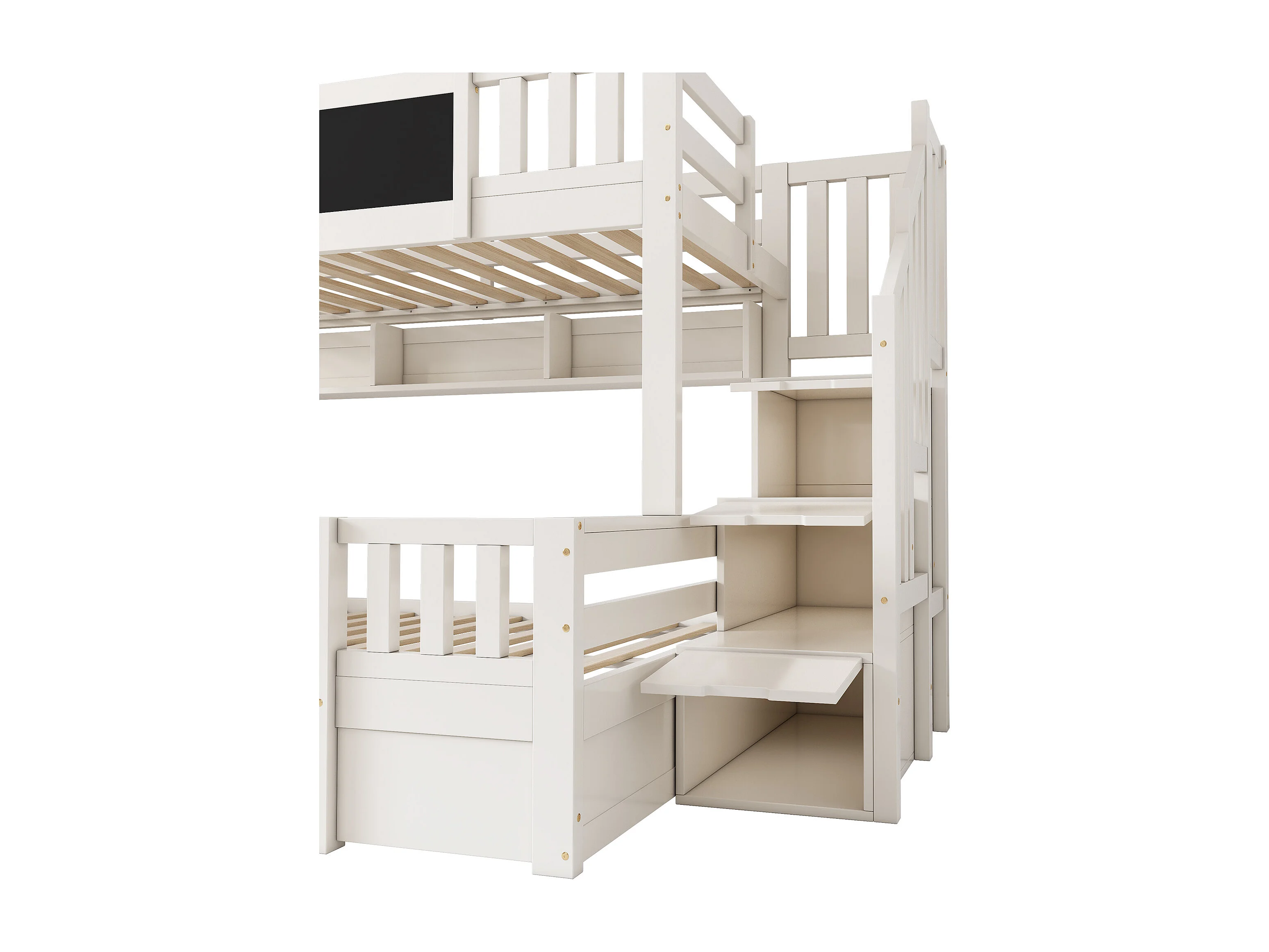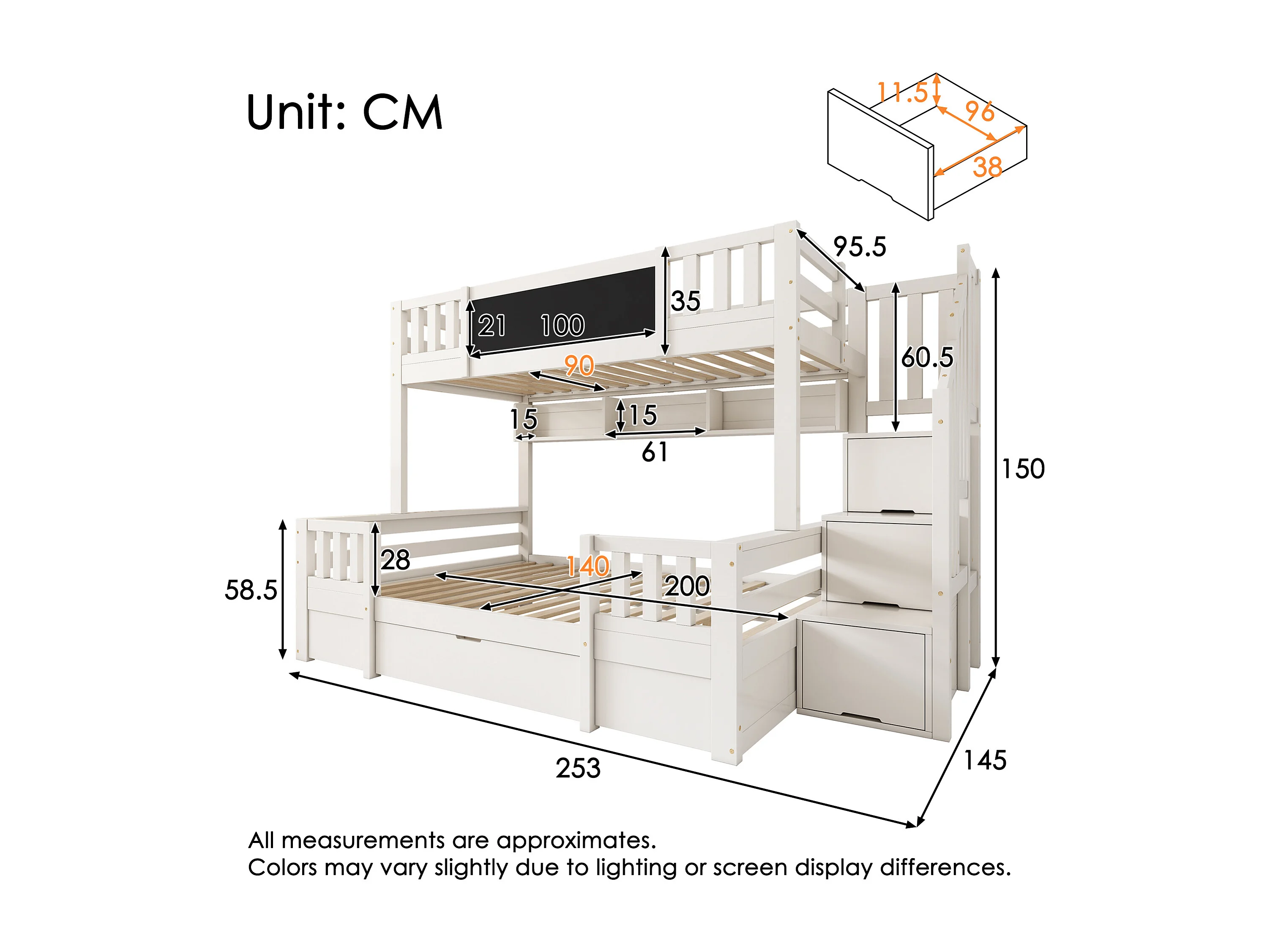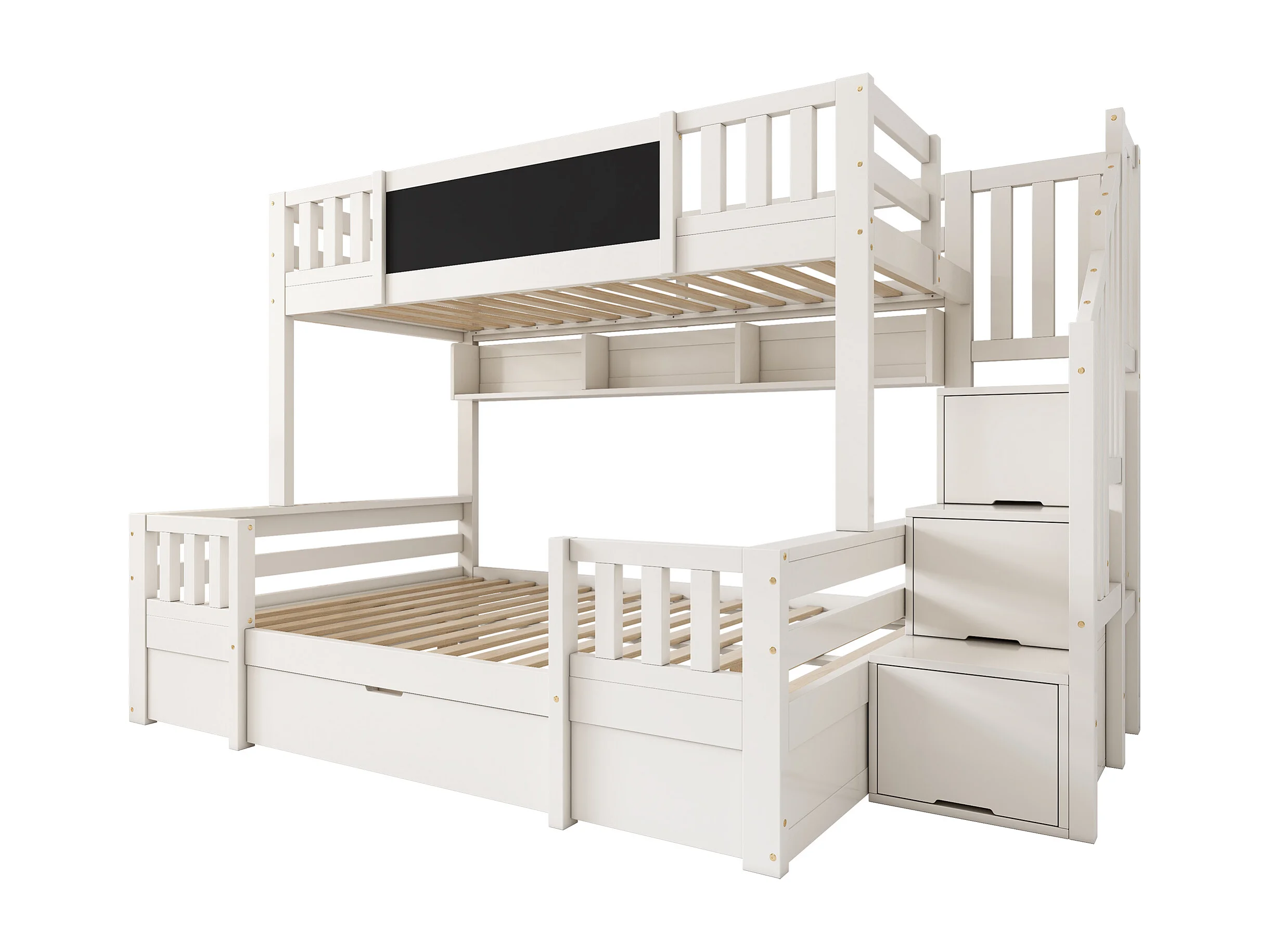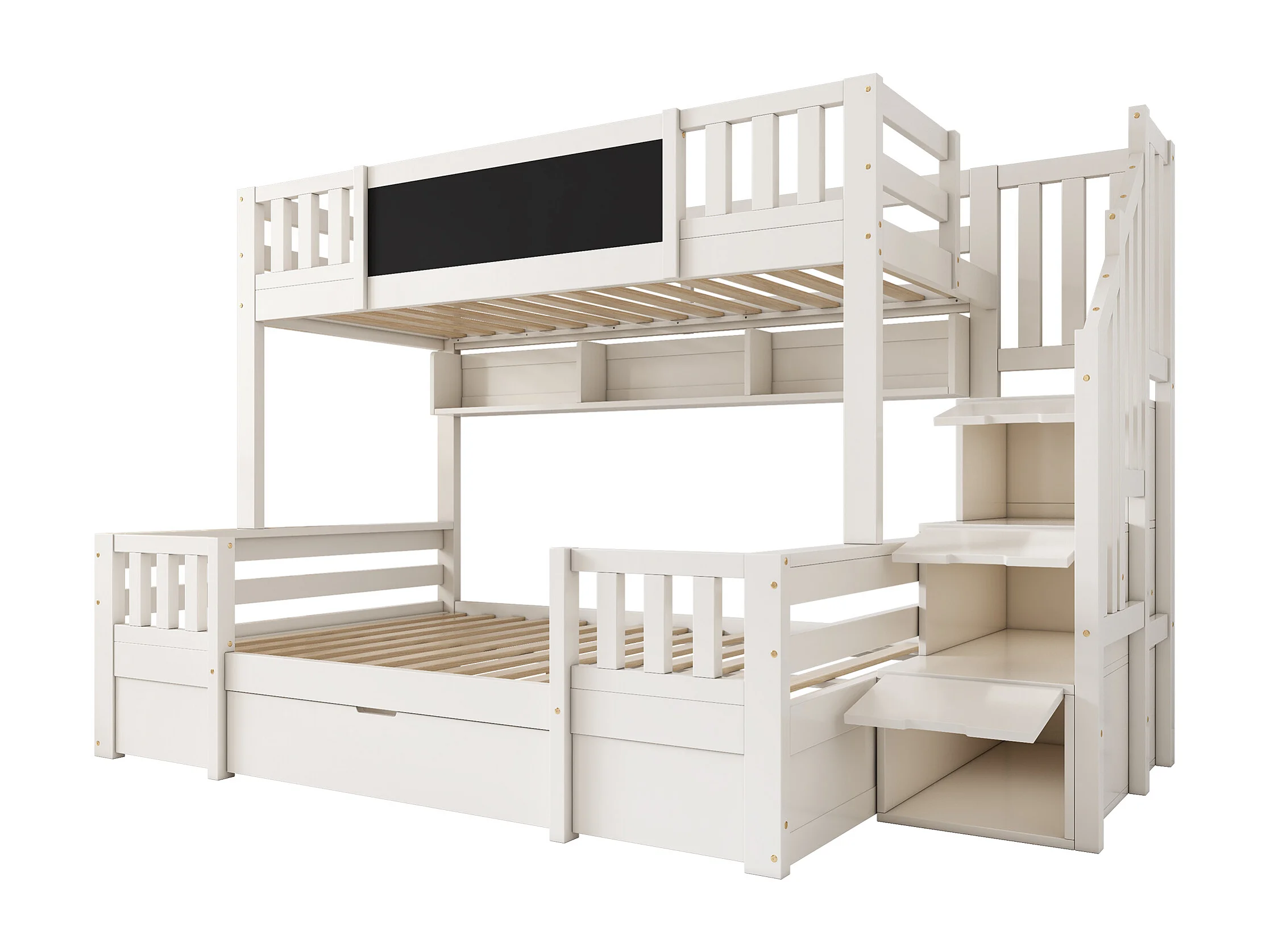 Lit superposé enfant 90x200 cm et 140x200 cm avec tiroir et escalier de rangement - Bois blanc