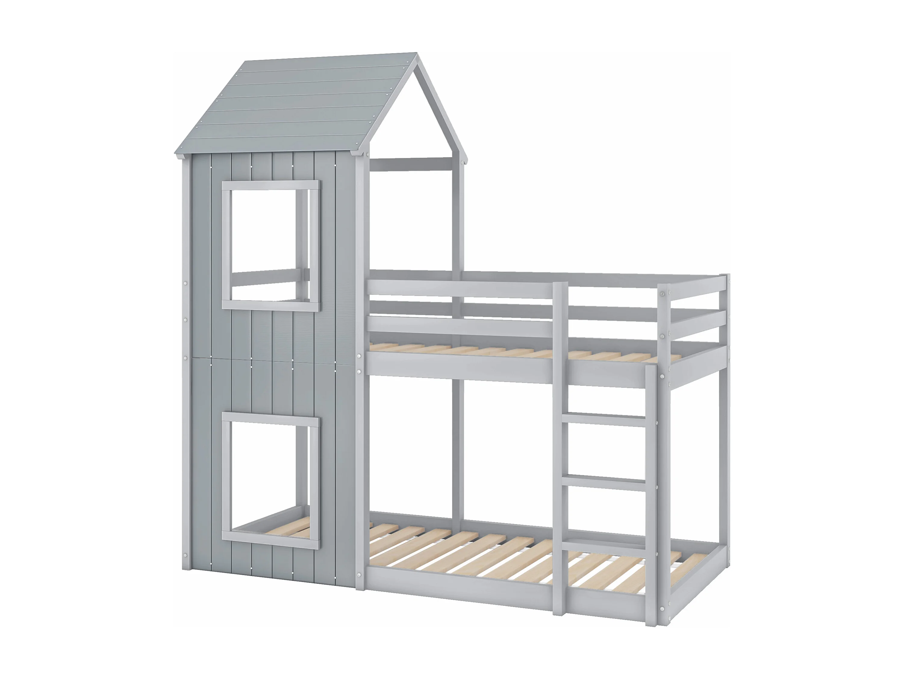 Lit superposé 90x200 cm avec barrière de sécurité et échelle, structure en bois de pin, gris (Sans matelas)