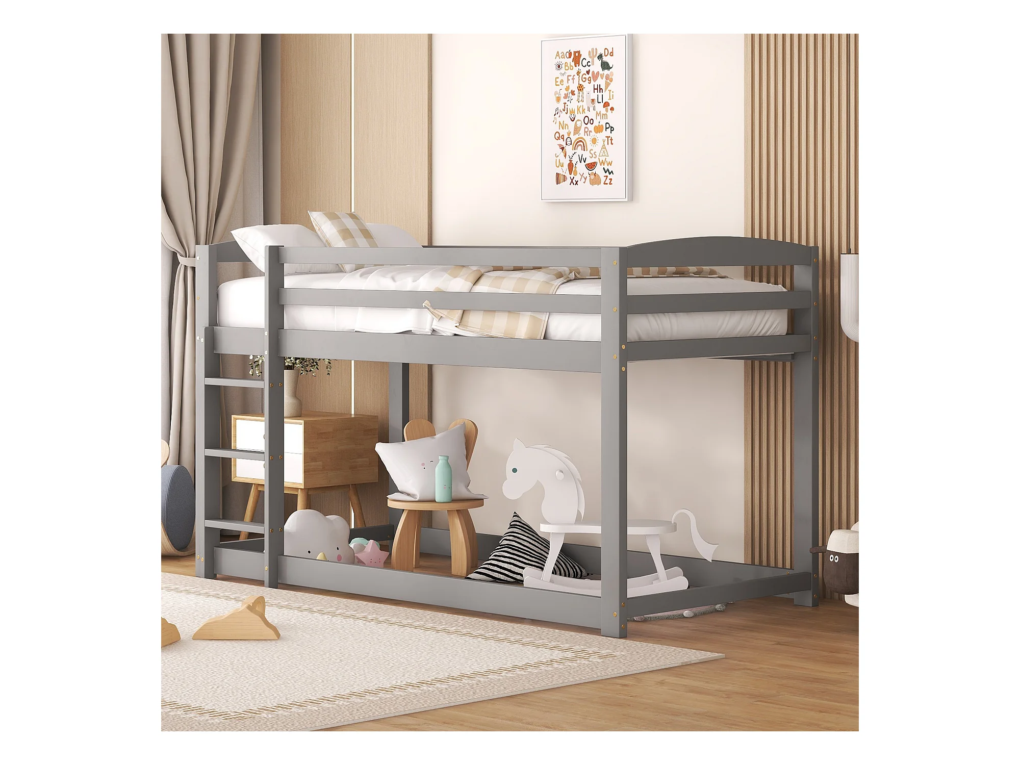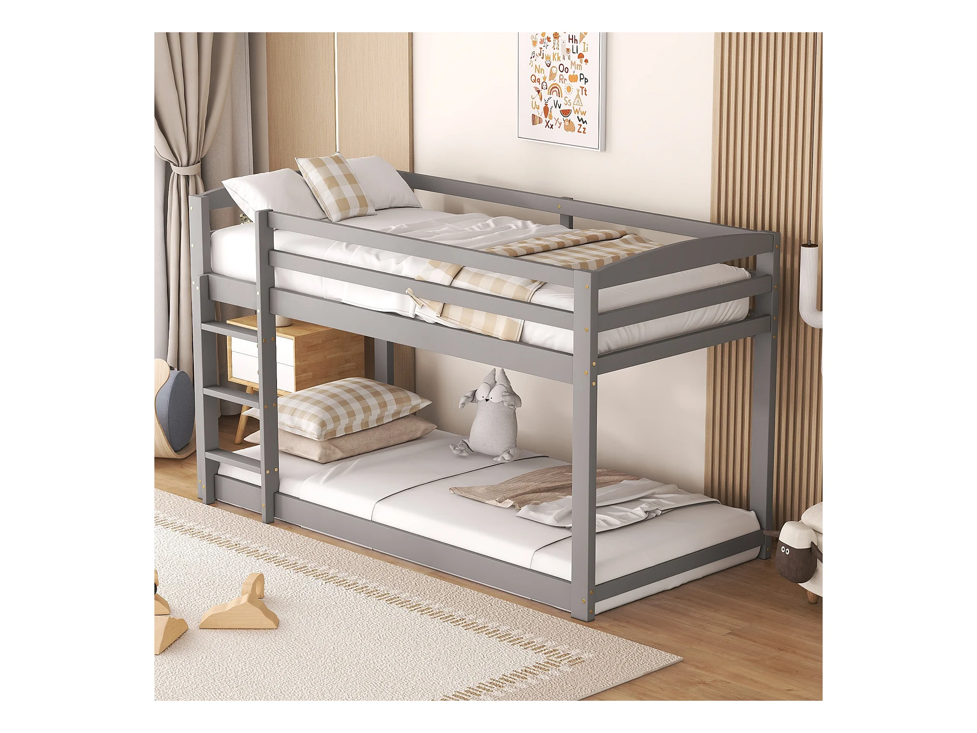 Lit superposé 90x200 cm avec sommier - protection anti-chute et éhelle - bois - gris (sans matelas)