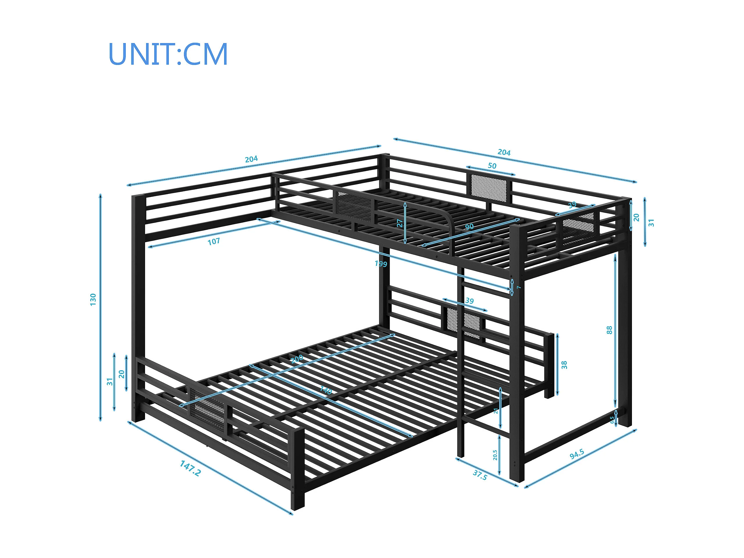 Lit superposé 140x200 cm, avec barrières de sécurité, montage facile, métal, noir (Sans matelas)
