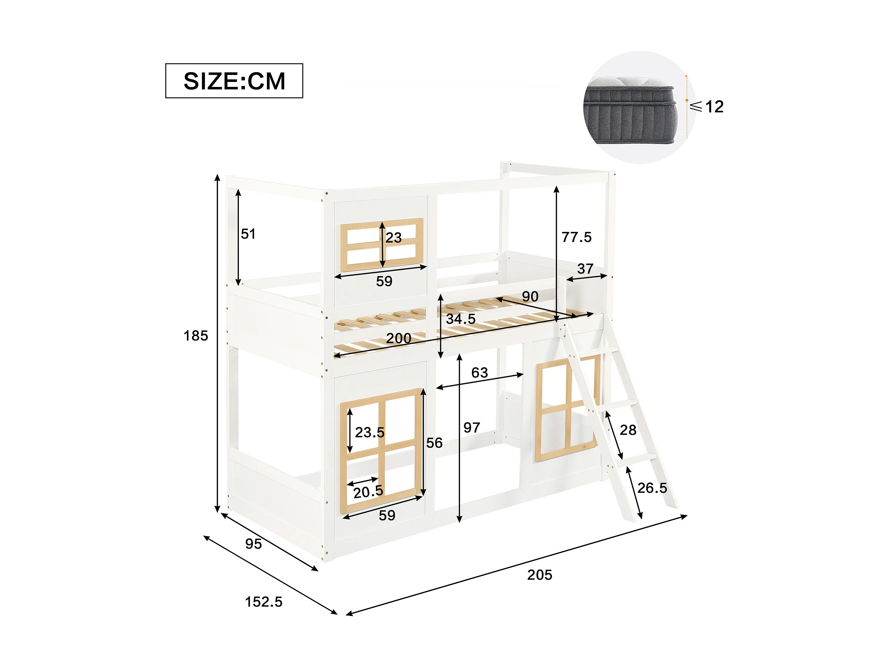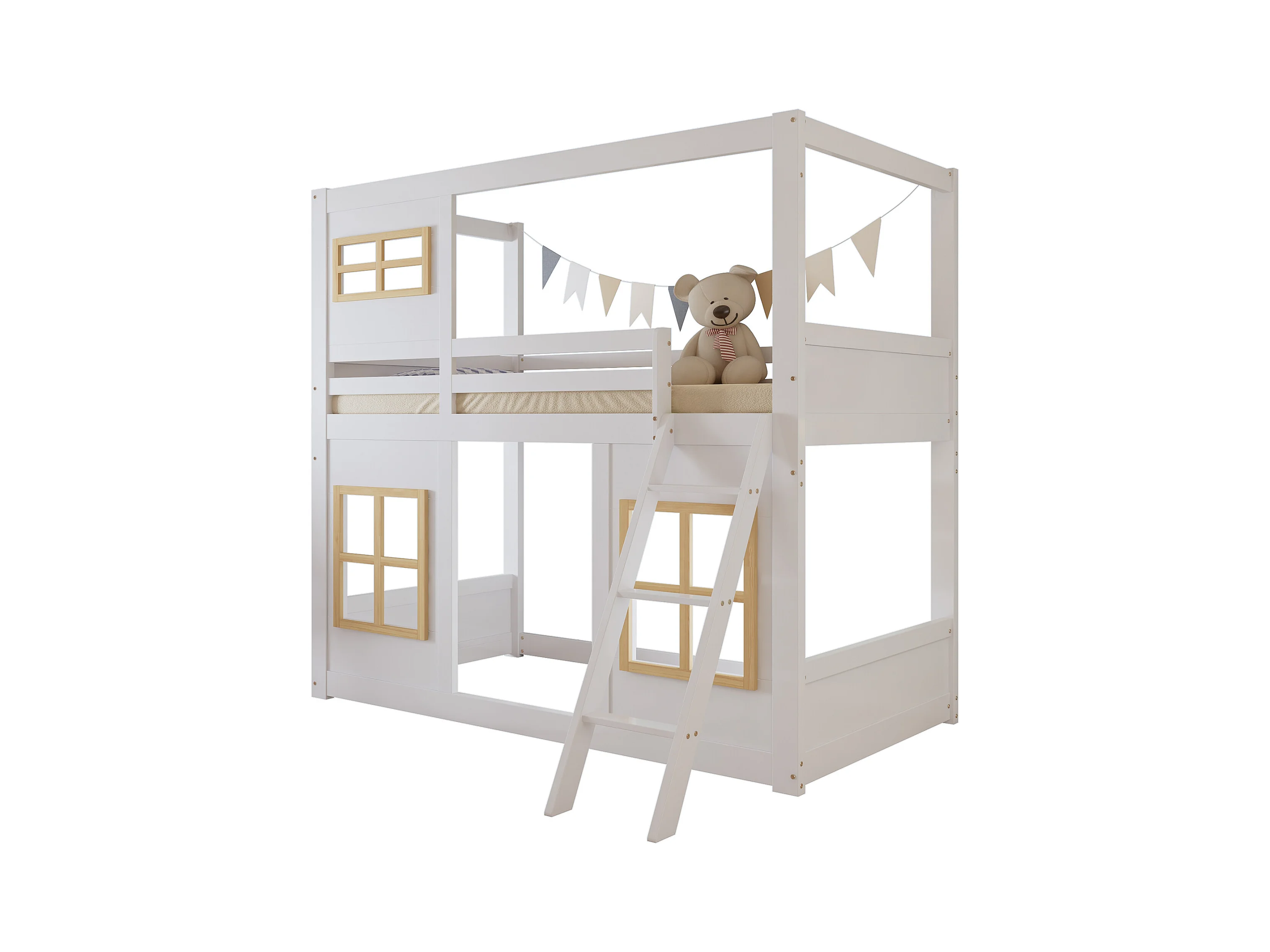 Lit superposé enfant avec fenêtres, échelle stable, barrières, pin+MDF+CP, blanc+naturel (205x152.5x185cm)