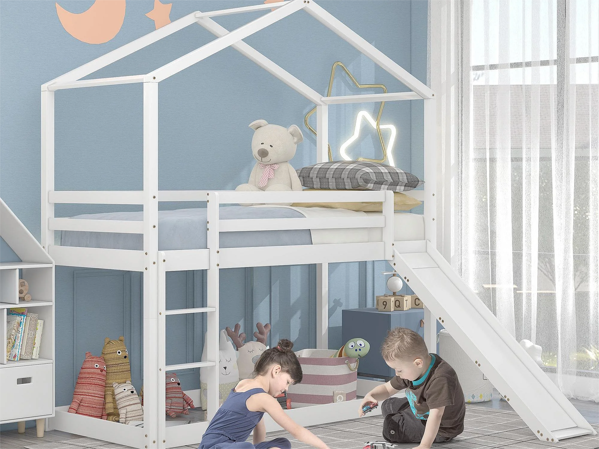 Lit superposé enfant avec toboggan - 90 x 200 cm - bois massif - sommier à lattes seule en dessus - blanc