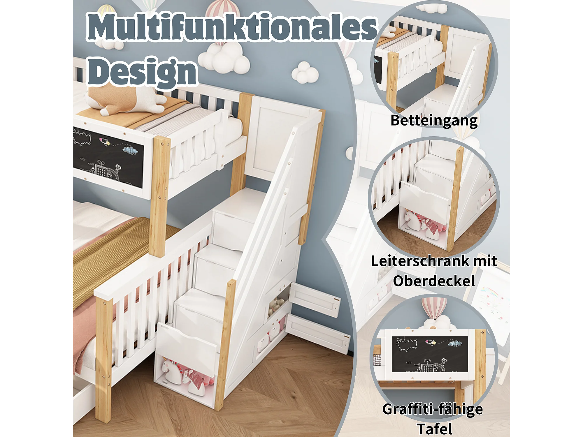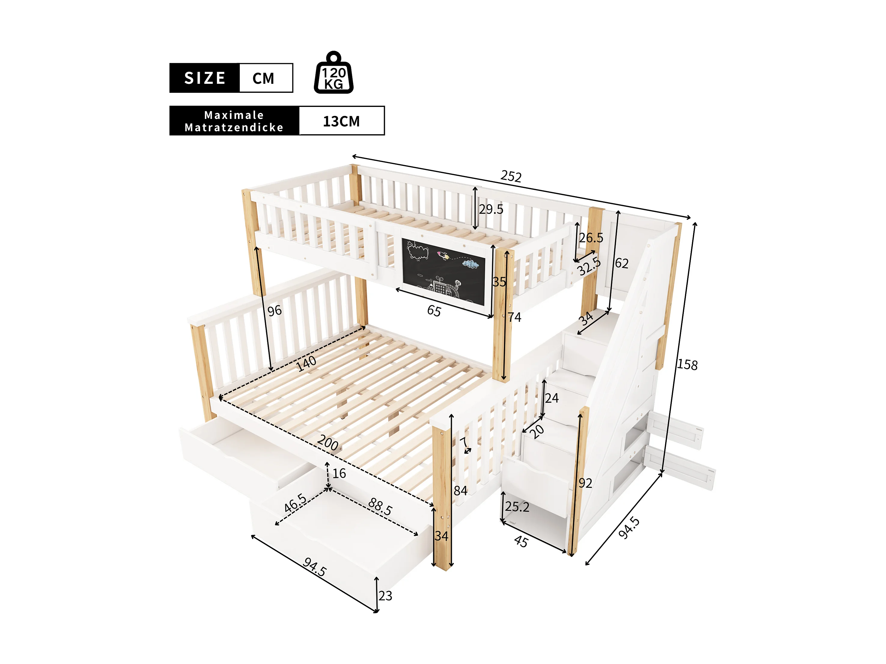 Lit superposé enfant, multifonctionnel avec tableau et tiroirs, bois massif, blanc + chêne clair (90x200 + 140x200 cm)