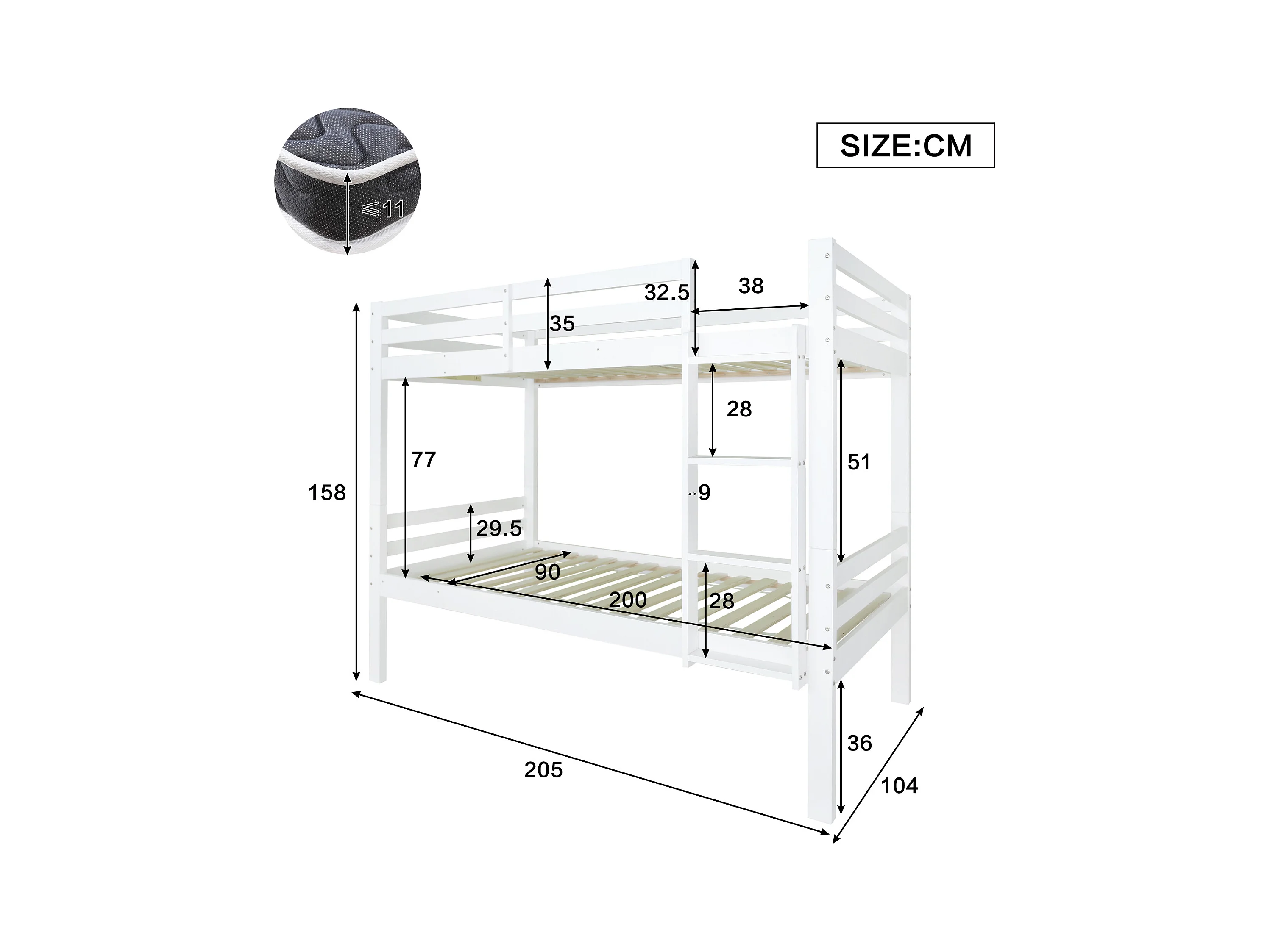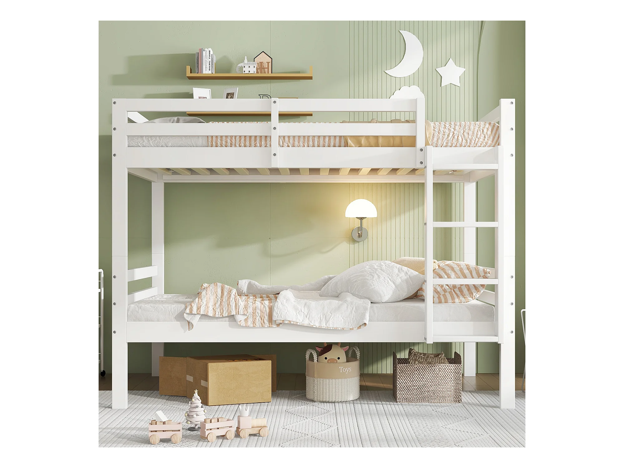 Lit superposé bas 90x200 cm pour enfants, avec échelle stable, cadre en bois massif, design épuré, idéal pour petites chambres, coloris blanc