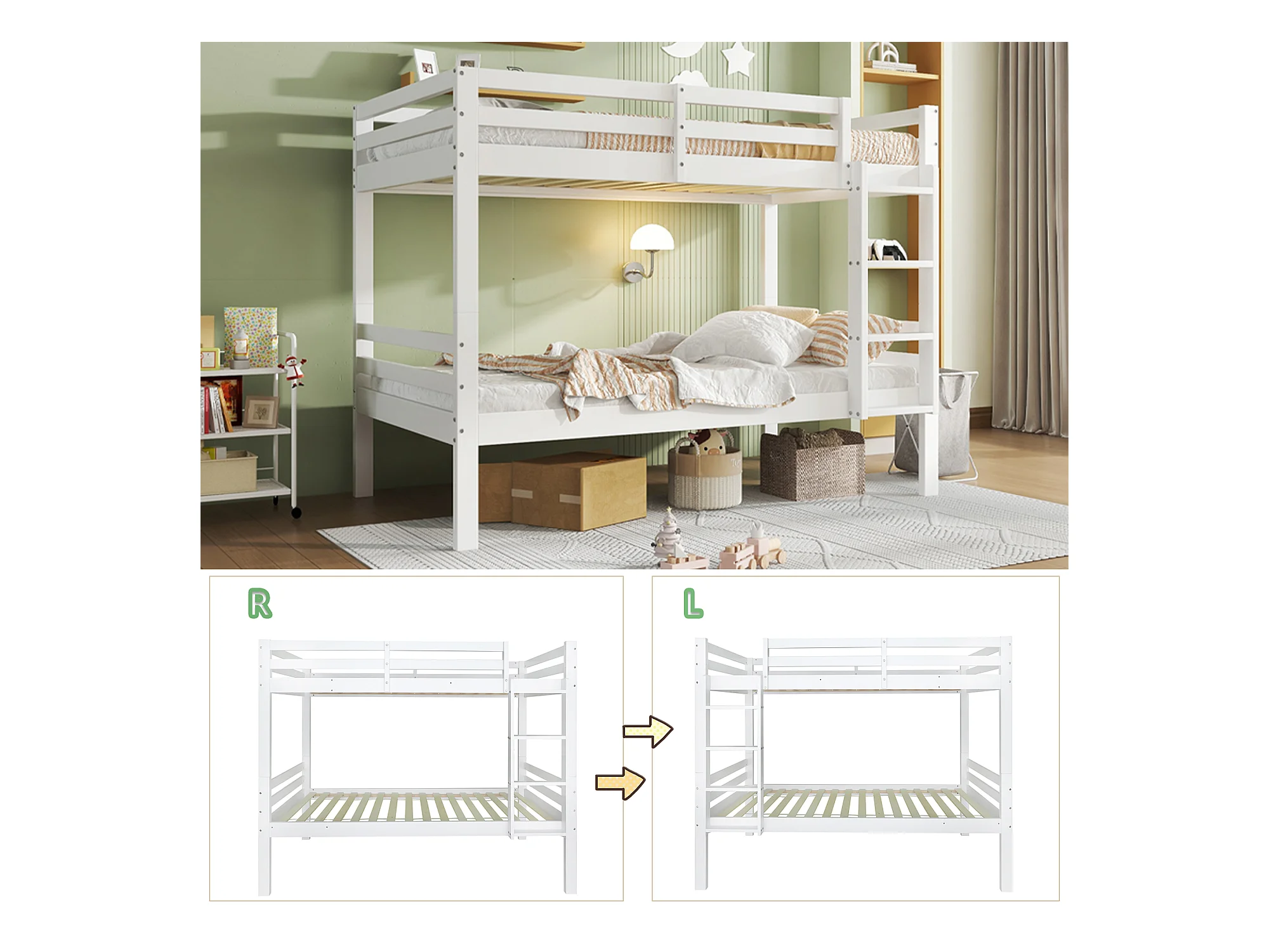 Lit superposé enfants, avec échelle angulaire, protection anti-chutes, 2 lits simples, cadre pin, blanc.