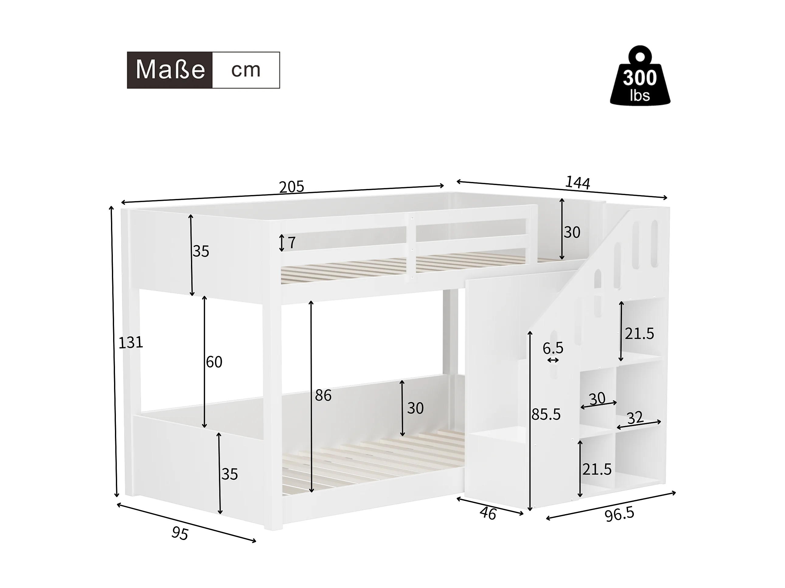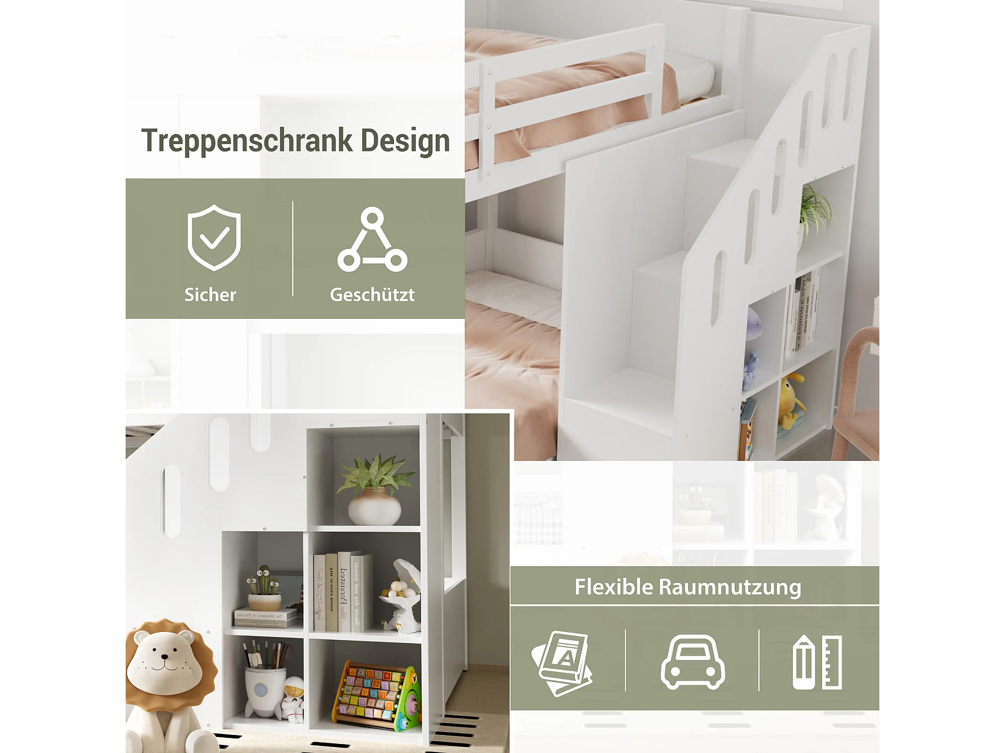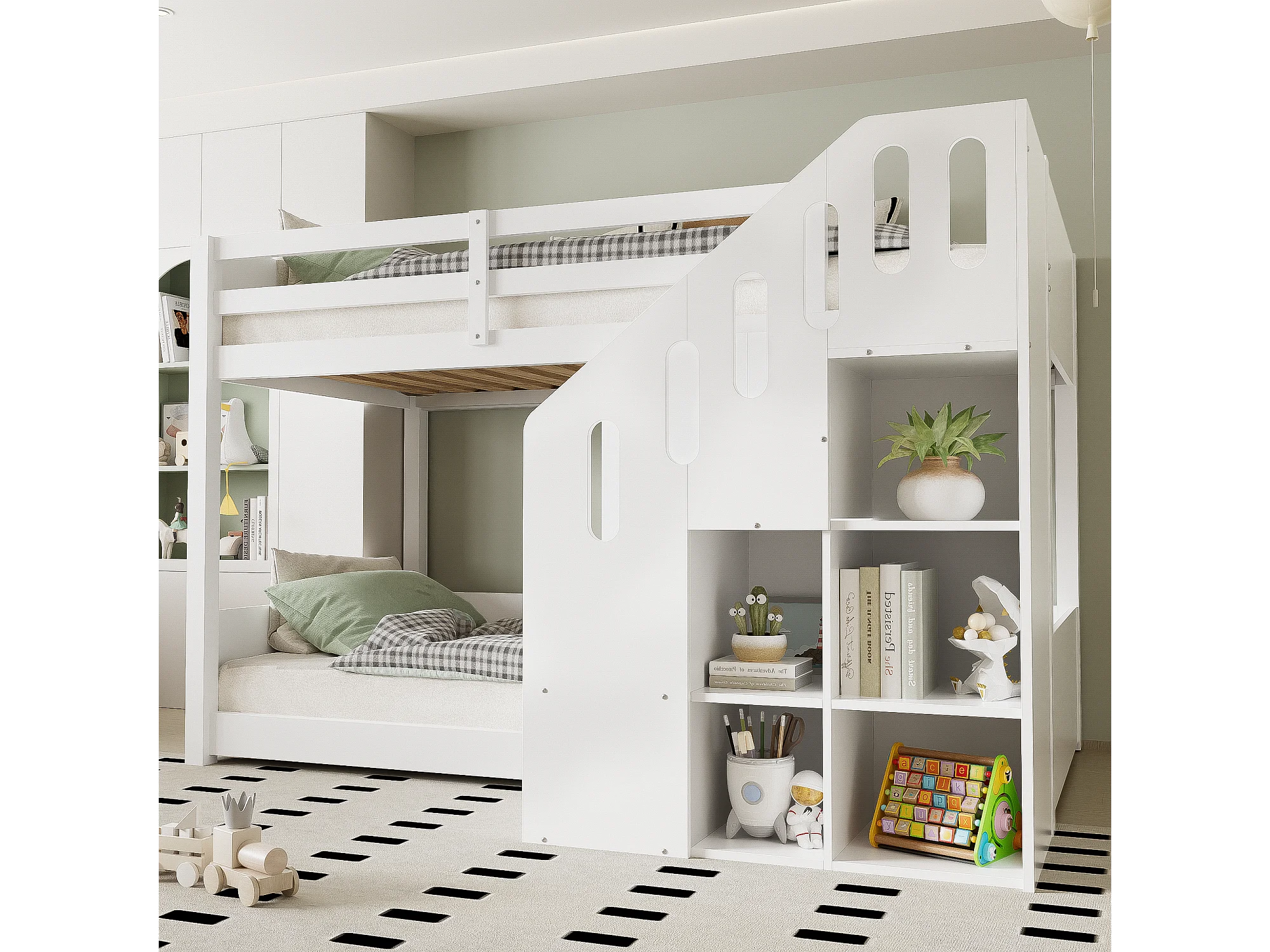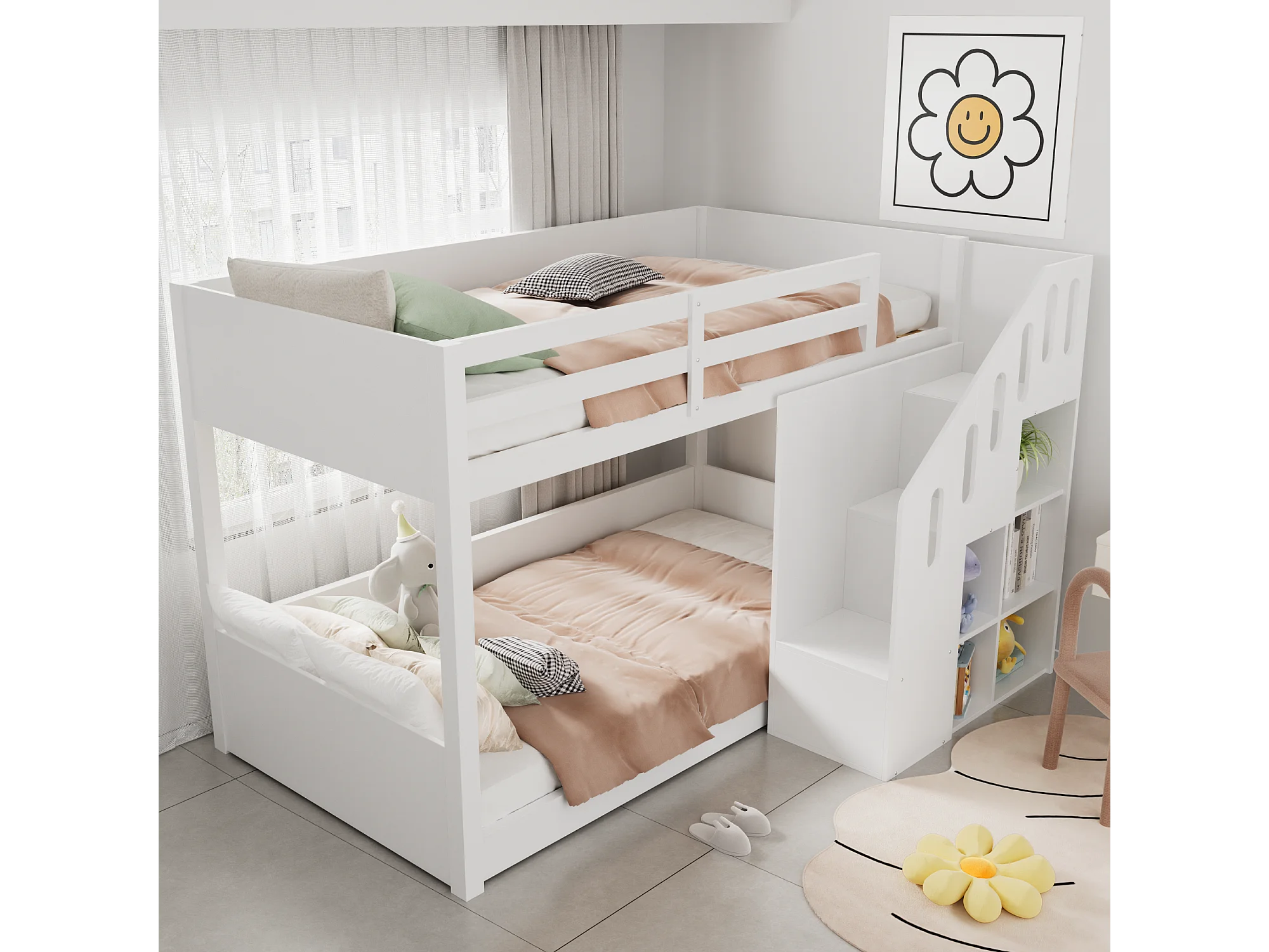 Lit superposé multifonctionnel pour enfants, avec escalier et rangements, en bois massif, blanc (L 90 x l 200 cm)