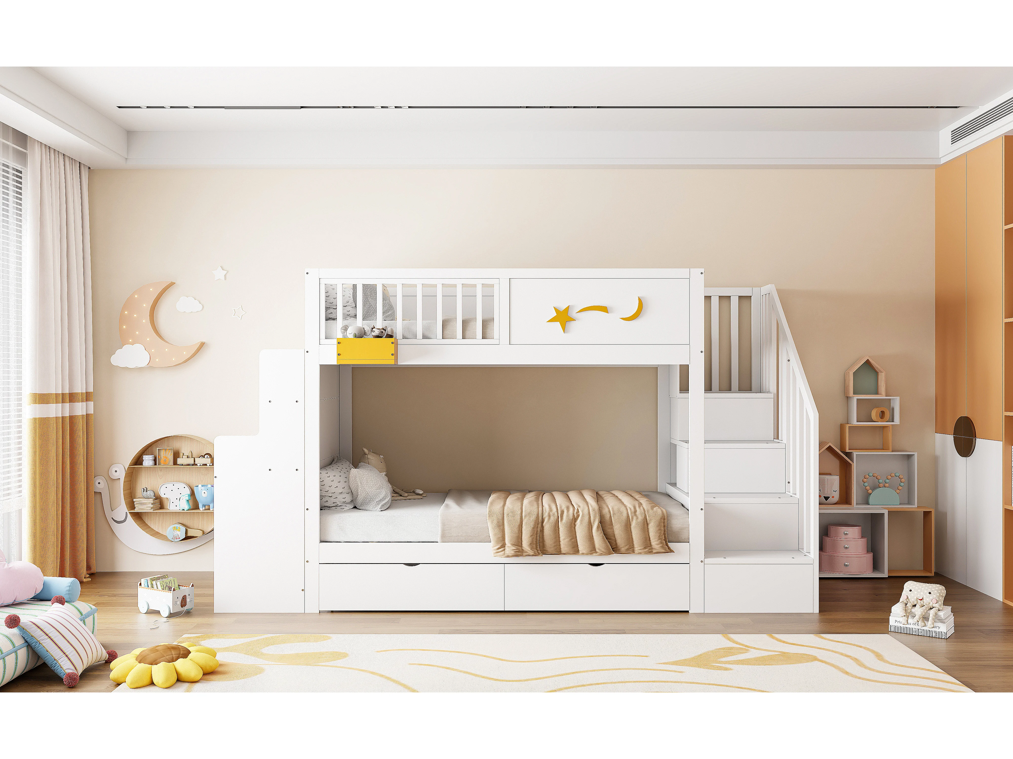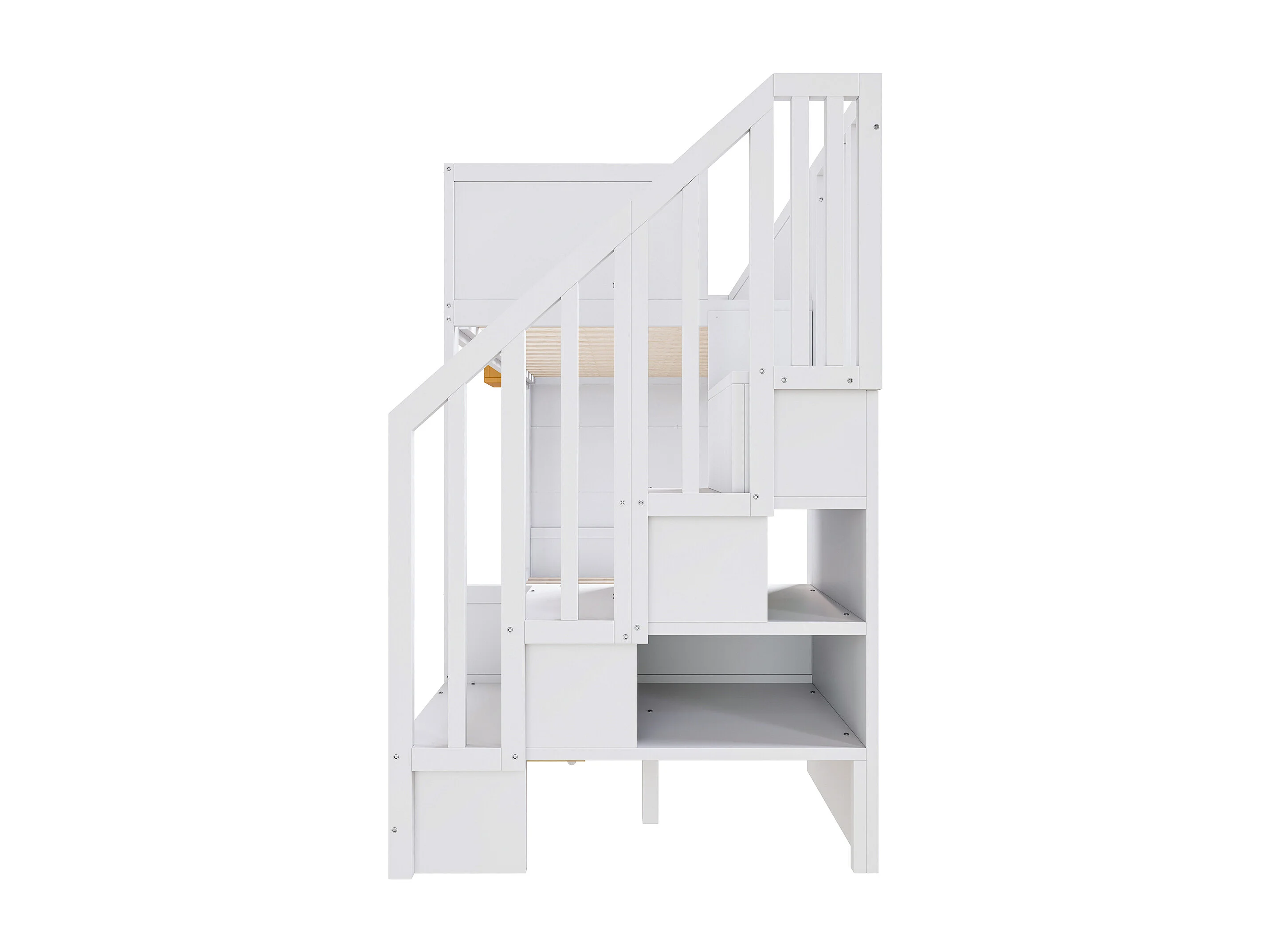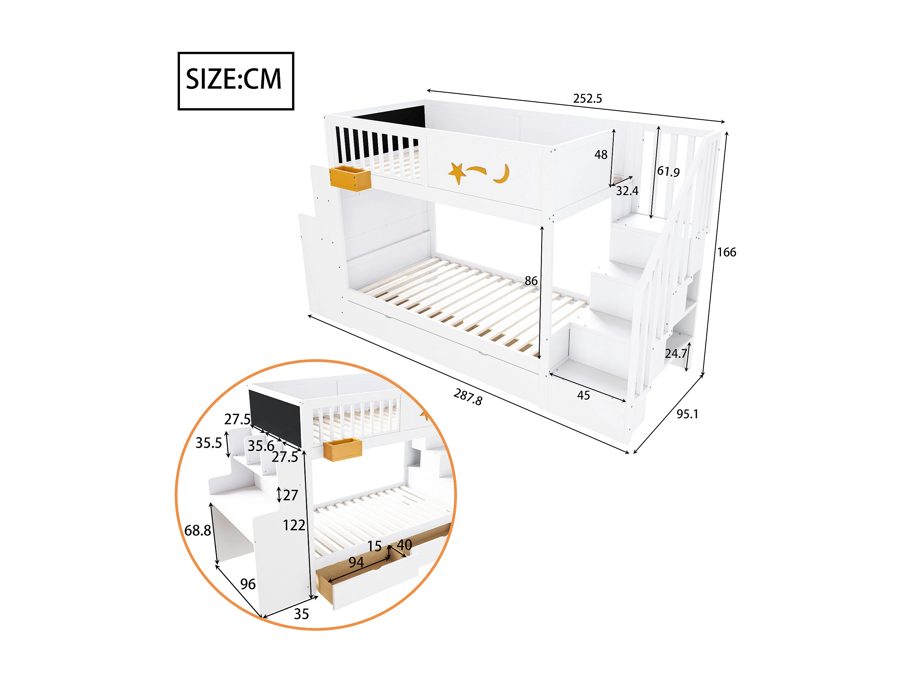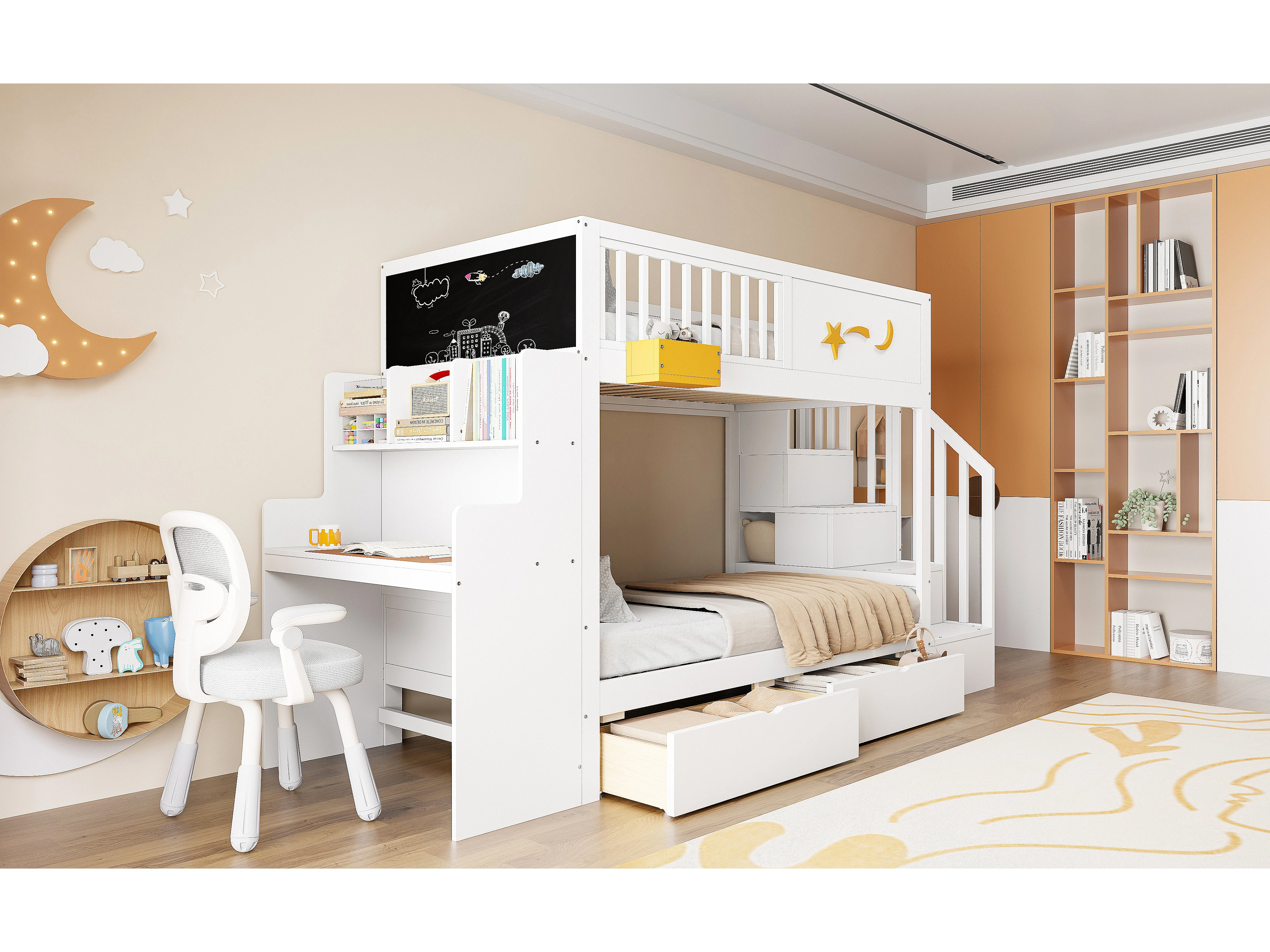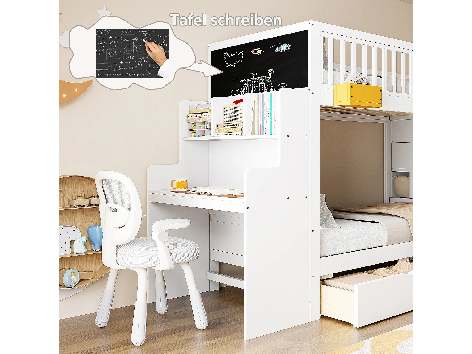 Lit superposé pour enfant - 2 x 90 x 200 cm - avec tiroirs + escalier de rangement + bureau - pin massif - blanc