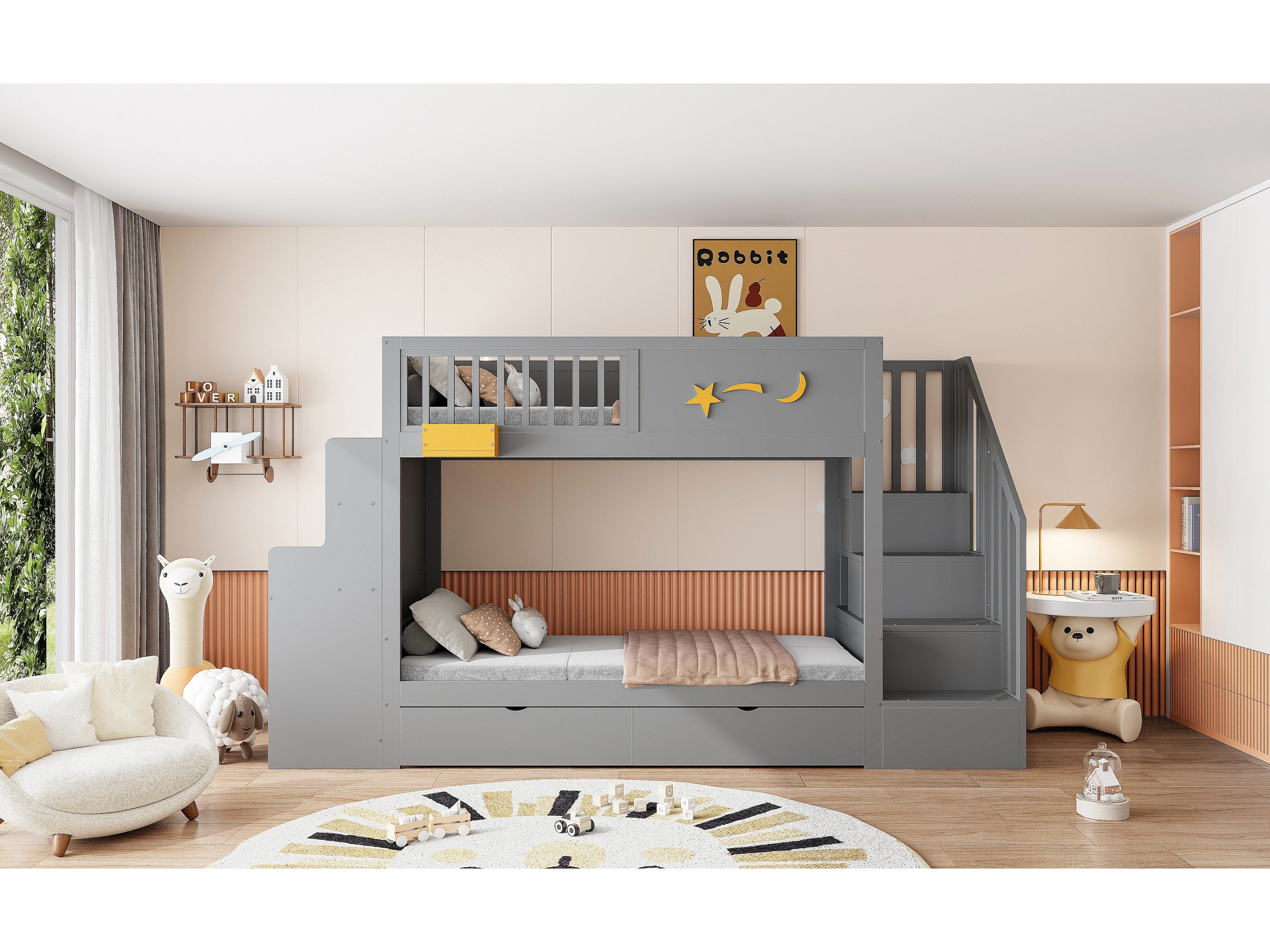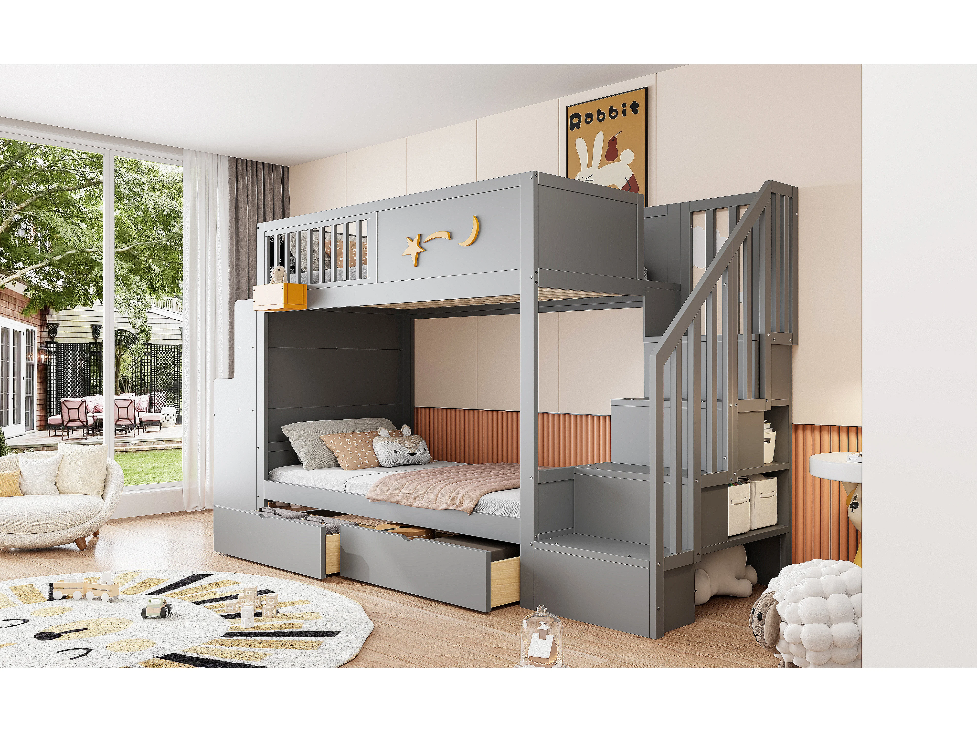 Lit superposé pour enfant - 2 x 90 x 200 cm - avec tiroirs + escalier de rangement + bureau - pin massif - gris