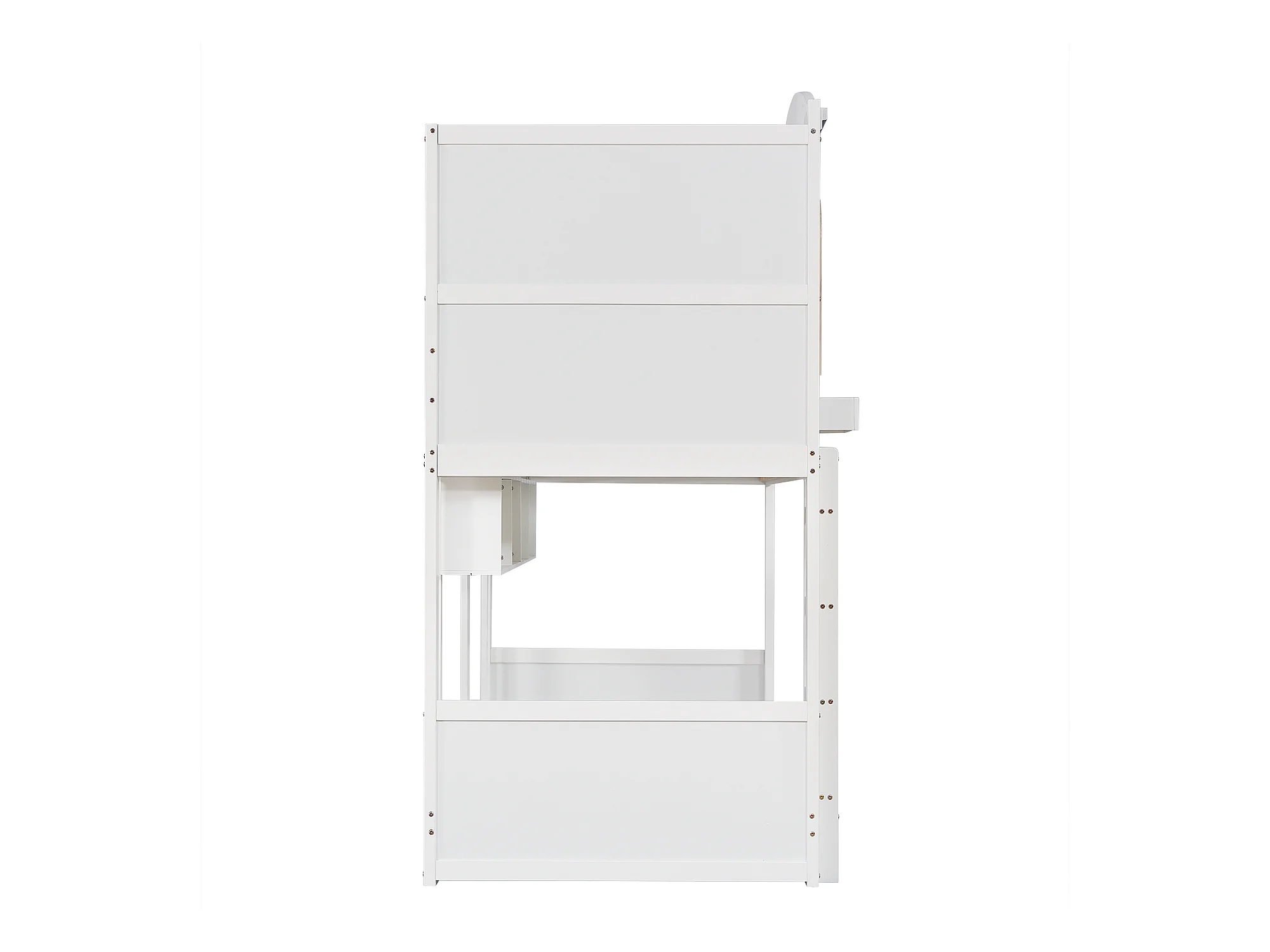 Lit superposé pour enfant, échelle 3 marches, sommier à lattes robuste, étagère, barrière de sécurité, 2 tiroirs, bureau, pin+MDF, blanc, 90x200cm