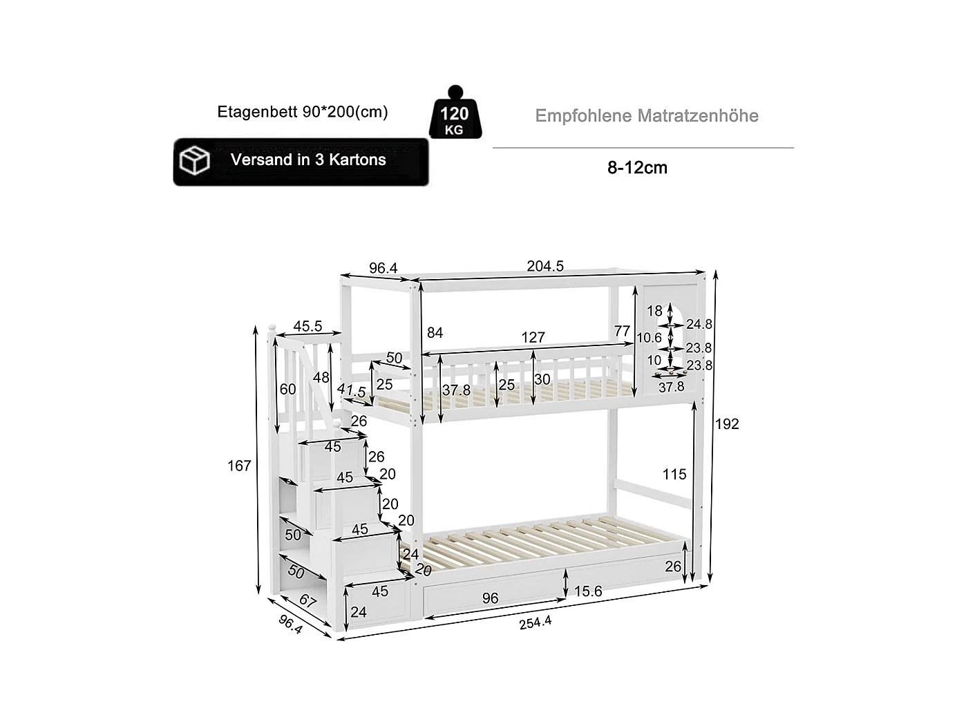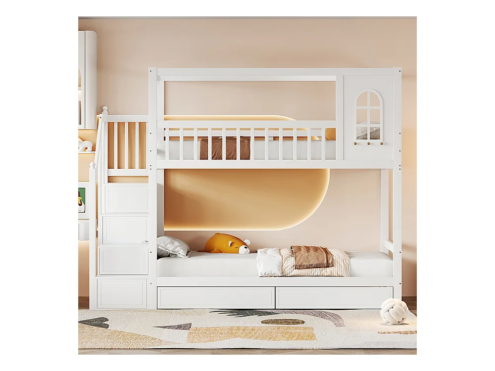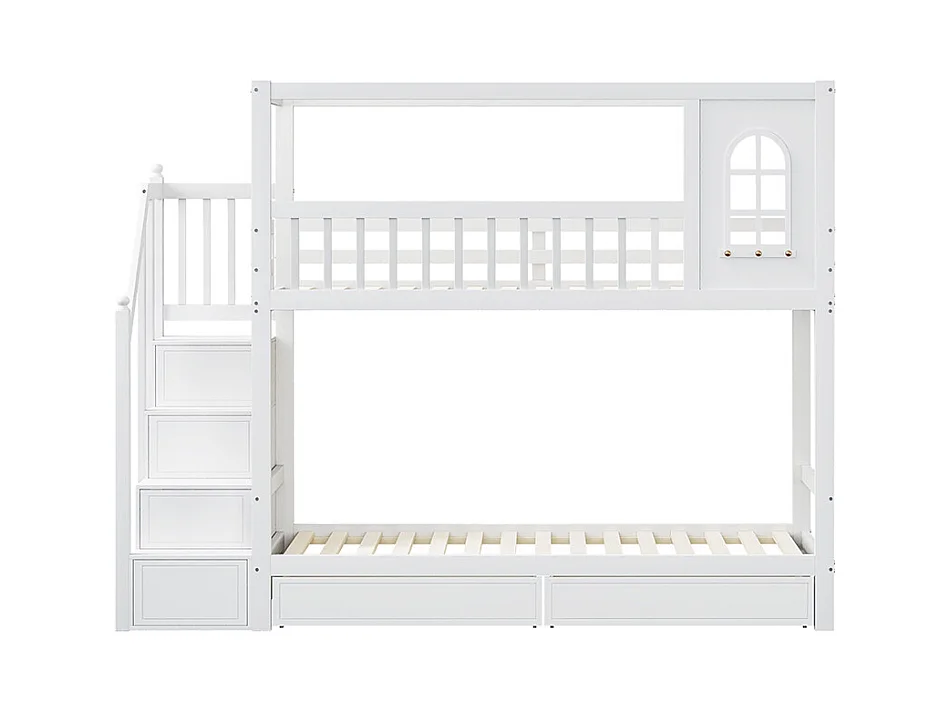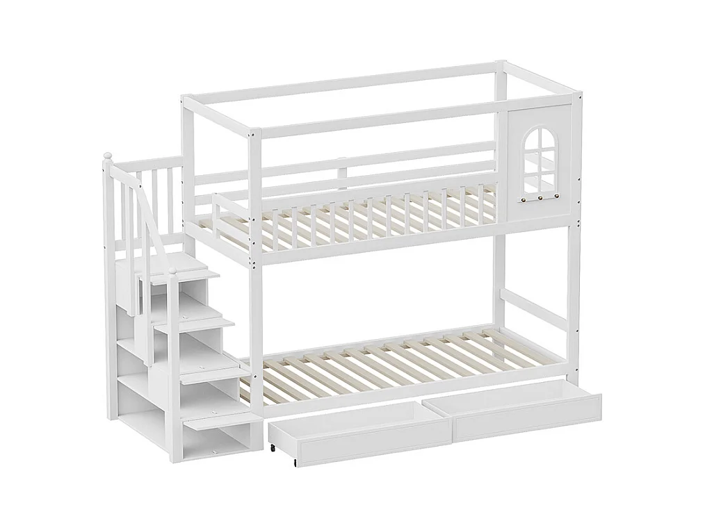 Lit superposé pour enfants 90*200 cm, forme maison avec fenêtre, avec tiroirs de rangement et échelle de sécurité, blanc