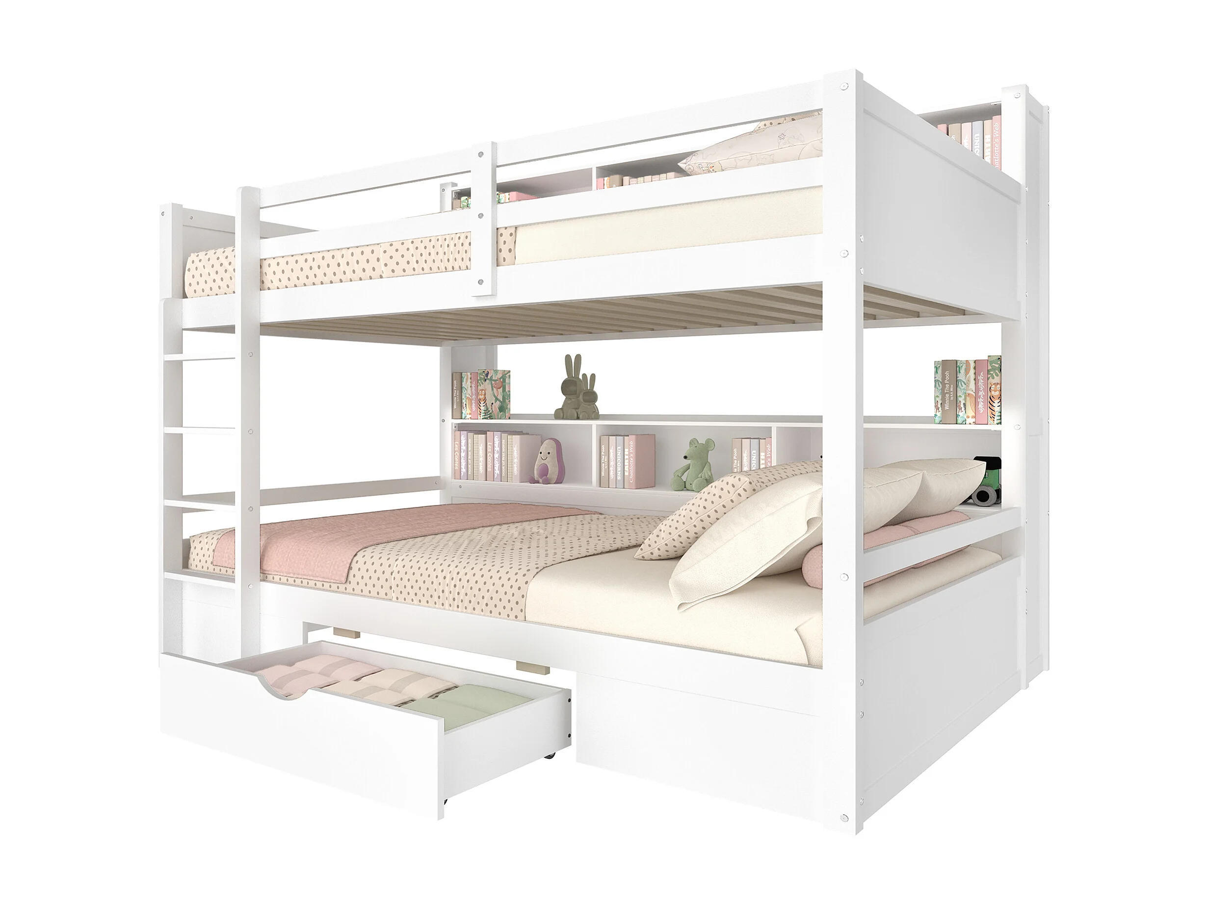 Lit superposé pour enfants, 90x200 cm, avec rangements, tiroirs et étagères, bois massif, blanc