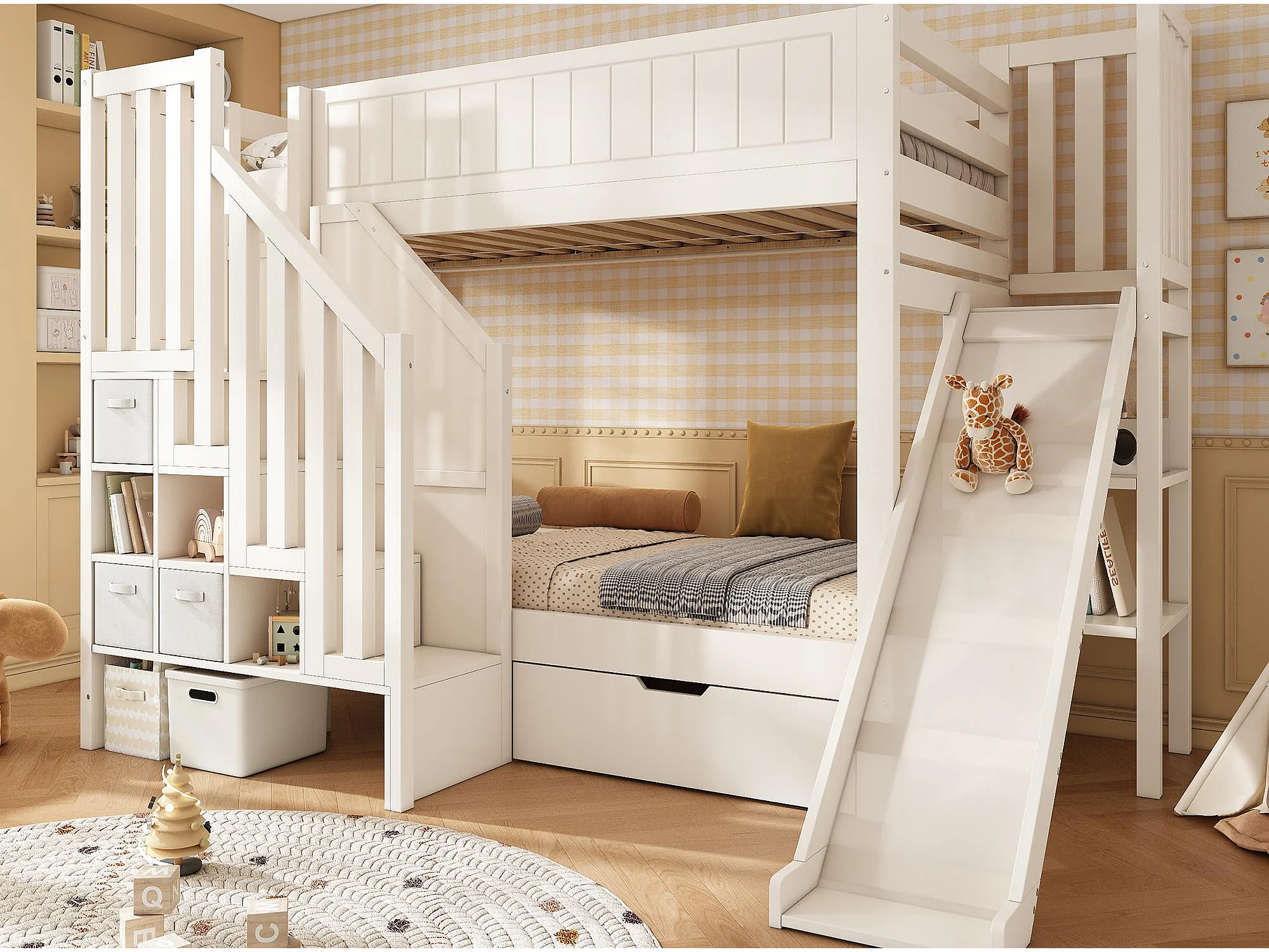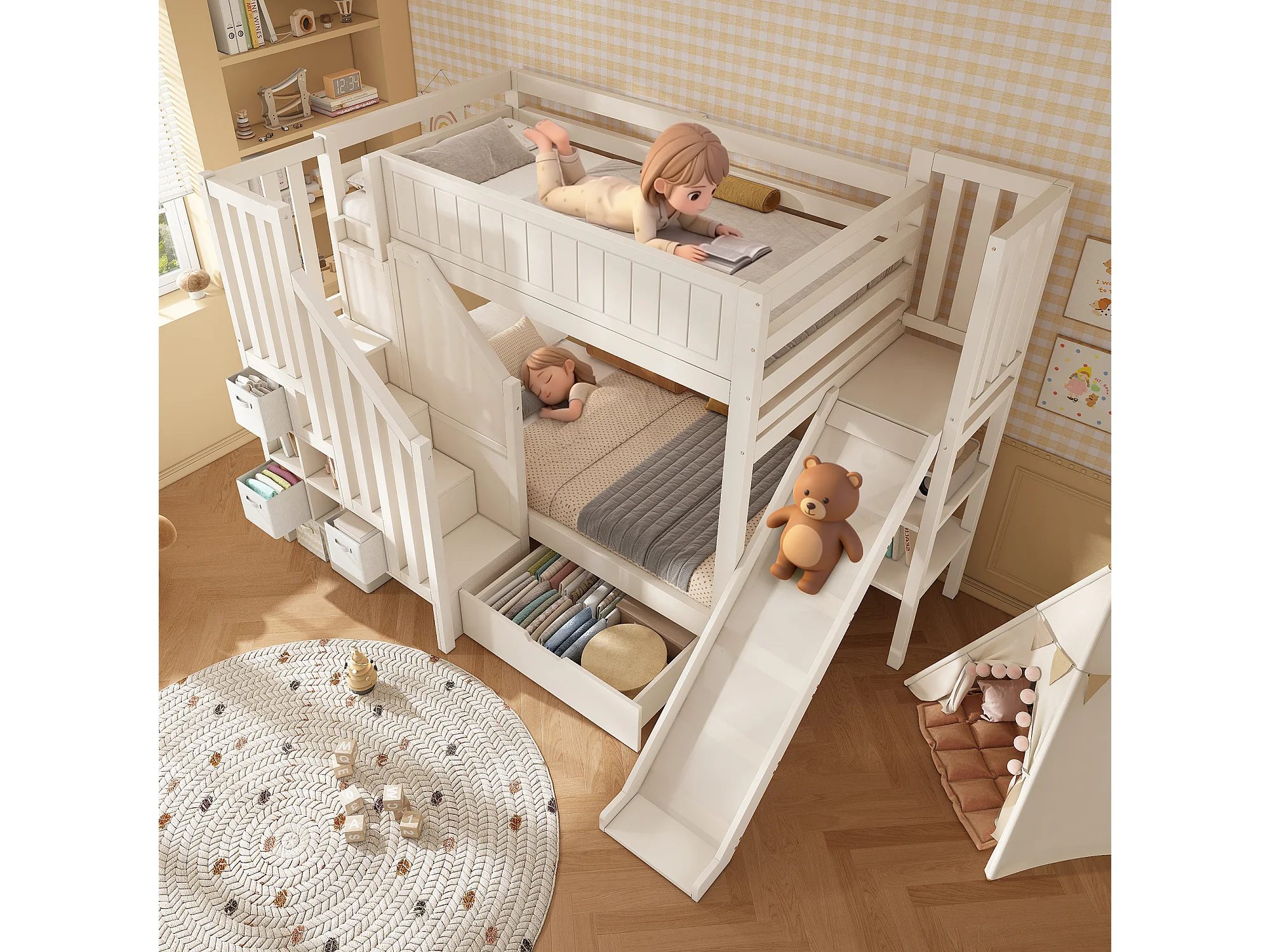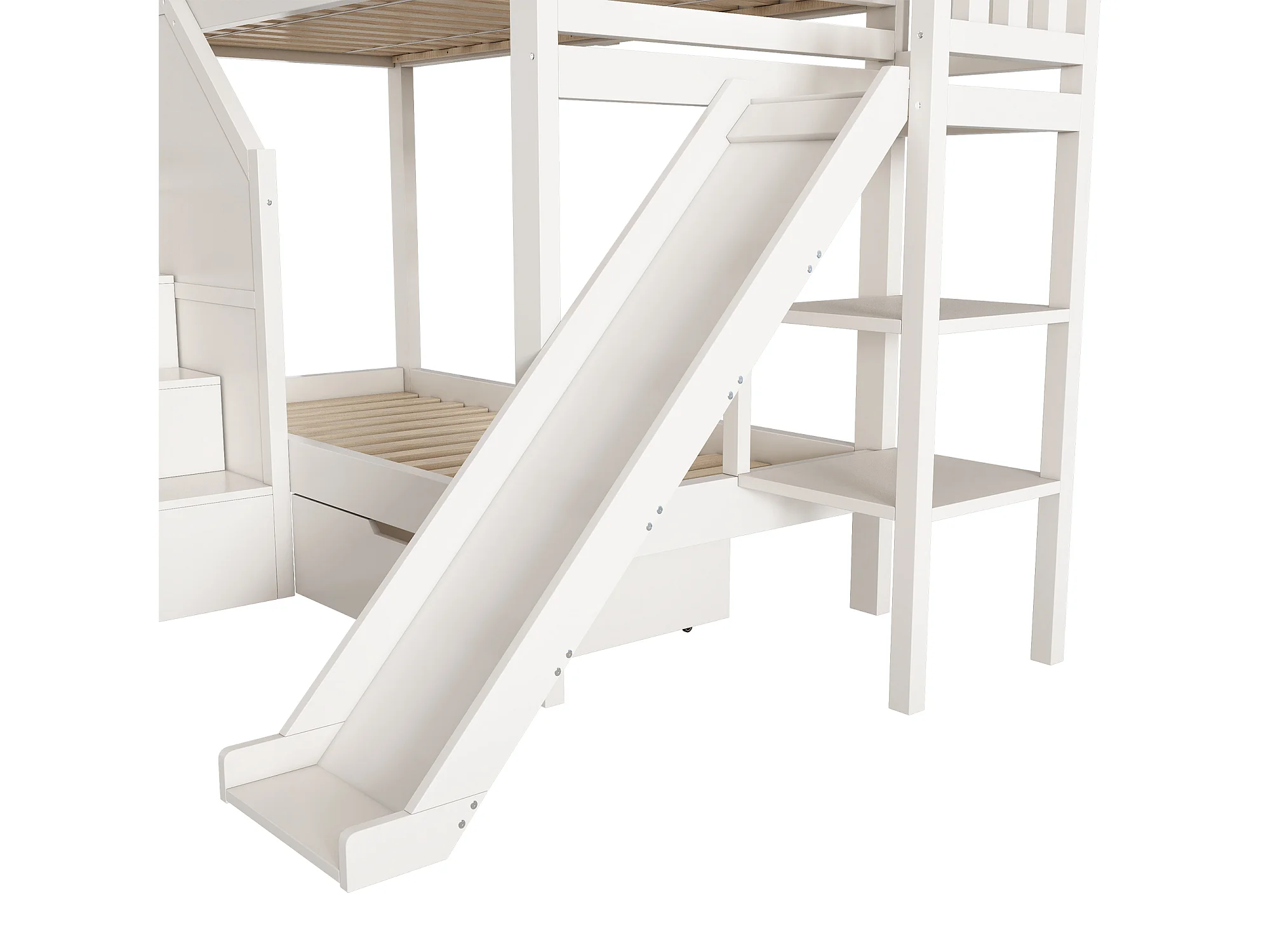 Lit superposé pour enfants 90x200cm - avec toboggan et escalier de rangement - avec 1 tiroir et étagères ouvertes - Blanc (matelas non inclus)