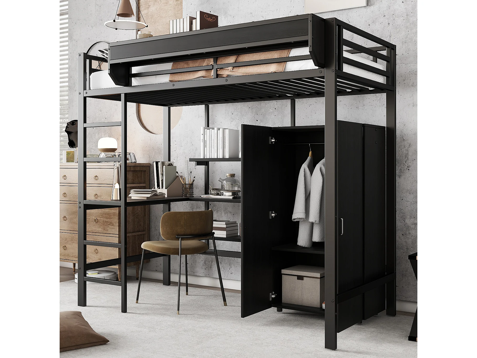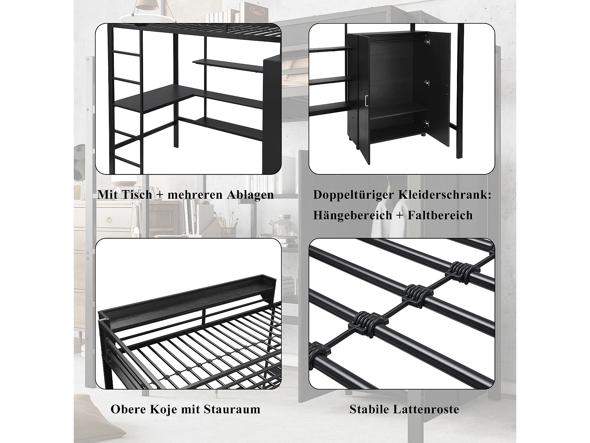Lit superposé pour enfants avec bureau et armoire, cadre en métal et bois, noir et bois foncé, 90x200 cm