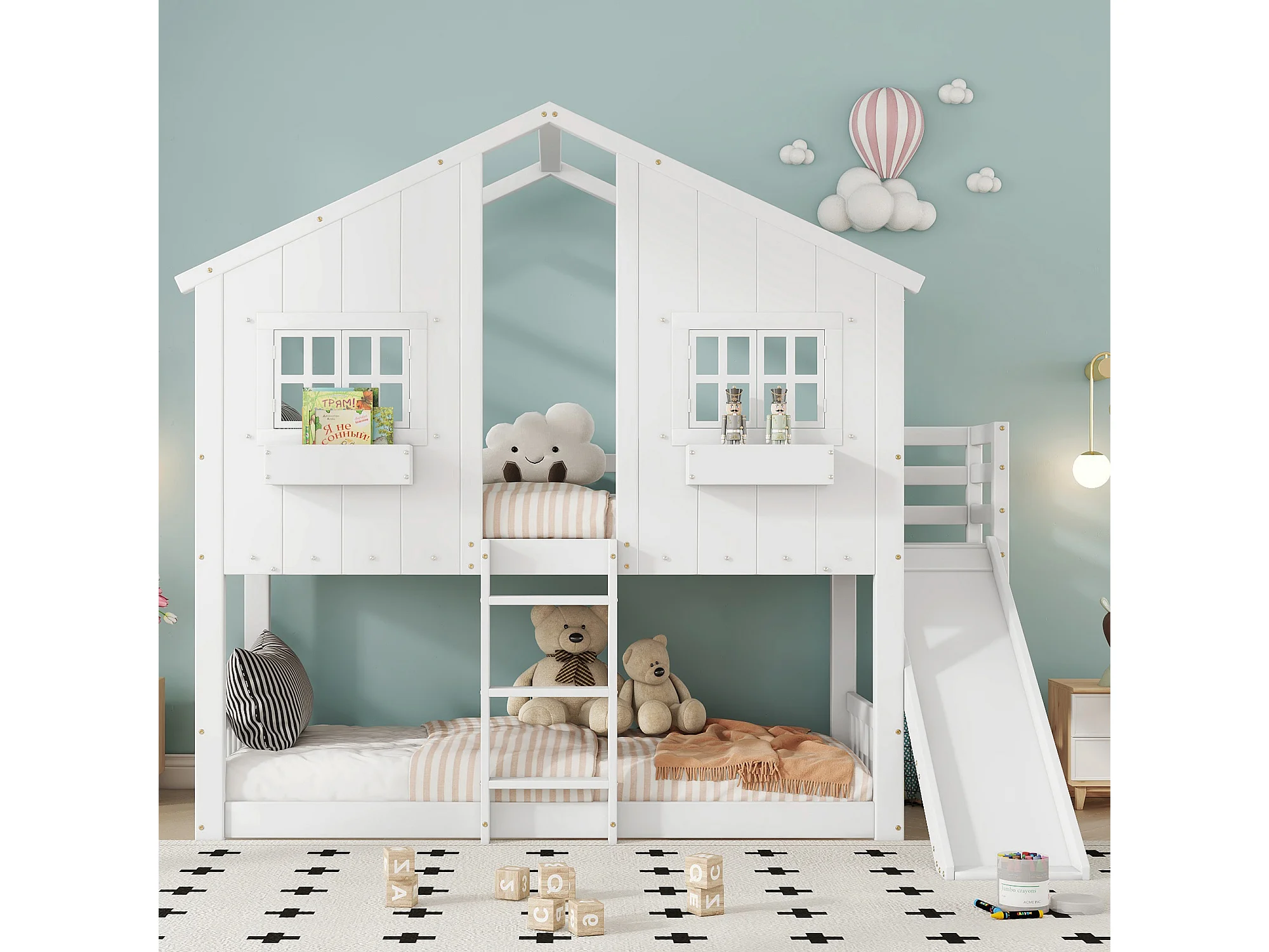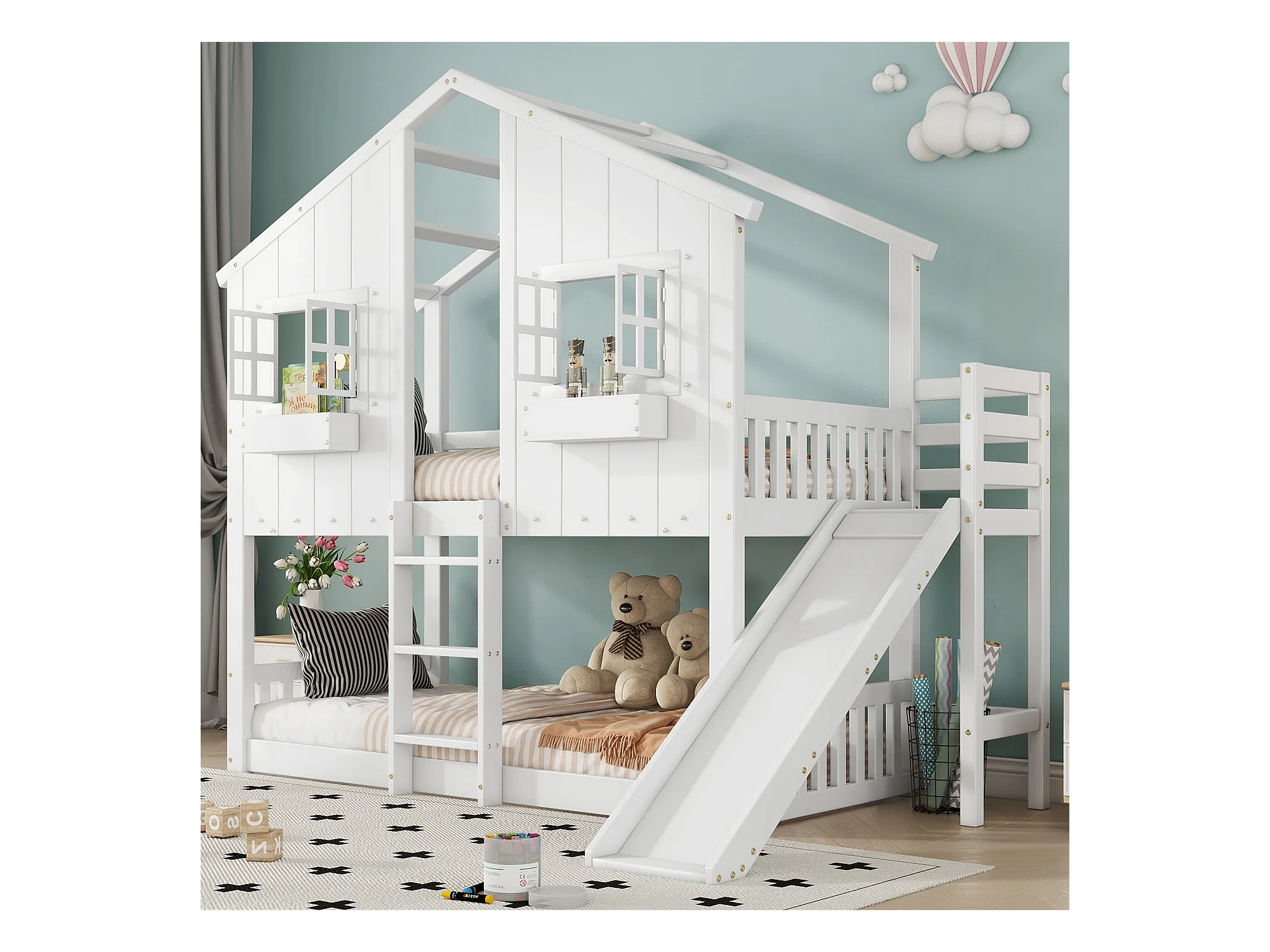Lit superposé pour enfants, avec toboggan, toit et fenêtres, garde-corps de sécurité, échelle à 3 marches, bois massif + MDF, blanc, 90x200 cm
