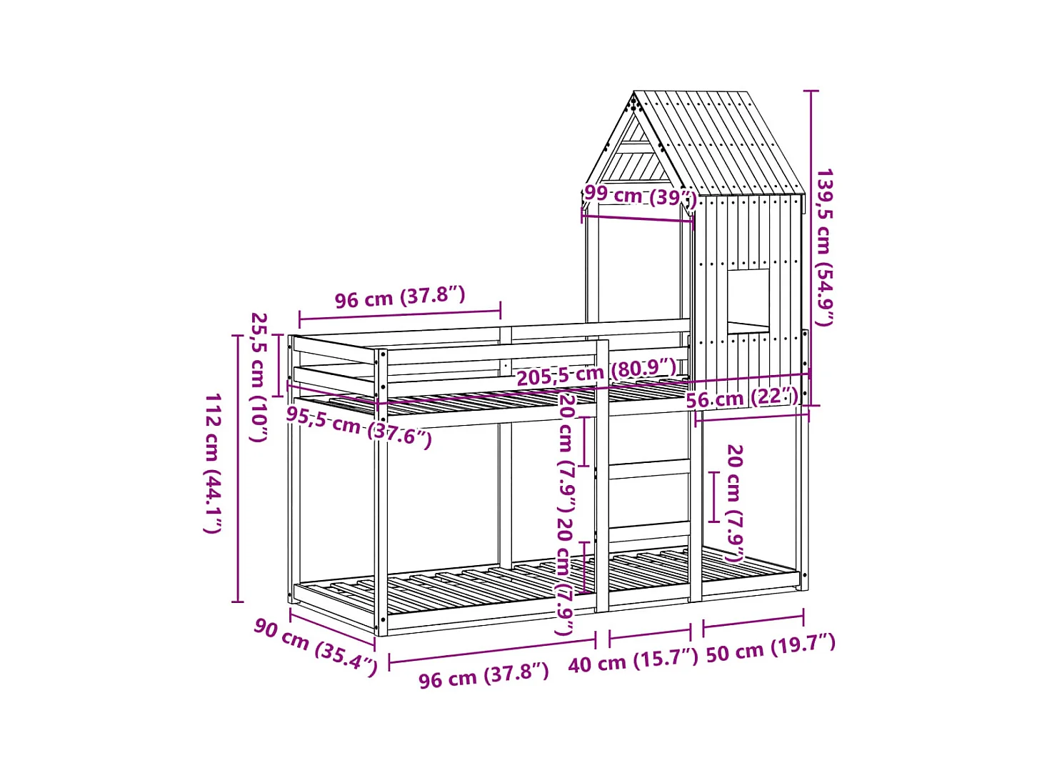 Lit superposé avec échelle et toit sans matelas 90x200 cm