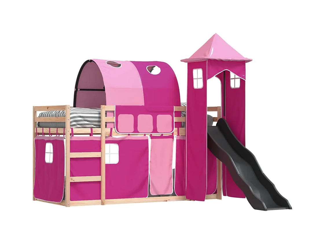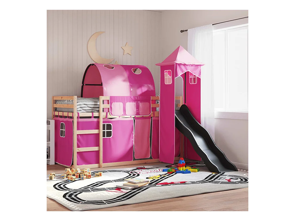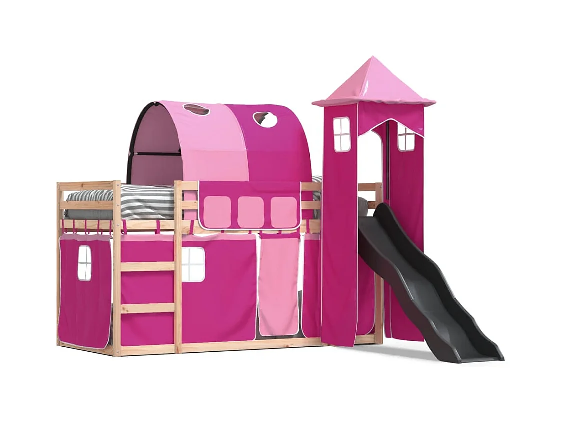 Lit superposé avec toboggan et rideaux rose 90x190 cm FR97371