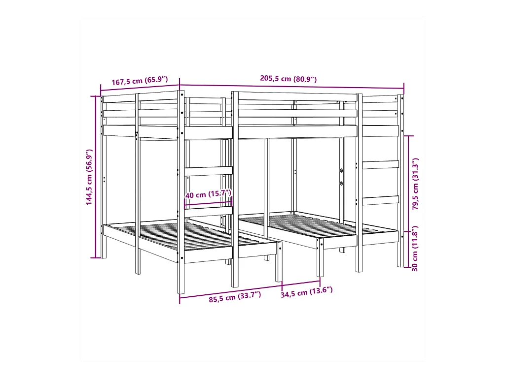 Lit superposé triple 140x200/70x140 cm bois de pin massif