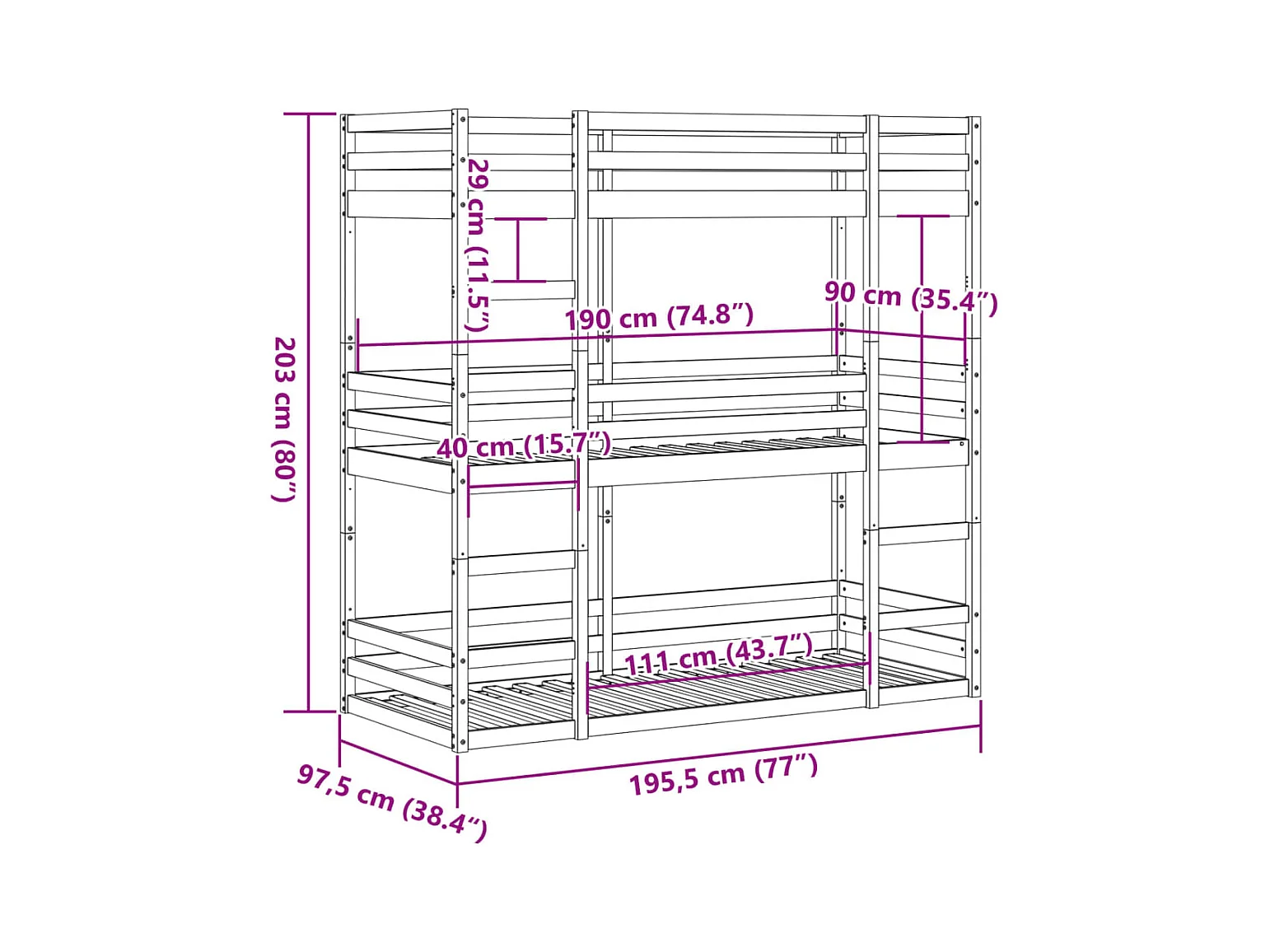 Lit superposé sans matelas blanc 90x190 cm bois de pin massif