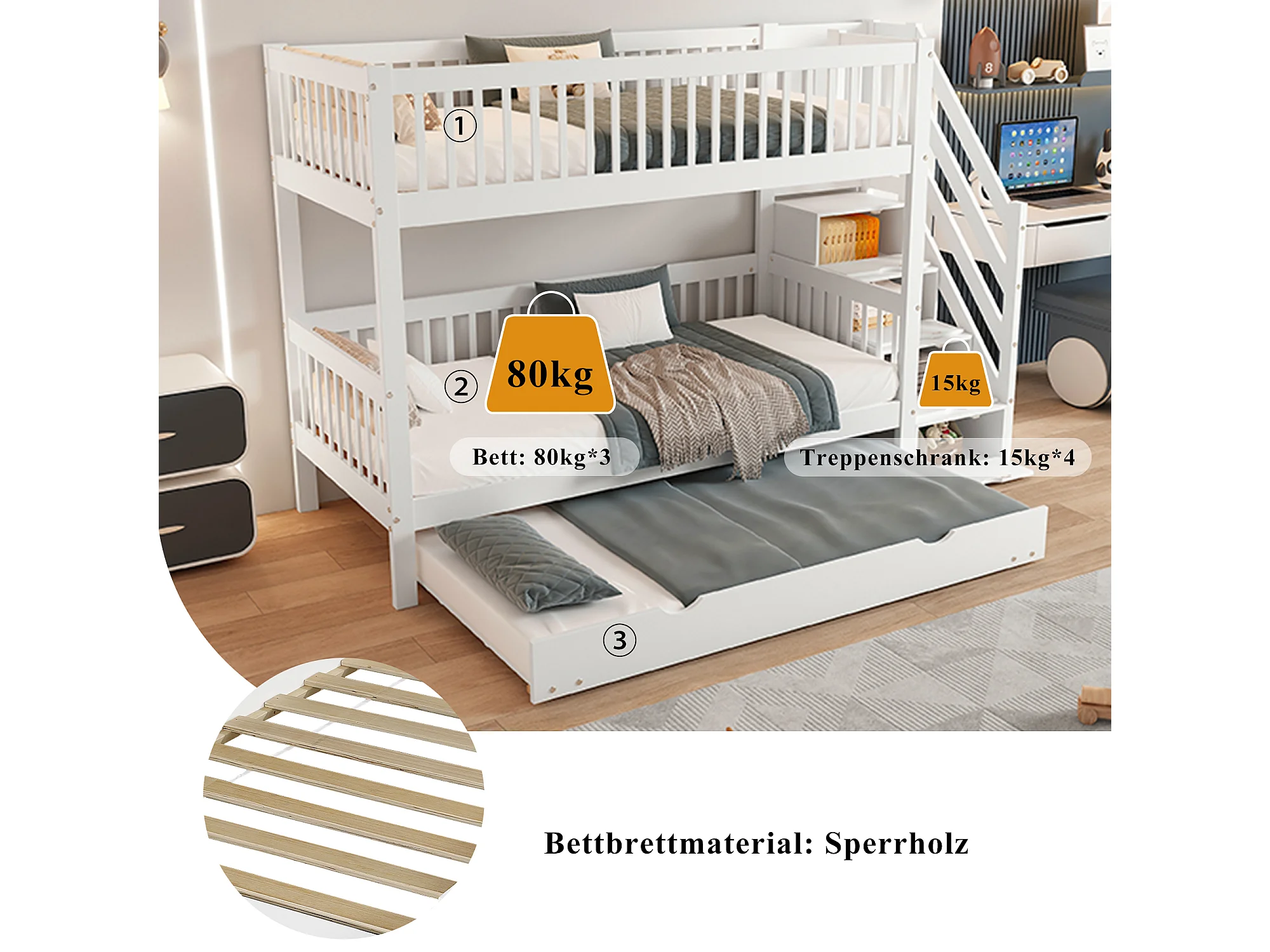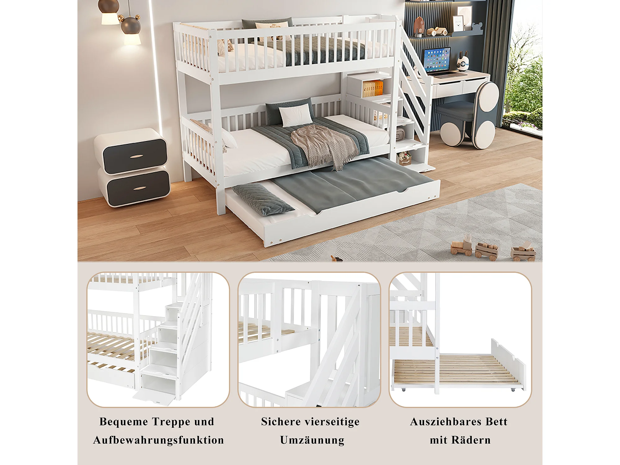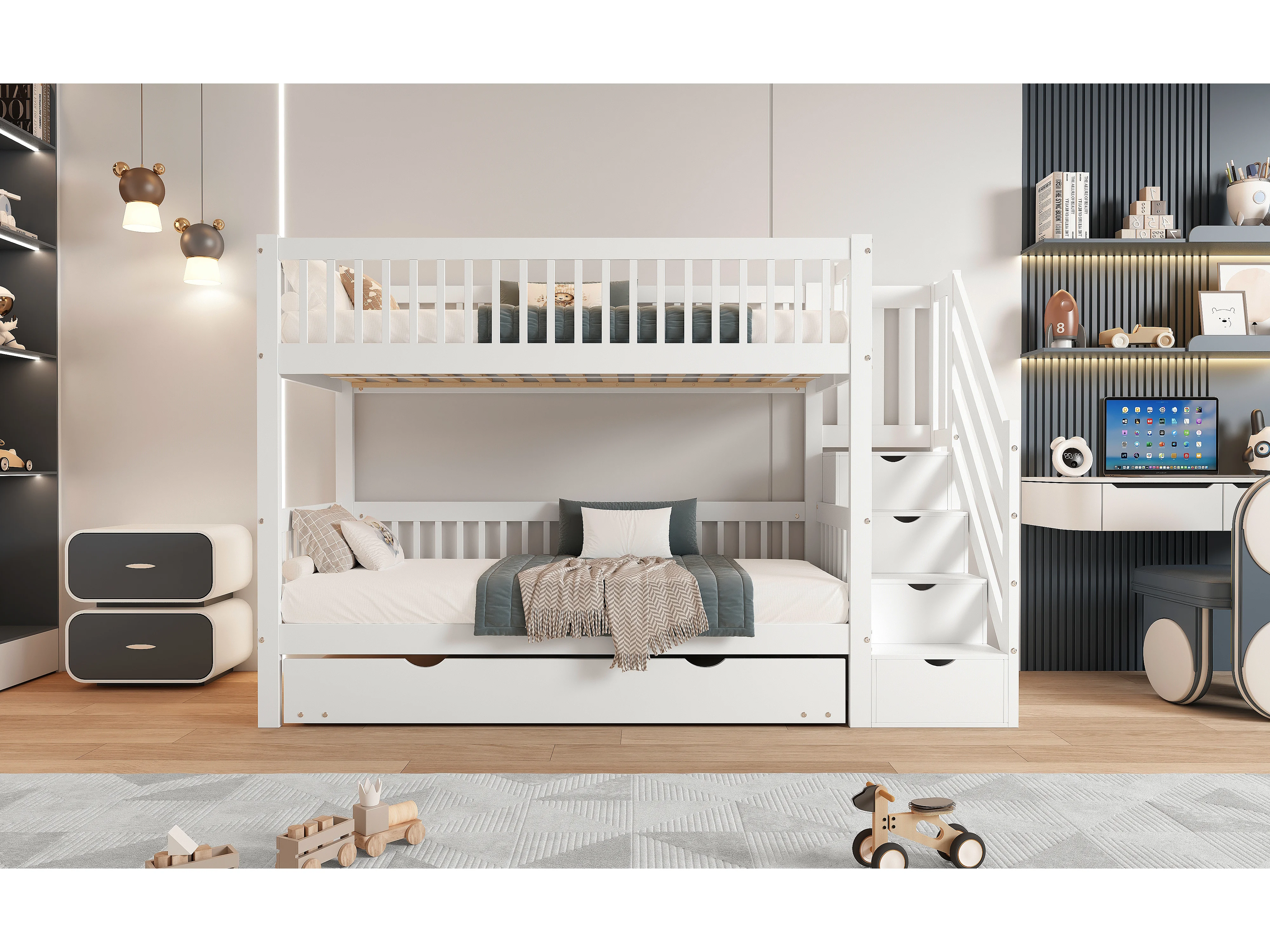Lit superposés - 2 x 90 x 200 cm - avec lit gigogne 90 x 190 cm - escalier de rangement - MDF - blanc