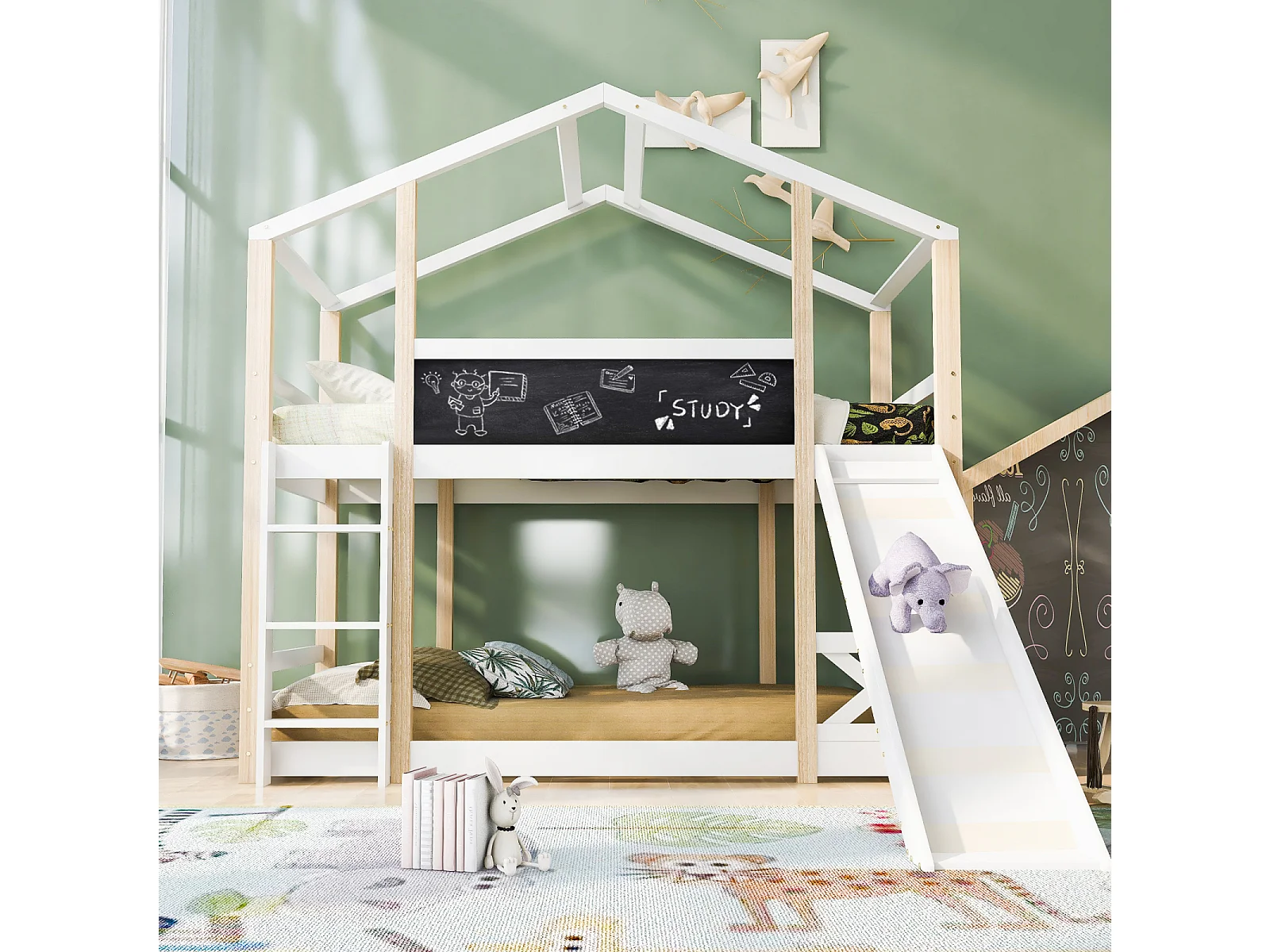 Lit superposés, Adultes, enfants, adolescents Cabane 90 x 200 cm, Toboggan, Échelle Inclinée et Protection Antichute