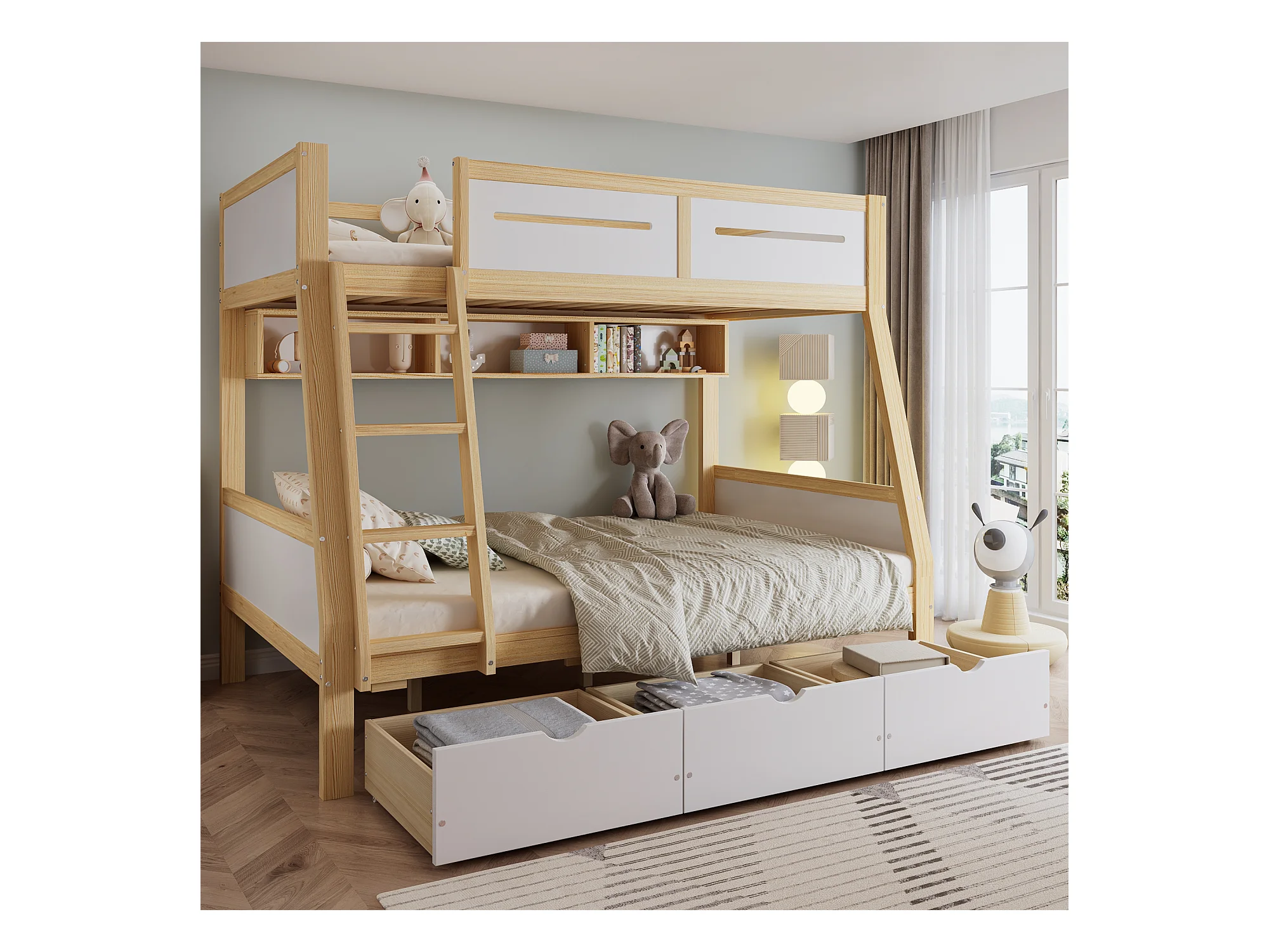 Lit superposés enfant - 90 x 200 cm + 120 x 200 cm - avec 3 tiroirs + clôture - pin + MDF - blanc + naturel