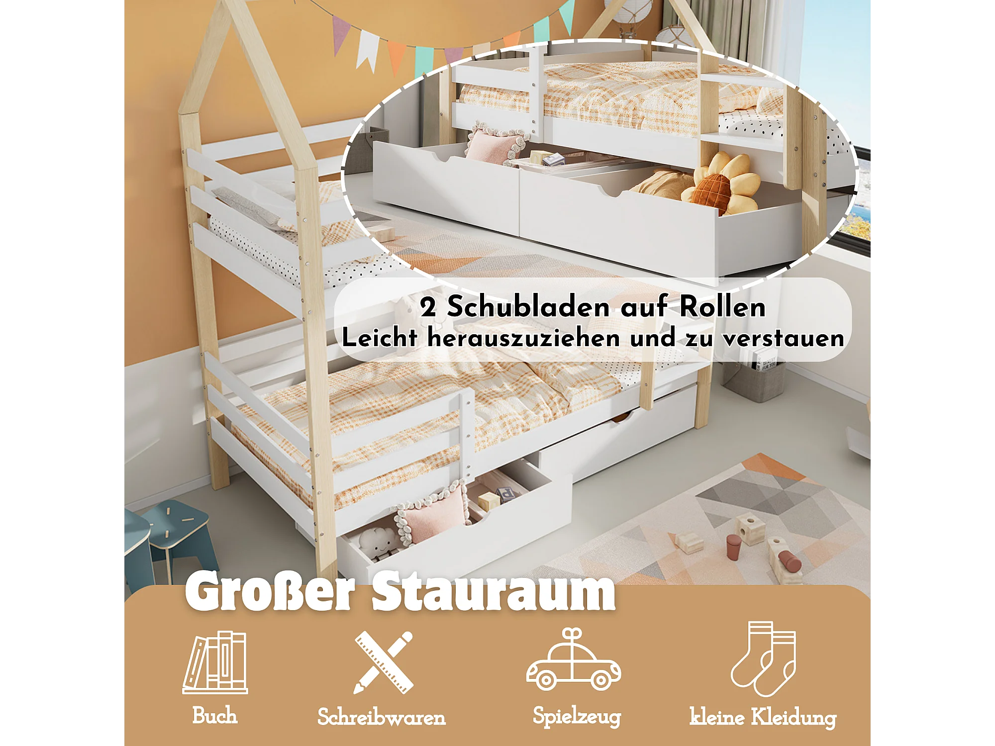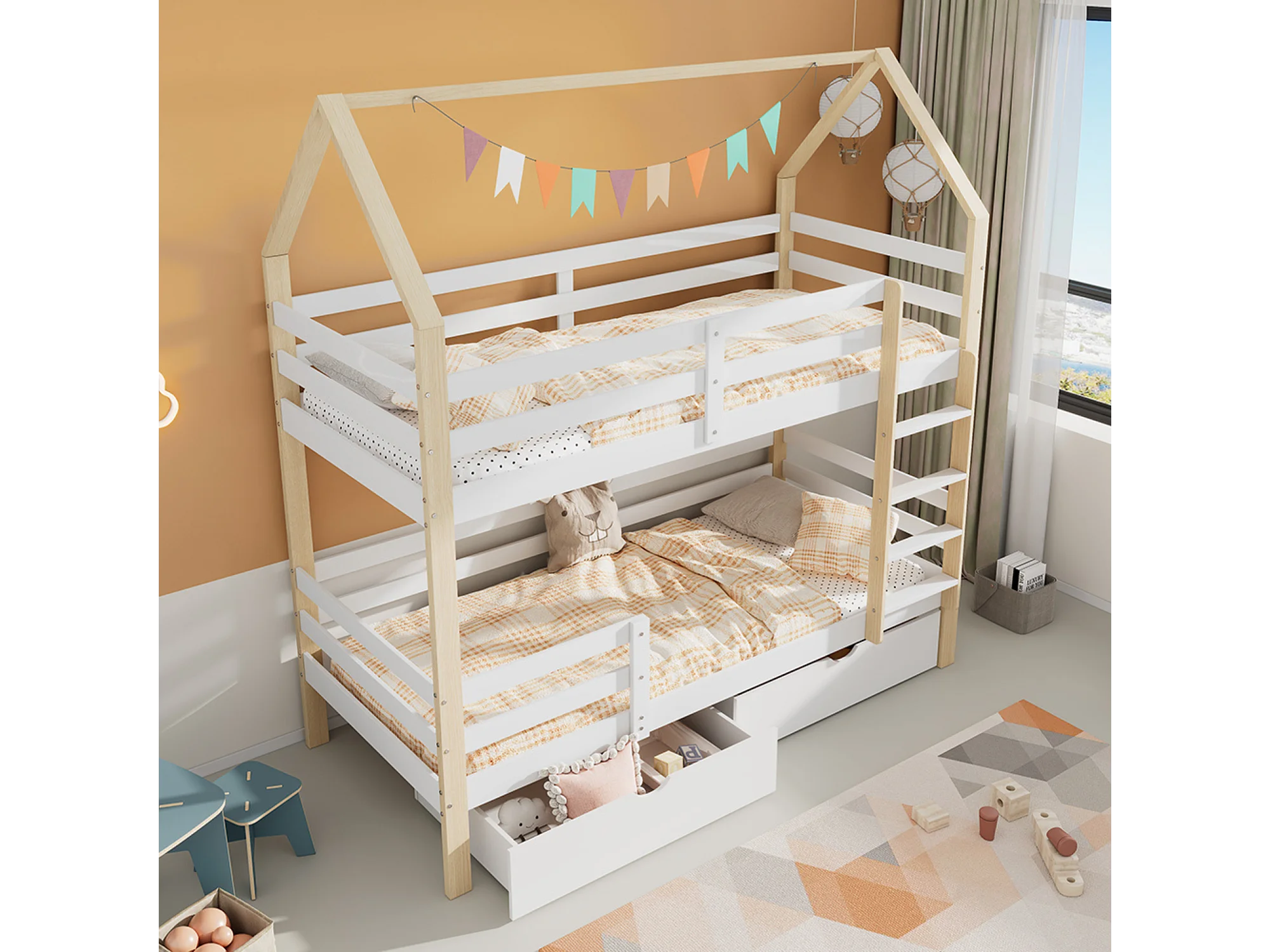 Lit superposés pour enfant - avec 2 tiroirs - en forme de maisonnette - bois - blanc + naturel