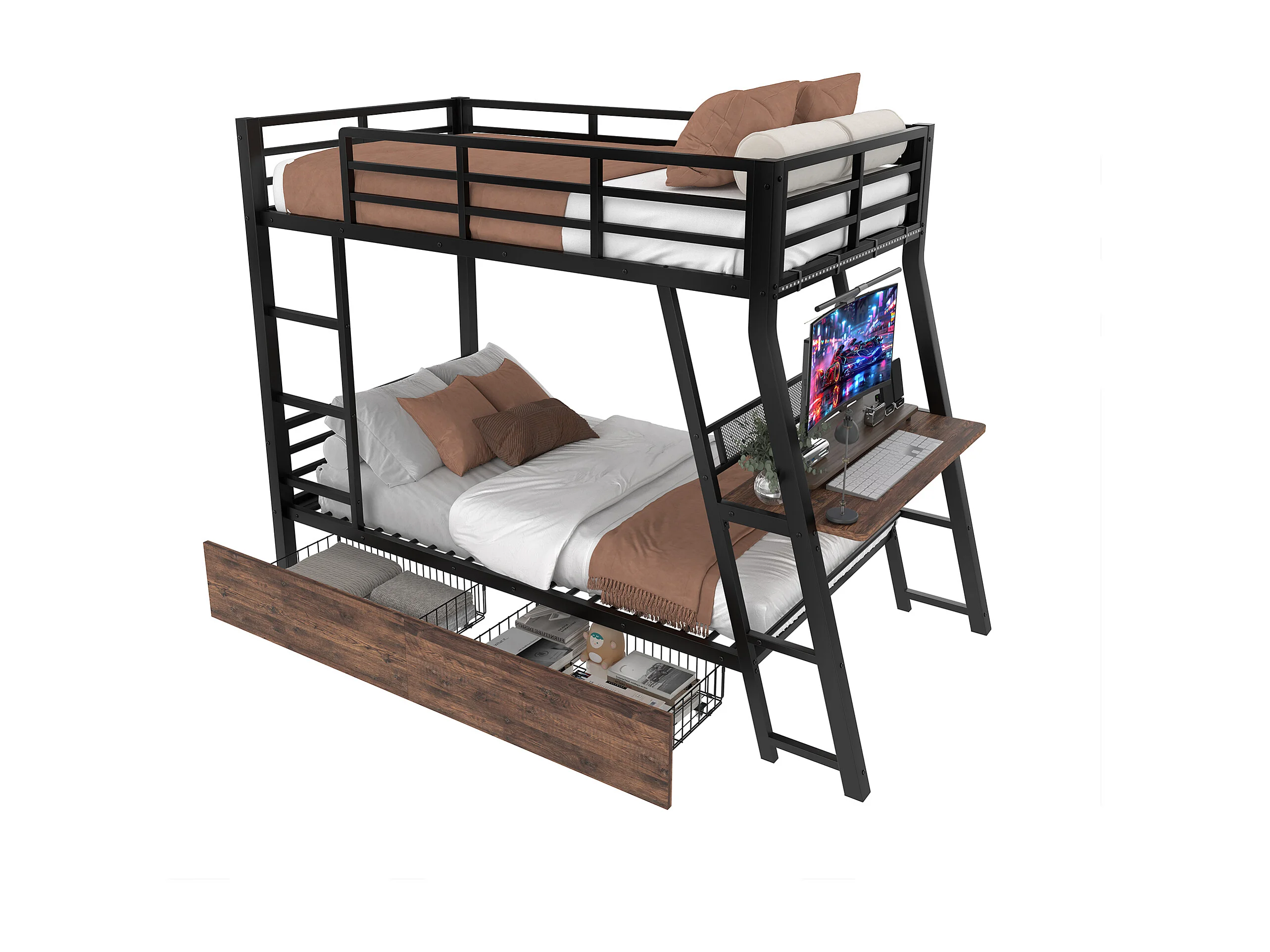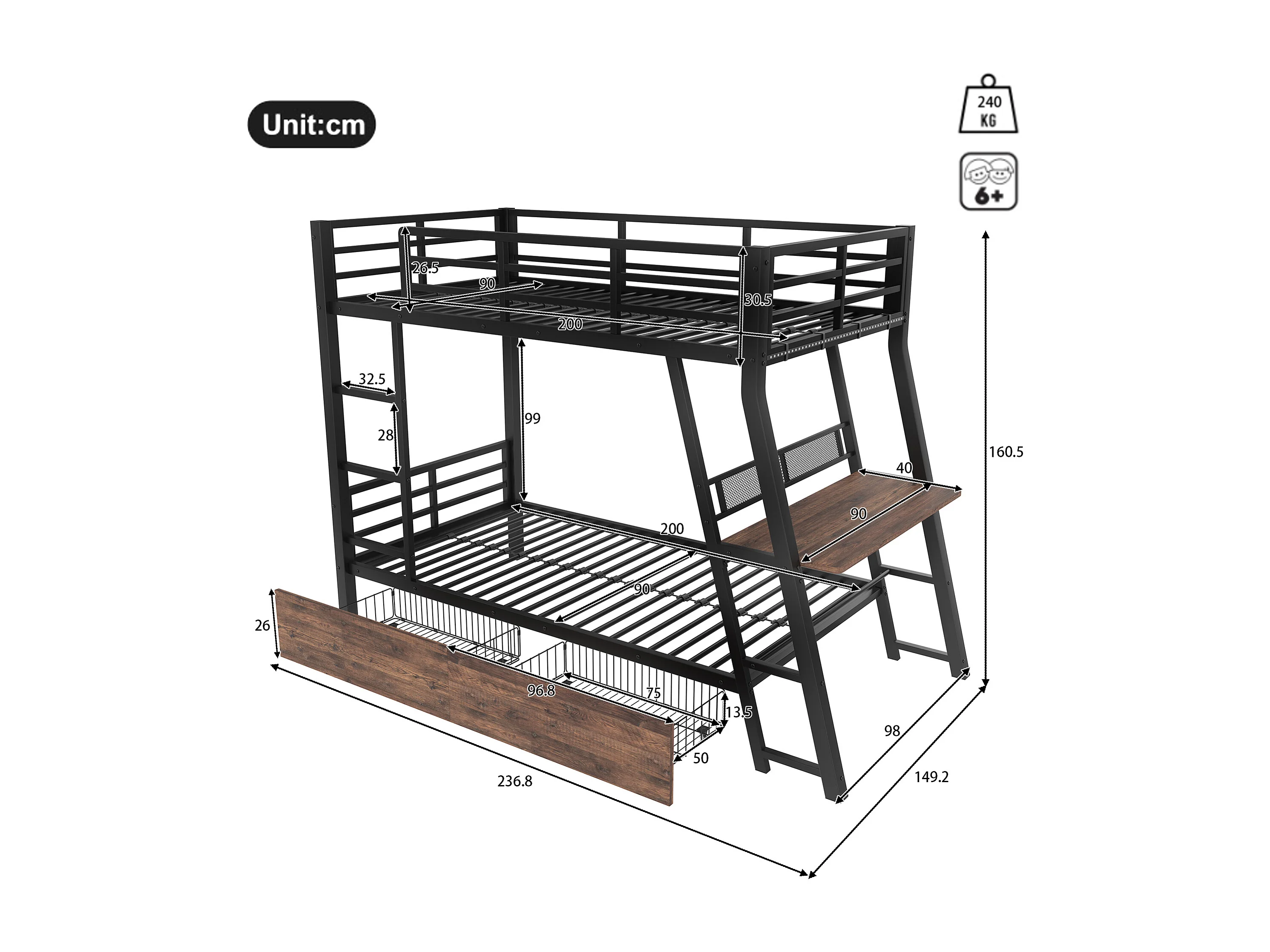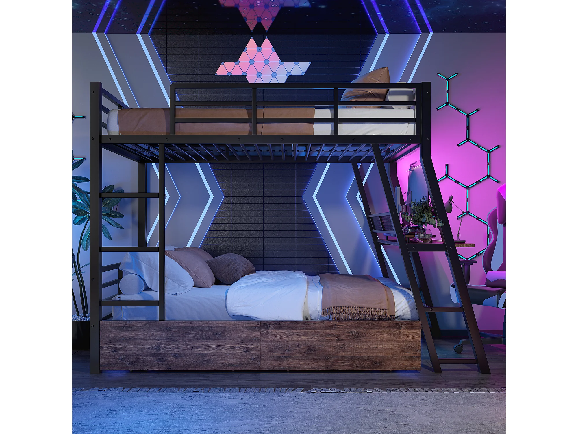 Lit superposés pour enfants - 90 x 200 cm - structure en fer - avec Leds + 2 tiroirs + bureau - Métal + MDF - noir