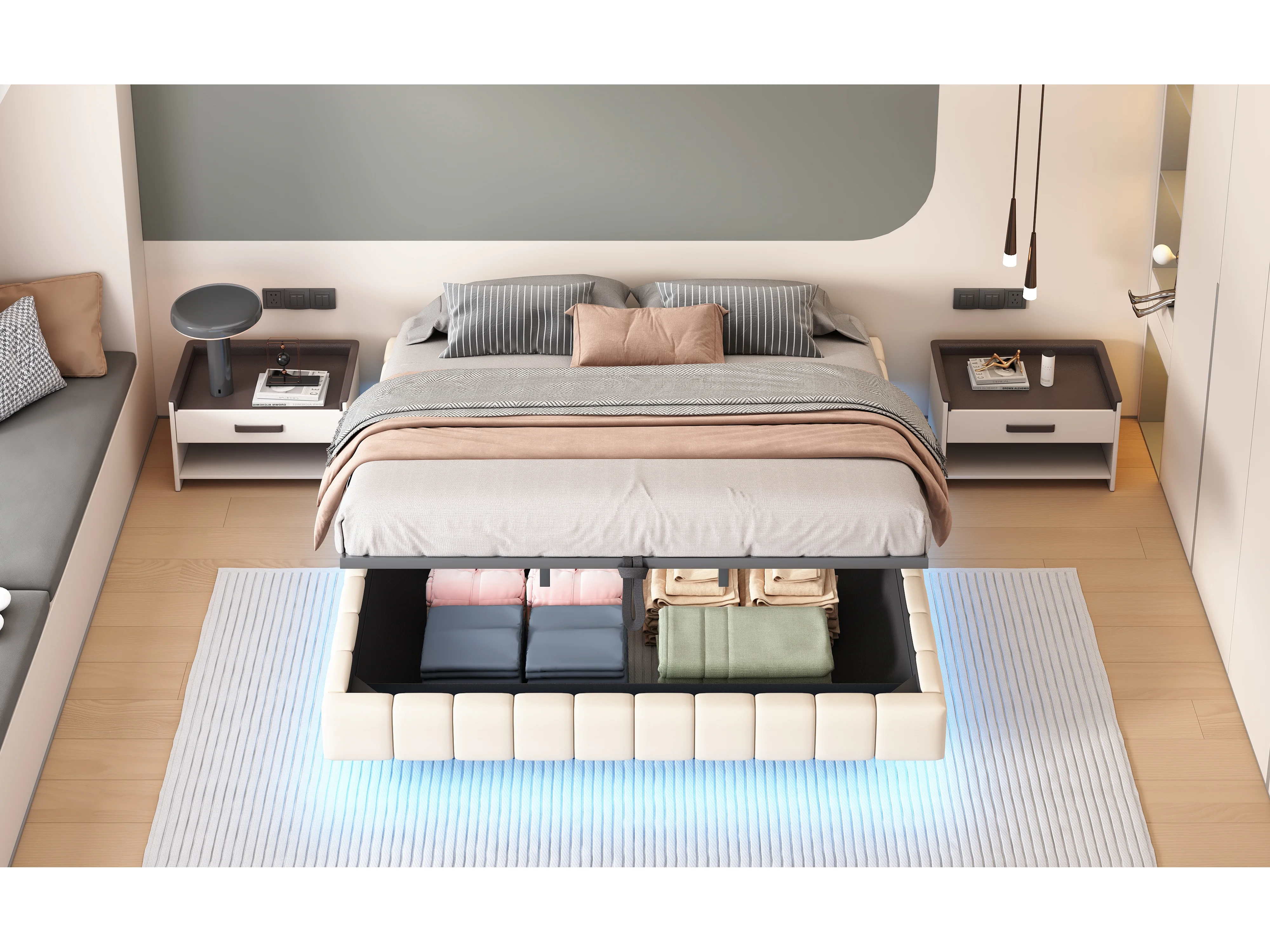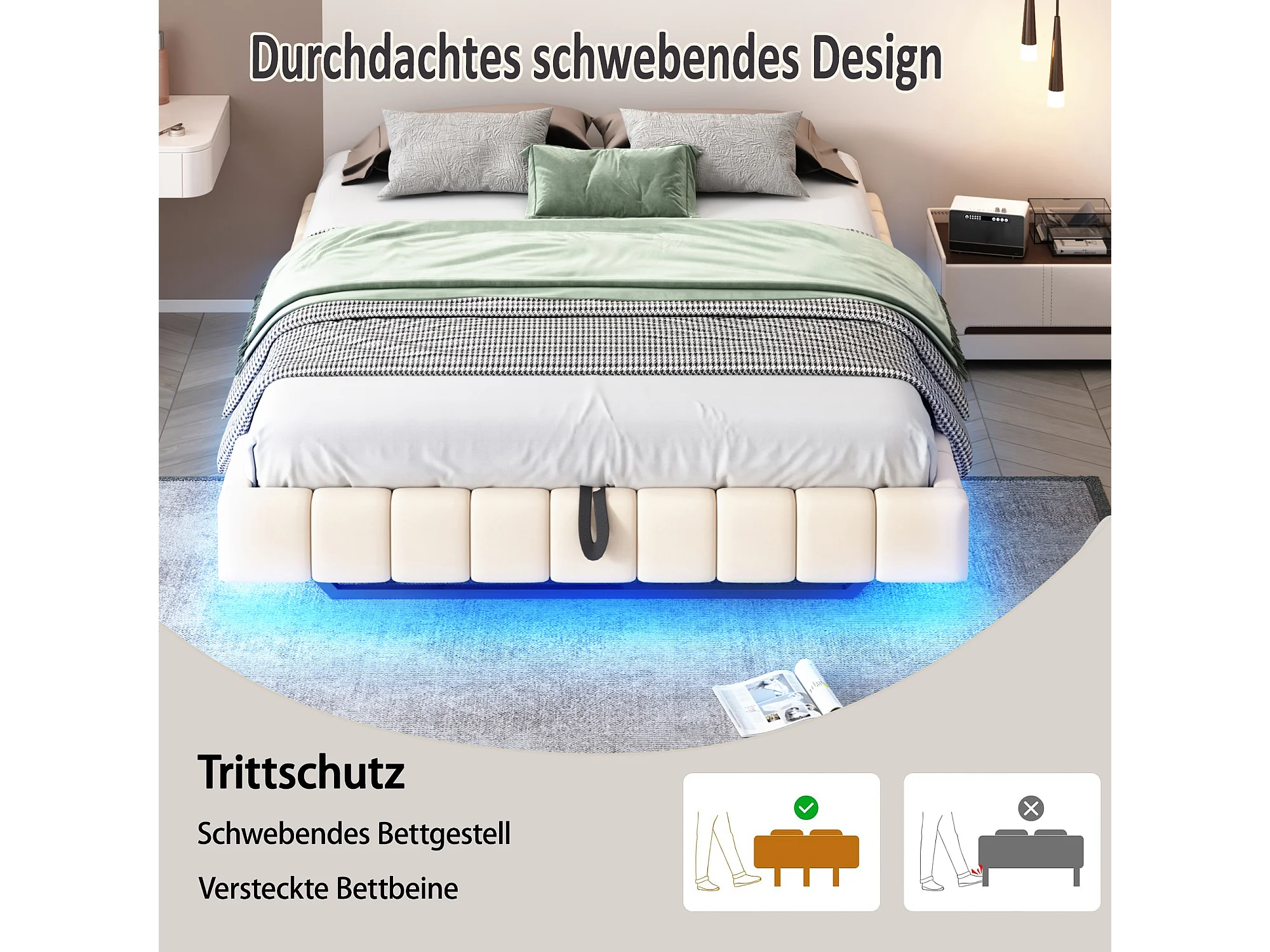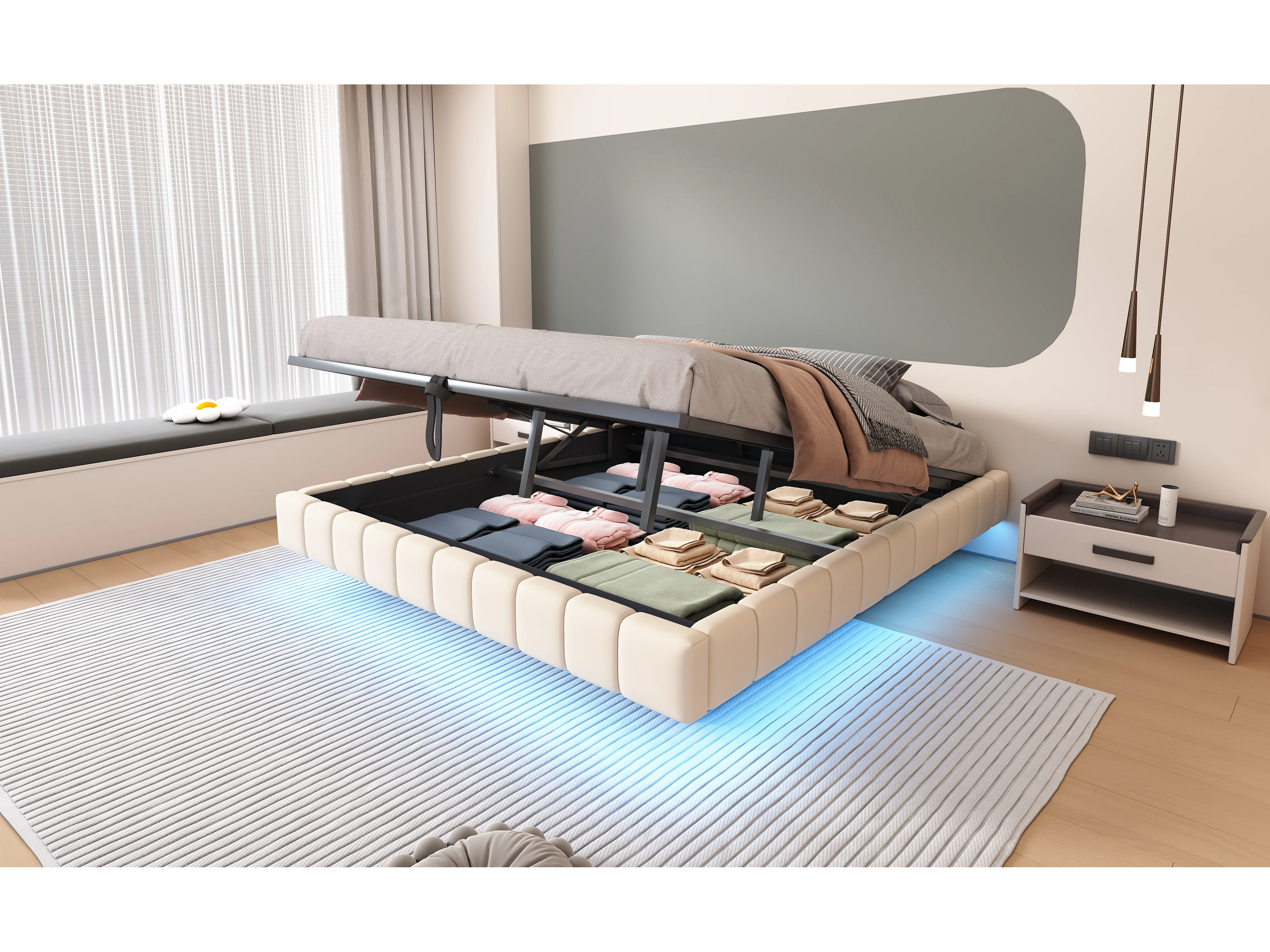 Lit suspendu 180x200 cm avec cadre flottant, rangement hydraulique, sans tête de lit, avec éclairage LED, lin beige (201x181x31 cm)