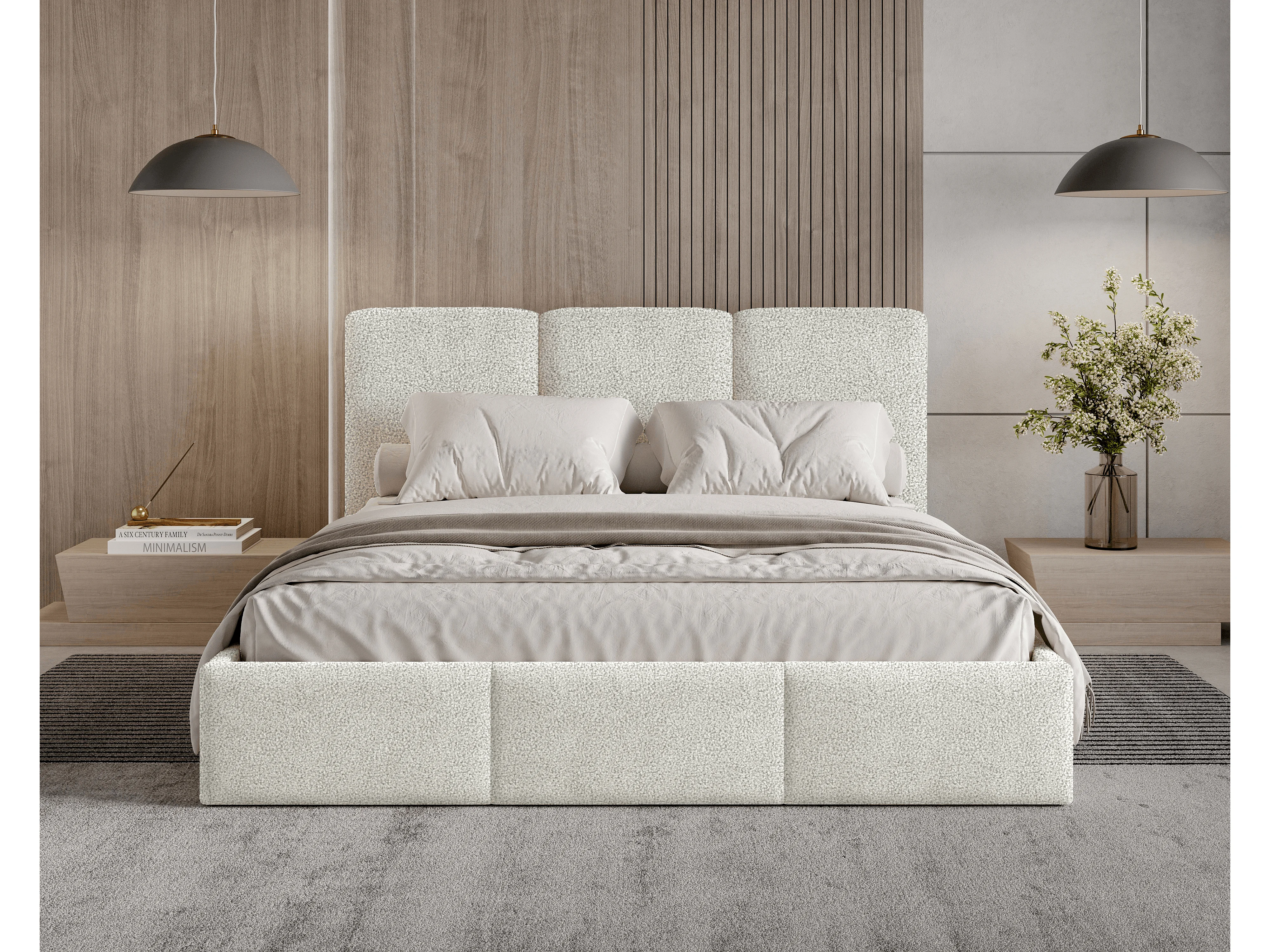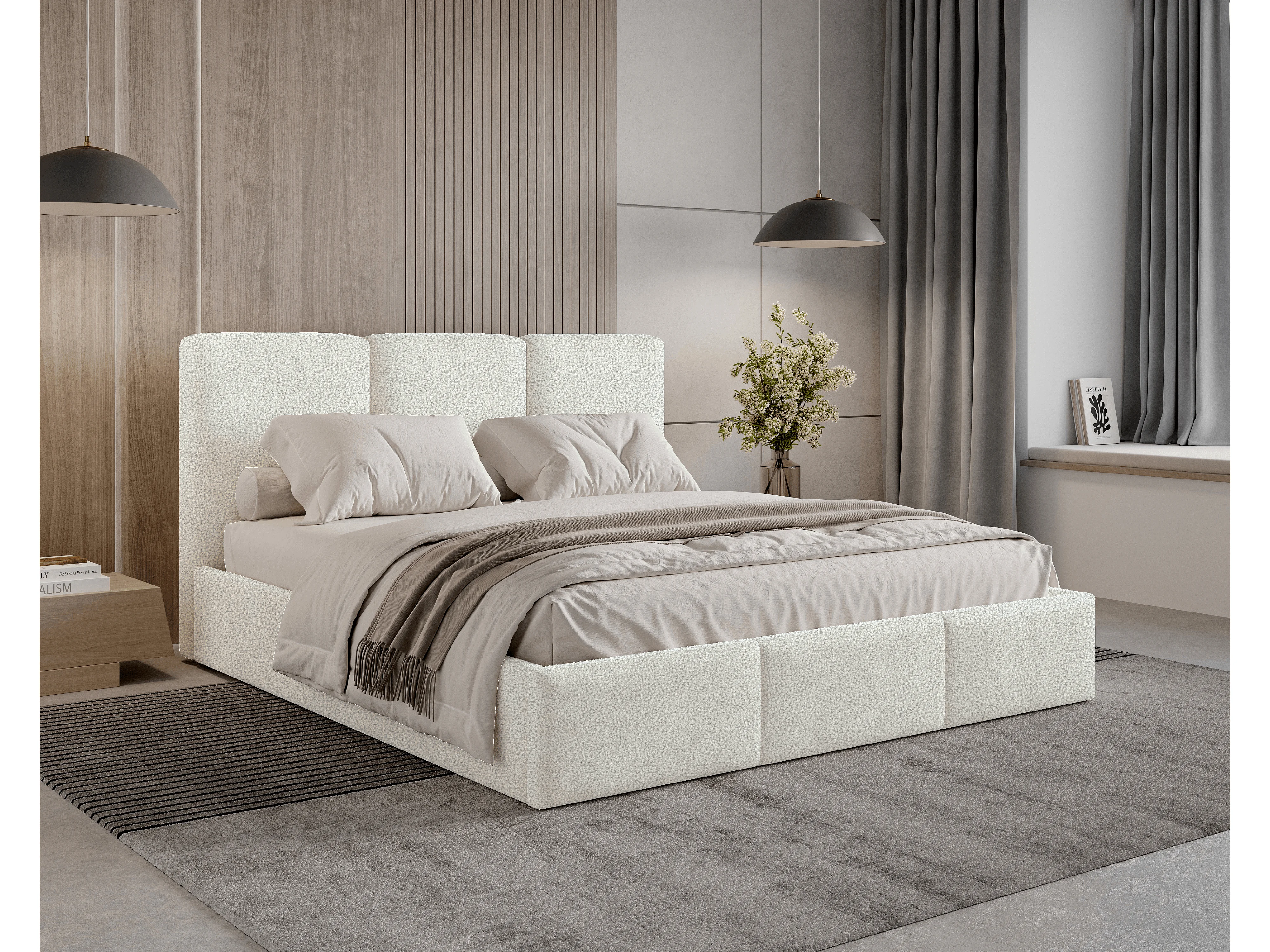 Lit tapissé 120x200 Elora bouclé – lit avec coffre de rangement et sommier, lit coffre moderne, lit chambre, tissu bouclé tendance – Crème