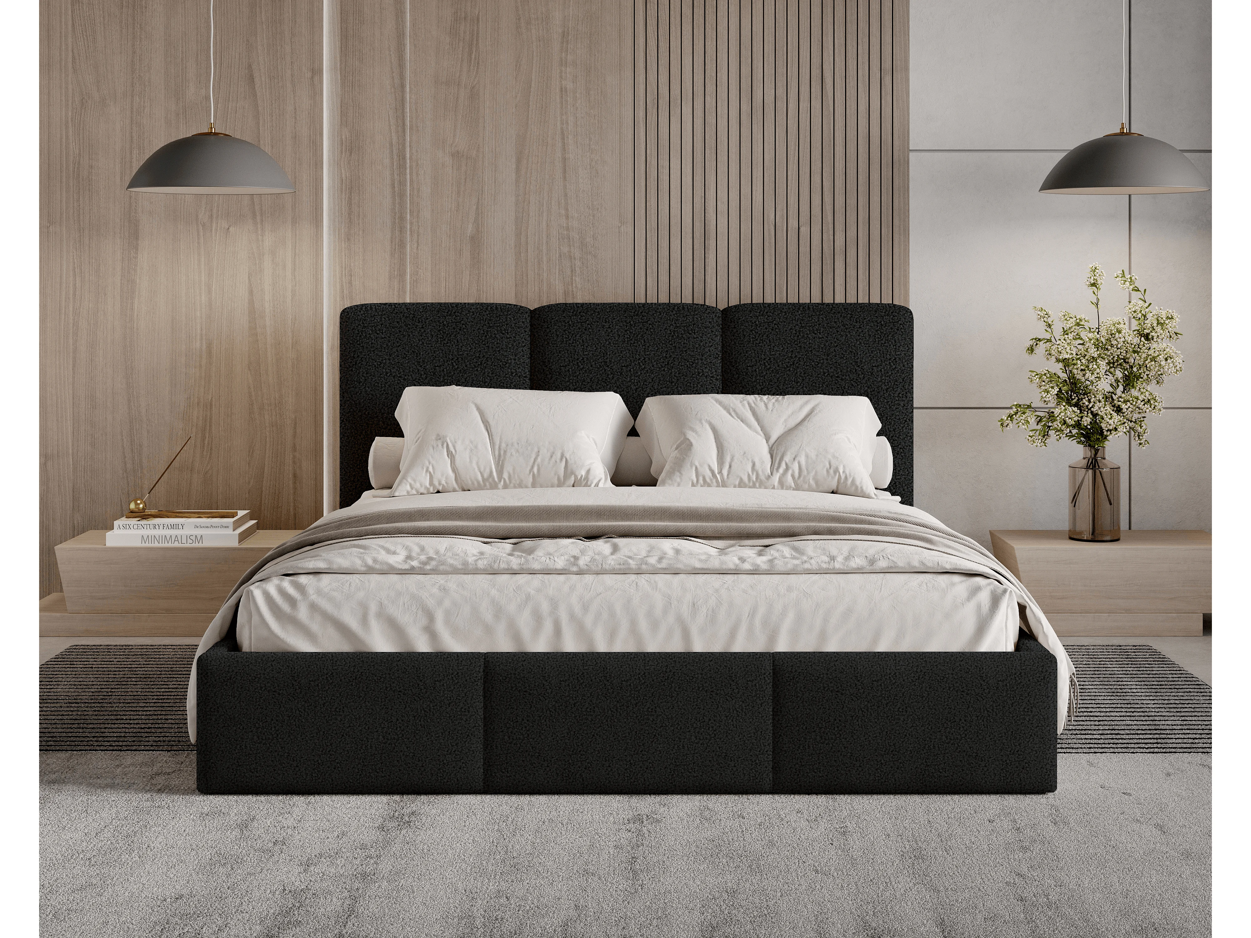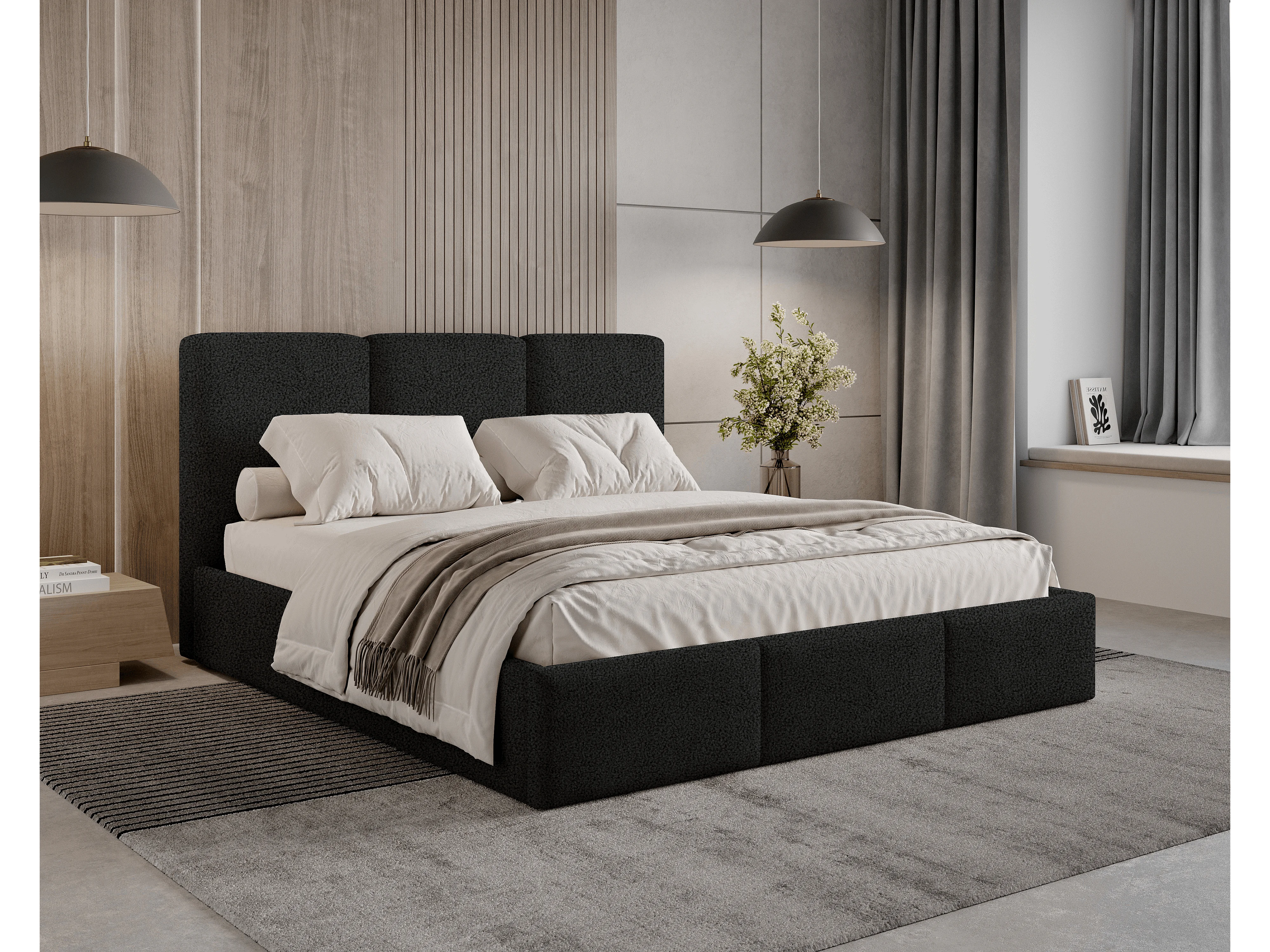 Lit tapissé 160x200 Elora bouclé – lit avec coffre de rangement et sommier, lit coffre moderne, lit chambre, tissu bouclé tendance – Noir