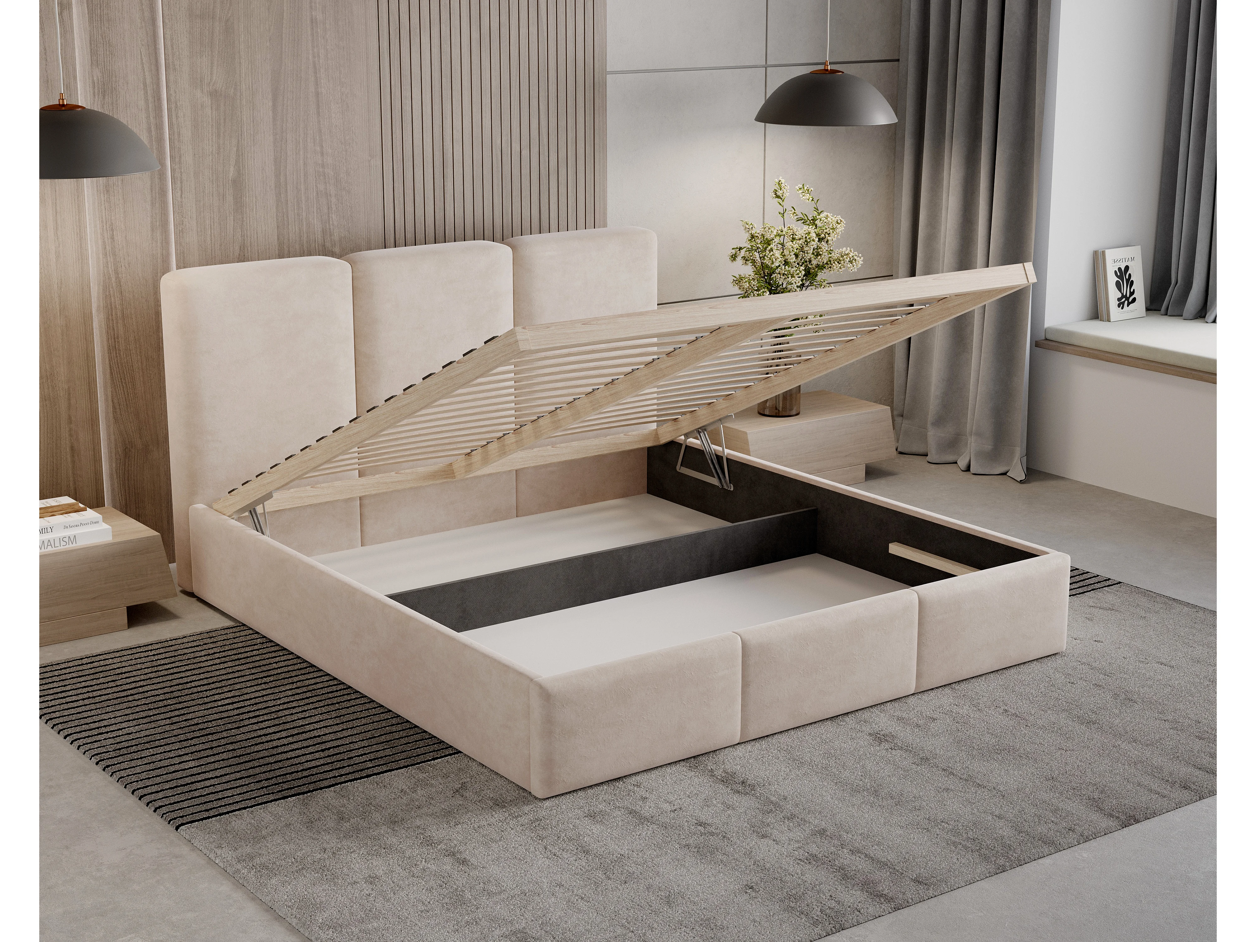 Lit tapissé 180x200 Elora bouclé – lit avec coffre de rangement et sommier, lit coffre moderne, lit chambre, tissu bouclé tendance – Noir