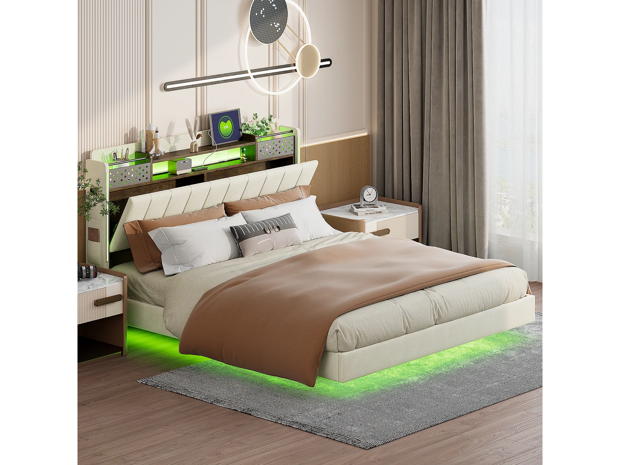Lit tapissier avec LED, prise USB, rangement tête de lit, lin beige, design flottant (222.5x165.5x111 cm)