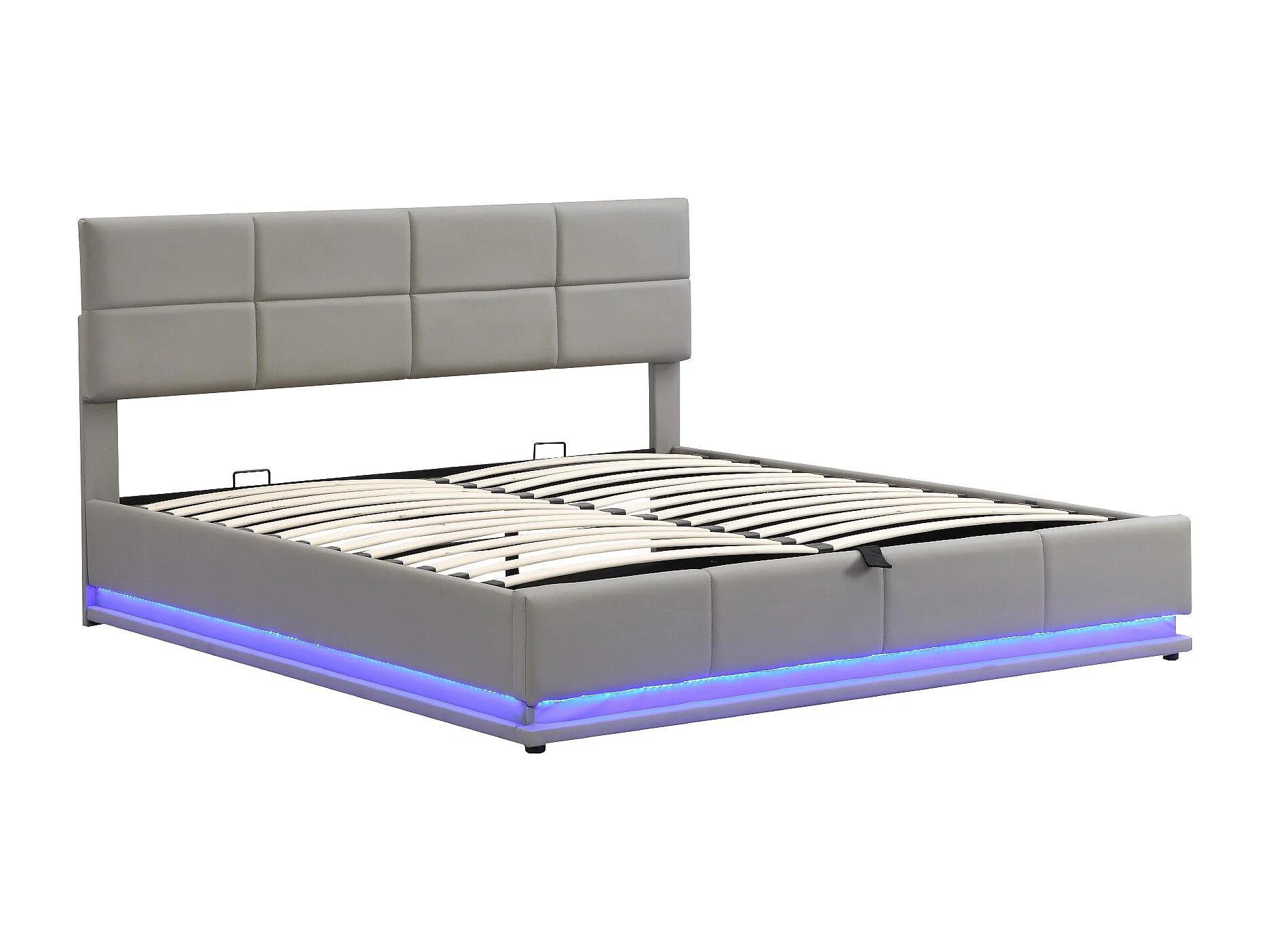 Lit tapissier avec LED, rangement hydraulique, simili cuir gris clair, design moderne (200x181x91 cm)