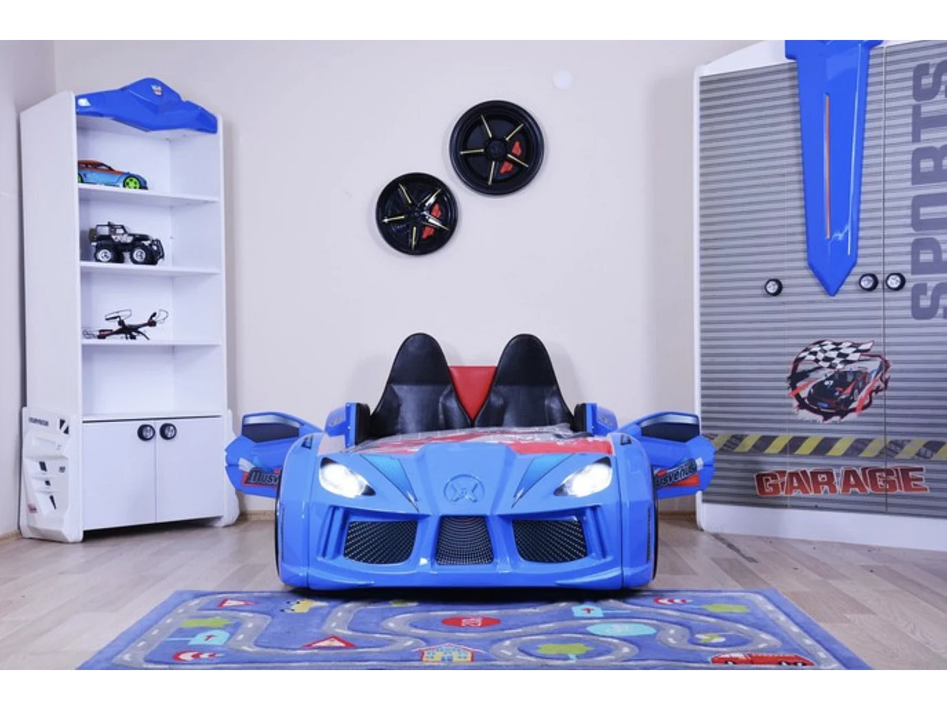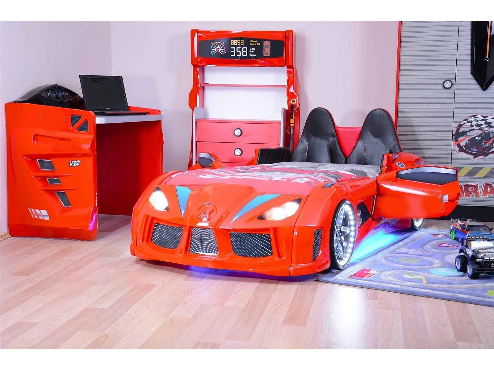 Lit voiture de sport COMPETITION à LED et effets sonores – 90x190-Rouge