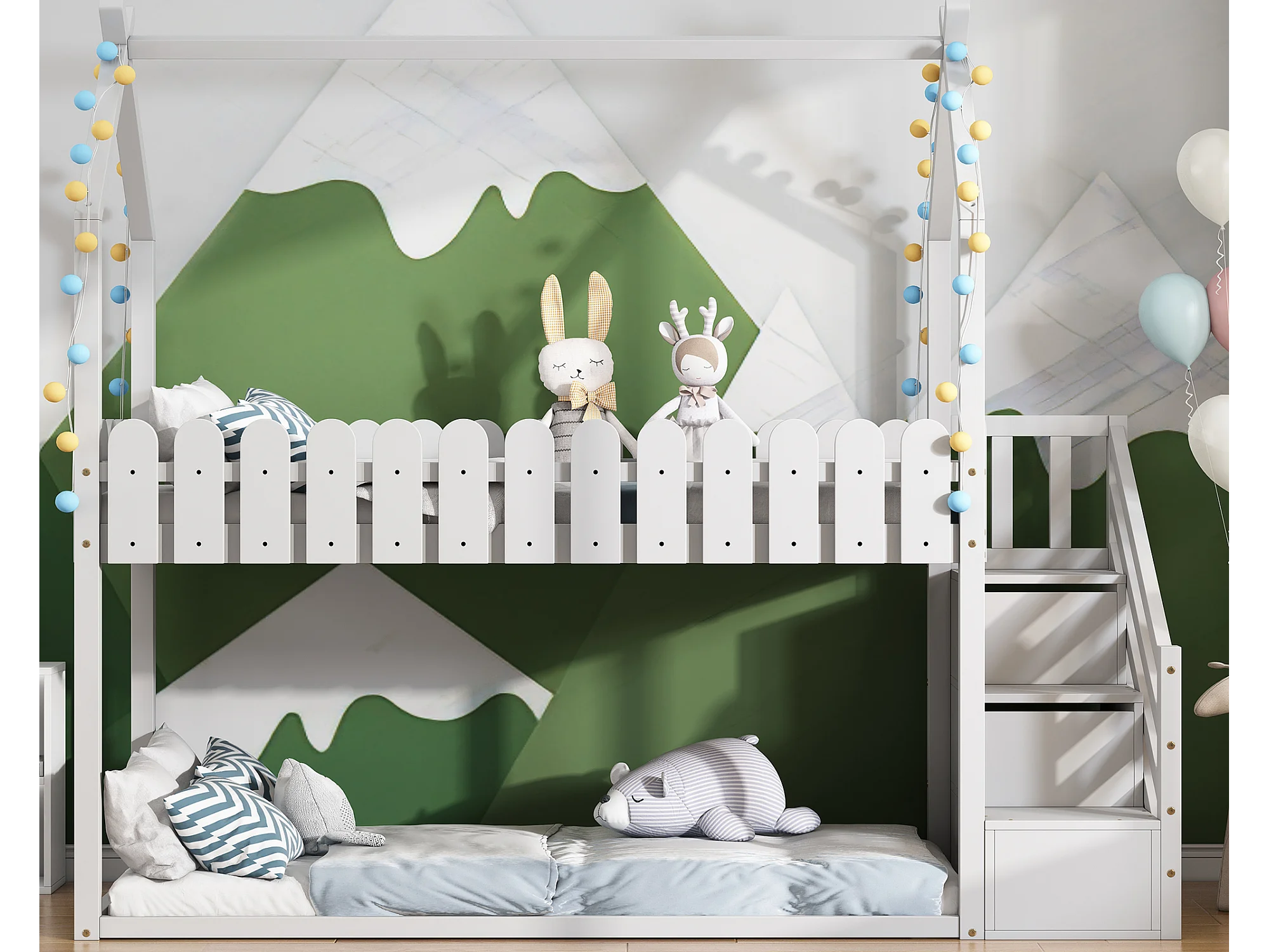 Lits superposés 2 couchages 90 x 200 cm avec 2 tiroirs, barrières de sécurité et sommier à lattes, blanc